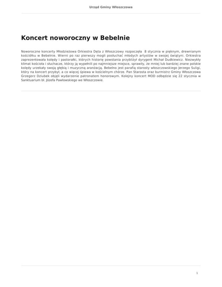 Urząd Gminy Włoszczowa Koncert noworoczny w Bebelnie Noworoczne koncerty Młodzieżowa Orkiestra Dęta z Włoszczowy rozpoczęła 8 stycznia w pięknym, drewnianym kościółku w Bebelnie. Wierni po raz pierwszy mogli posłuchać młodych artystów w swojej świątyni. Orkiestra zaprezentowała kolędy i pastorałki, których historię powstania przybliżył dyrygent Michał Dudkiewicz. Niezwykły klimat kościoła i słuchacze, którzy ją wypełnili po najmniejsze miejsce, sprawiły, że mniej lub bardziej znane polskie kolędy urzekały swoją głębią i muzyczną aranżacją. Bebelno jest parafią starosty włoszczowskiego Jerzego Suligi, który na koncert przybył, a co więcej śpiewa w kościelnym chórze. Pan Starosta oraz burmistrz Gminy Włoszczowa Grzegorz Dziubek objęli wydarzenie patronatem honorowym. Kolejny koncert MOD odbędzie się 22 stycznia w Sanktuarium bł. Józefa Pawłowskiego we Włoszczowie. 1