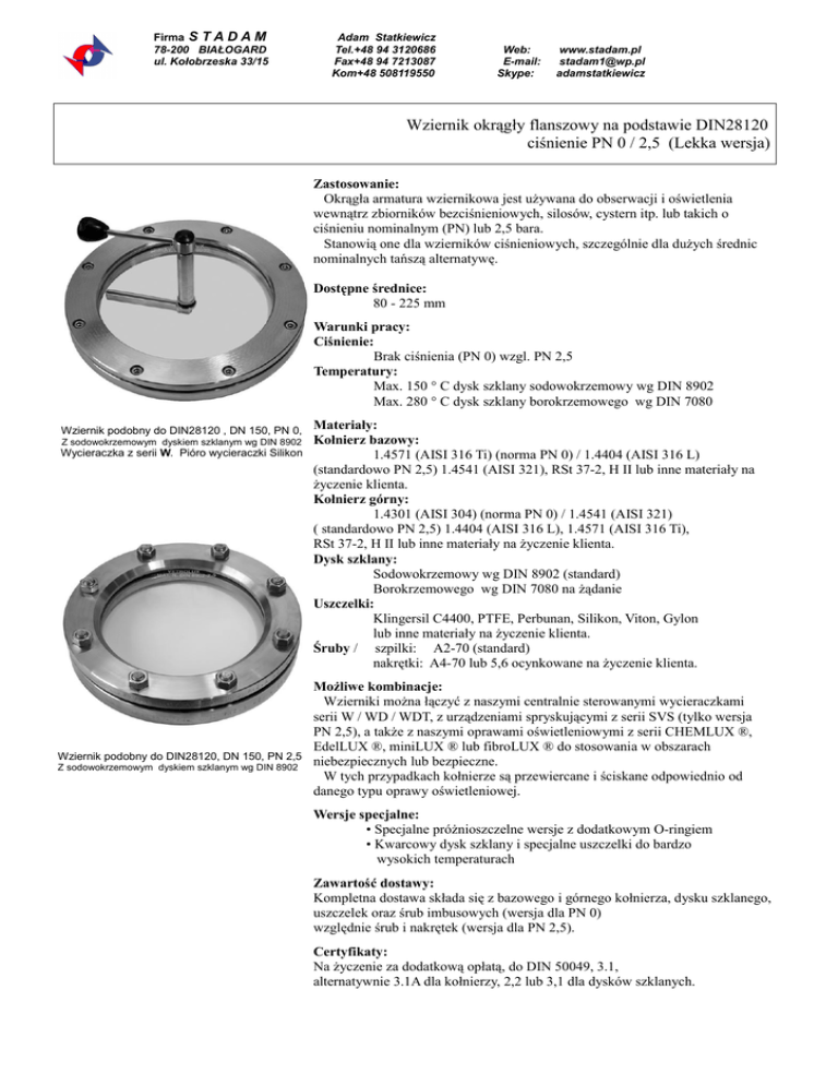 Firma S T A D A M 78-200 BIAŁOGARD ul. Kołobrzeska 33/15 Adam Statkiewicz Tel.+48 94 3120686 Fax+48 94 7213087 Kom+48 508119550 Web: E-mail: Skype: www.stadam.pl [email protected] adamstatkiewicz Wziernik okrągły flanszowy na podstawie DIN28120 ciśnienie PN 0 / 2,5 (Lekka wersja) Zastosowanie: Okrągła armatura wziernikowa jest używana do obserwacji i oświetlenia wewnątrz zbiorników bezciśnieniowych, silosów, cystern itp. lub takich o ciśnieniu nominalnym (PN) lub 2,5 bara. Stanowią one dla wzierników ciśnieniowych, szczególnie dla dużych średnic nominalnych tańszą alternatywę. Dostępne średnice: 80 - 225 mm Warunki pracy: Ciśnienie: Brak ciśnienia (PN 0) wzgl. PN 2,5 Temperatury: Max. 150 ° C dysk szklany sodowokrzemowy wg DIN 8902 Max. 280 ° C dysk szklany borokrzemowego wg DIN 7080 Wziernik podobny do DIN28120 , DN 150, PN 0, Z sodowokrzemowym dyskiem szklanym wg DIN 8902 Wycieraczka z serii W. Pióro wycieraczki Silikon Wziernik podobny do DIN28120, DN 150, PN 2,5 Z sodowokrzemowym dyskiem szklanym wg DIN 8902 Materiały: Kołnierz bazowy: 1.4571 (AISI 316 Ti) (norma PN 0) / 1.4404 (AISI 316 L) (standardowo PN 2,5) 1.4541 (AISI 321), RSt 37-2, H II lub inne materiały na życzenie klienta. Kołnierz górny: 1.4301 (AISI 304) (norma PN 0) / 1.4541 (AISI 321) ( standardowo PN 2,5) 1.4404 (AISI 316 L), 1.4571 (AISI 316 Ti), RSt 37-2, H II lub inne materiały na życzenie klienta. Dysk szklany: Sodowokrzemowy wg DIN 8902 (standard) Borokrzemowego wg DIN 7080 na żądanie Uszczelki: Klingersil C4400, PTFE, Perbunan, Silikon, Viton, Gylon lub inne materiały na życzenie klienta. Śruby / szpilki: A2-70 (standard) nakrętki: A4-70 lub 5,6 ocynkowane na życzenie klienta. Możliwe kombinacje: Wzierniki można łączyć z naszymi centralnie sterowanymi wycieraczkami serii W / WD / WDT, z urządzeniami spryskującymi z serii SVS (tylko wersja PN 2,5), a także z naszymi oprawami oświetleniowymi z serii CHEMLUX ®, EdelLUX ®, miniLUX ® lub fibroLUX ® do stosowania w obszarach niebezpiecznych lub bezpieczne. W tych przypadkach kołnierze są przewiercane i ściskane odpowiednio od danego typu oprawy oświetleniowej. Wersje specjalne: • Specjalne próżnioszczelne wersje z dodatkowym O-ringiem • Kwarcowy dysk szklany i specjalne uszczelki do bardzo wysokich temperaturach Zawartość dostawy: Kompletna dostawa składa się z bazowego i górnego kołnierza, dysku szklanego, uszczelek oraz śrub imbusowych (wersja dla PN 0) względnie śrub i nakrętek (wersja dla PN 2,5). Certyfikaty: Na życzenie za dodatkową opłatą, do DIN 50049, 3.1, alternatywnie 3.1A dla kołnierzy, 2,2 lub 3,1 dla dysków szklanych. Firma S T A D A M 78-200 BIAŁOGARD ul. Kołobrzeska 33/15 Adam Statkiewicz Tel.+48 94 3120686 Fax+48 94 7213087 Kom+48 508119550 Web: E-mail: Skype: www.stadam.pl [email protected] adamstatkiewicz Wziernik okrągły flanszowy na podstawie DIN28120 ciśnienie PN 0 / 2,5 (Lekka wersja) Wersja bezciśnieniowa (PN0) NW d1 d3 s d7 D k h1 h2 Nº 50 80 100 10 102 140 120 10 15 4xM6 80 100 125 10 127 165 145 10 15 8xM6 100 125 150 10 152 190 170 10 15 8xM6 125 150 175 10 177 215 195 10 15 8xM6 150 175 200 10 202 240 220 10 15 8xM6 200 225 250 10 252 290 270 10 15 8xM6 NW d1 d3 s d7 D k h1 h2 Nº 50 80 100 10 102 140 120 10 15 4xM12 80 100 125 10 127 165 145 10 15 4xM12 100 125 150 10 152 190 170 10 15 4xM12 125 150 175 10 177 215 195 10 15 8xM12 150 175 200 10 202 240 220 10 15 8xM12 200 225 250 10 252 290 270 10 15 8xM12 Wersja na PN2,5 Montaż: Do prawidłowo przyspawanego kołnierza bazowego na lub w ścianie zbiornika, umieszczamy uszczelkę dolną, dysk szklany, uszczelkę górną oraz kołnierz górny, a następnie śrubami imbusowymi należy dokręcić do kołnierza bazowego (wersja dla PN 0) odpowiednio nakrętkami do śrub (wersja dla PN 2,5). Uwaga: Aby uniknąć pęknięcia dysku szklanego kołnierz bazowy musi być wspawany na lub do ściany zbiornika bez żadnych zniekształceń aby zapewnić gładkie i płaskie przyleganie powierzchni. Jeśli to konieczne niezbędne jest przeszlifowanie powierzchni po spawaniu. Śruby należy dokręcać równomiernie i na krzyż.