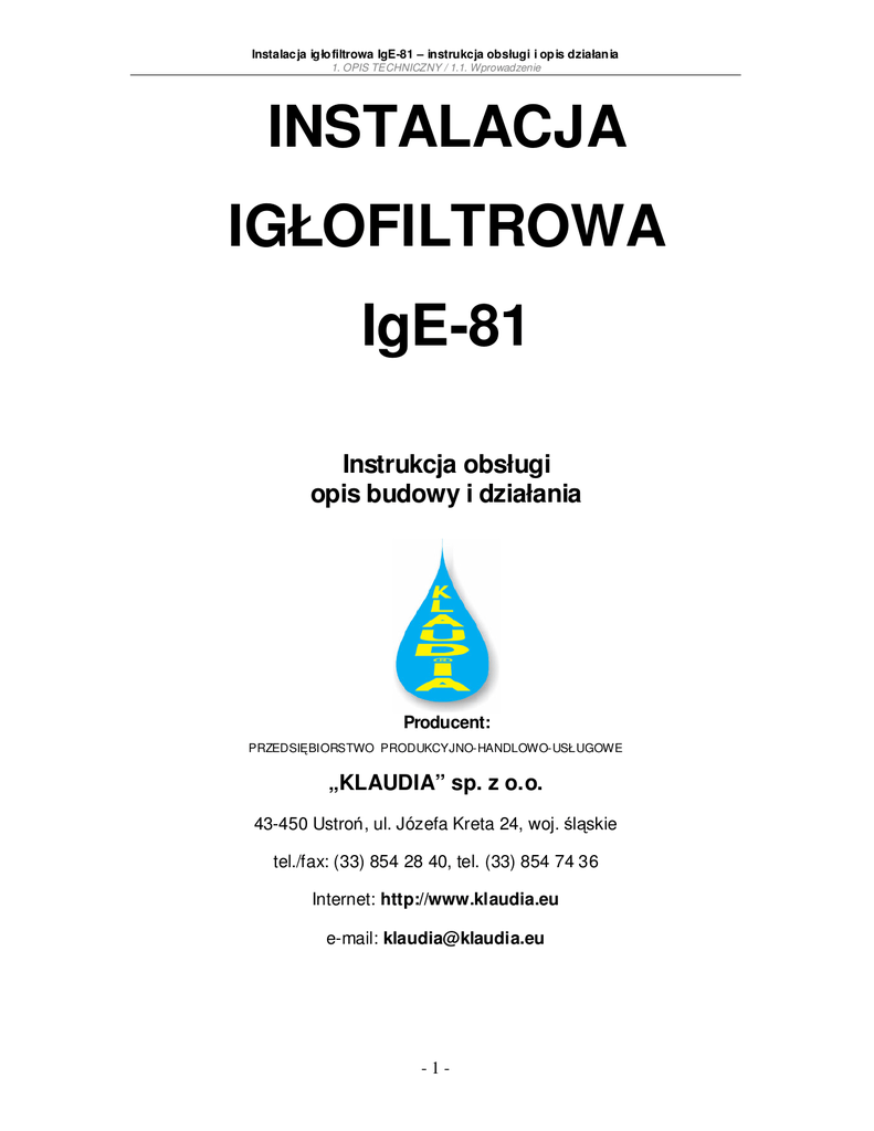 Instalacja ig ło filtrowa IgE-81 – instrukcja obsługi i op is działan ia 1. OPIS TECHNICZNY / 1.1. Wprowadzenie INSTALACJA IGŁOFILTROWA IgE-81 Instrukcja obsługi opis budowy i działania Producent: PRZEDSIĘBIORSTWO PRODUKCYJNO-HANDLOWO-USŁUGOWE „KLAUDIA” sp. z o.o. 43-450 Ustroń, ul. Józefa Kreta 24, woj. śląskie tel./fax: (33) 854 28 40, tel. (33) 854 74 36 Internet: http://www.klaudia.eu e-mail: [email protected] -1- Instalacja ig ło filtrowa IgE-81 – instrukcja obsługi i op is działan ia 1. OPIS TECHNICZNY / 1.1. Wprowadzenie 1. OPIS TECHNICZNY 1.1. Wprowadzenie Instalacje igłofiltrowe znajdują szerokie zastosowanie i uznanie w wykonawstwie odwodnień wykopów budowlanych. Wynika to z potrzeb dyktowanych warunkami hydrogeologicznymi terenu oraz wartości użytkowych tego typu ujęć odwodnieniowych. Instalacje igłofiltrowe przystosowane są do odwadniania gruntów drobnoziarnistych, trudno oddających wodę. Charakteryzują się gęsto rozstawionymi ujęciami o niewielkim przekroju, łączonymi równolegle za pośrednictwem kolektora z agregatem pompowym Igłofiltry to ujęcia podciśnieniowe. Praca w reżimie podciśnienia stawia przed instalacją igłofiltrową warunek maksymalnej szczelności, a przed agregatami pompowymi wymagania zdolności wytwarzania dużego podciśnienia i odbioru znacznych ilości powietrza dostającego się z gruntu przez filtry ujęć. Instalacja IgE-81 jest przedmiotowym rozwiązaniem do prowadzenia odwadniania opracowanym przez polskich naukowców. Z uwagi na swoje walory techniczne i eksploatacyjne stanowi ona czołową pozycję wśród innych stosowanych rozwiązań w krajowym wykonawstwie. 1.2. Przeznaczenie i zakres stosowania Instalacje igłofiltrowe IgE-81 przeznaczone są do odwadniania wykopów budowlanych w gruntach o małej i średniej przepuszczalności (współczynnik przepuszczalności k <40m/dobę). Stosować ją można jako instalację samodzielną lub uzupełniającą inne rodzaje ujęć odwodnieniowych w układach jedno lub dwupiętrowych. Jedno piętro igłofiltrów umożliwia obniżenie poziomu wody gruntowej do 4 m a dwa piętra do 7 m. Igłofiltry IgE-81 przystosowane są do pracy bez obsypki; stosowanie osypki przewiduje się jedynie w gruntach przewarstwionych lub zapylonych W zależności od warunków dopływu wody gruntowej, wielkości wykopu oraz posiadanego sprzętu pompowego ilość igłofiltrów podłączonych do odpowiedniego agregatu pompowego waha się w granicach 5 - 150 sztuk. Najczęściej stosowane instalacje oparte są o 50-100 igłofiltrów. Głównym czynnikiem limitującym ilość igłofiltrów podłączonych do jednego agregatu pompowego są ilości powietrza i wody dostającej się do instalacji przez filtry ujęć, które muszą być doprowadzone przez agregat Agregaty pompowe o małej zdolności poboru powietrza można stosować zastępczo, ograniczając ilość podłączonych do nich igłofiltrów. 1.3. Charakterystyka instalacji igłofiltrowej lgE-81 Instalacja igłofiltrowa IgE-81 w porównaniu do tradycyjnych konstrukcji charakteryzuje się następującymi cechami: zmniejszonym nakładem pracy przy montażu jak i demontażu instalacji -2- Instalacja ig ło filtrowa IgE-81 – instrukcja obsługi i op is działan ia 1. OPIS TECHNICZNY / 1.4. Opis budowy i podstawo we dane (połączenia igłofiltrów z kolektorem oraz poszczególnych elementów kolektora są proste, szybkie i szczelne), ułatwionym transportem i zmniejszoną jego pracochłonnością (lekki materiał igłofiltrów i kolektorów oraz zmniejszoną ilość części składowych), dużą trwałością igłofiltrów pozwalającą na wielokrotne ich stosowanie (materiał igłofiltrów jest odporny na korozję i niskie temperatury, a prosta konstrukcja filtru właściwego ułatwia jego czyszczenie), dwoma rodzajami rur obsadowych o dwu długościach wchodzących w skład kompletu ułatwiającymi instalowanie igłofiltrów w różnych warunkach gruntowych i na dowolnych głębokościach Wersje instalacji IgE 81/32 oraz IgE 81/63 Instalacje igłofiltrowe dostępne są w dwóch wersjach: IgE 81/32 oraz IgE 81/63. Wersje te różnią się pomiędzy sobą przede wszystkim stosowanymi igłofiltrami. Najczęściej stosowana wersja IGE 81/32 oparta jest o igłofiltry elastyczne o średnicy 32 mm. W przypadku wersji IGE 81/63 zastosowanie znajdują igłofiltry o średnicy 63. Zastosowanie tej wersji umożliwia bardziej intensywne odwadnianie. W porównaniu do wersji IGE 81/32 dodatkowo dla każdego igłofiltra do jego połączenia z kolektorem ssącym wymagany jest łącznik elastyczny z uszczelkami. Inny jest także kolektor ssący i zaślepki do zamykania króćców kolektora. 1.4. Opis budowy i podstawowe dane Wszystkie elementy metalowe instalacji wykonane są z aluminium. Króciec kołnierzowy (poz. 1 wykazu) zakończony jest z jednej strony kołnierzem a z drugiej końcówką z kształtką wewnętrzną (typ V – końcówka męska) 133. Króciec jest elementem służącym do szybkiego połączenia agregatu pompowego z kolektorem ssącym instalacji igłofiltrowej i kolektorem zrzutowym. Powinien on być na stałe przykręcony (z uszczelką gumową) do króćca ssącego i zrzutowego agregatu. Rozdzielacz z kołnierzem (poz. 2) zakończony jest z jednej strony kołnierzem jak króciec (poz. 1), z drugiej posiada dwa wejścia zakończone kształtkami wewnętrznymi 133. Rozdzielacz wykorzystuje się (przykręca z uszczelką gumową do króćca ssącego agregatu pompowego) wówczas, gdy projekt odwodnienia przewiduje stosowanie dwu ciągów kolektora ssącego (instalacji). Łącznik elastyczny (poz. 3) wykonany jest z elastycznego zbrojonego węża PCW D 110 mm, długości około 2,5m i zakończony z jednej strony końcówką z kształtką zewnętrzną 133 (typ M – końcówka żeńska), z drugiej kształtką wewnętrzną 133. Wąż uszczelniony jest na końcówkach wkładkami gumowymi i mocowany opaskami metalowymi. Łącznik służy 