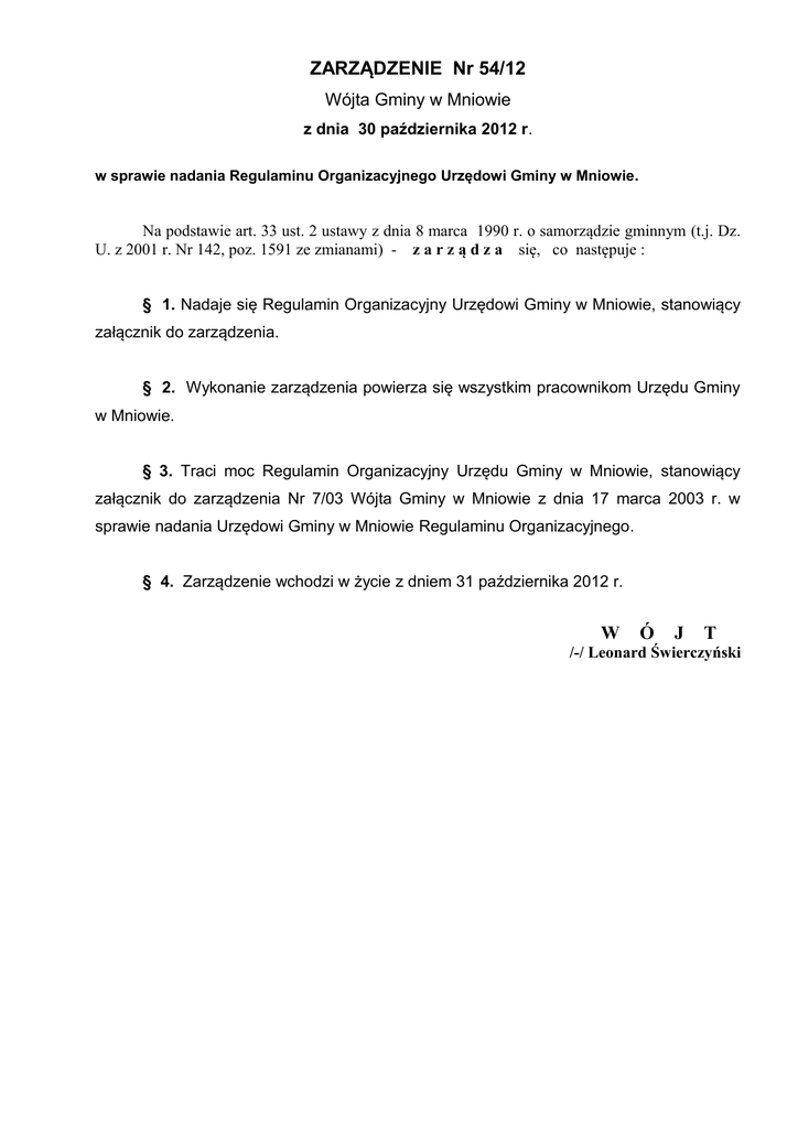 ZARZĄDZENIE Nr 54/12 Wójta Gminy w Mniowie z dnia 30 października 2012 r. w sprawie nadania Regulaminu Organizacyjnego Urzędowi Gminy w Mniowie. Na podstawie art. 33 ust. 2 ustawy z dnia 8 marca 1990 r. o samorządzie gminnym (t.j. Dz. U. z 2001 r. Nr 142, poz. 1591 ze zmianami) - z a r z ą d z a się, co następuje : § 1. Nadaje się Regulamin Organizacyjny Urzędowi Gminy w Mniowie, stanowiący załącznik do zarządzenia. § 2. Wykonanie zarządzenia powierza się wszystkim pracownikom Urzędu Gminy w Mniowie. § 3. Traci moc Regulamin Organizacyjny Urzędu Gminy w Mniowie, stanowiący załącznik do zarządzenia Nr 7/03 Wójta Gminy w Mniowie z dnia 17 marca 2003 r. w sprawie nadania Urzędowi Gminy w Mniowie Regulaminu Organizacyjnego. § 4. Zarządzenie wchodzi w życie z dniem 31 października 2012 r. W Ó J T /-/ Leonard Świerczyński Załącznik do zarządzenia Nr 54/12 Wójta Gminy w Mniowie z dnia 30 października 2012 r. REGULAMIN ORGANIZACYJNY URZĘDU GMINY w MNIOWIE (tekst ujednolicony uwzględniający zmiany wprowadzone zarządzeniem Wójta Gminy w Mniowie Nr 75/12 z dnia 12.12.2012 r., Nr 6/2013 z dnia 14.02.2013 r., Nr 96/2013 z dnia 27.12.2013r., Nr 15/2014 z dnia 26 lutego 2014 r. i Nr 70/2014 z dnia 29 lipca 2014 r.) ROZDZIAŁ I Postanowienia ogólne, zakres działania oraz zasady funkcjonowania Urzędu. § 1. Urząd Gminy w Mniowie jest jednostką organizacyjną, przy pomocy której Wójt Gminy w Mniowie wykonuje swoją pracę jako organ wykonawczy gminy. § 2. Siedzibą Urzędu Gminy jest miejscowość Mniów. § 3. Regulamin Organizacyjny Urzędu Gminy w Mniowie, zwany w dalszej części „Regulaminem”, określa zasady i zakres funkcjonowania Urzędu oraz jego poszczególnych komórek organizacyjnych, strukturę organizacyjną urzędu, a także inne postanowienia związane z realizacją zadań gminy, wynikające z obowiązującego prawa. § 4. Ilekroć w Regulaminie jest mowa o: Gminie – należy przez to rozumieć gminę Mniów, Radzie – należy przez to rozumieć Radę Gminy w Mniowie, Urzędzie – należy przez to rozumieć Urząd Gminy w Mniowie, Wójcie – należy przez to rozumieć Wójta Gminy w Mniowie, Zastępcy Wójta – należy przez to rozumieć Zastępcę Wójta Gminy Mniów, Sekretarzu – należy przez to rozumieć Sekretarza Gminy Mniów, Skarbniku – należy przez to rozumieć Skarbnika Gminy Mniów, Referatach – należy przez to rozumieć wyodrębnione w strukturze Urzędu Referaty oraz inne równorzędne komórki organizacyjne Urzędu, w tym samodzielne stanowiska pracy. 9) Kierownikach Referatów – należy przez to rozumieć Kierowników Referatów i Kierowników innych równorzędnych komórek organizacyjnych Urzędu, 10) Gminnej jednostce organizacyjnej – należy przez to rozumieć jednostkę organizacyjną gminy utworzoną do realizacji zadań Gminy Mniów. 1) 2) 3) 4) 5) 6) 7) 8) § 5. 1. Urząd realizuje zadania: 1) własne wynikające z ustawy z dnia 8 marca 1990 r. o samorządzie gminnym (Dz. U. z 2001 r. Nr 142, poz. 1591 ze zmianami), 2) z zakresu administracji rządowej, których wykonanie zlecono gminie na mocy obowiązujących ustaw, 3) powierzone gminie na podstawie porozumień i umów. 2. Zadania określone w ust. 1 wykonują referaty stosownie do ich wewnętrznych zakresów działania. 2 3. Zadania określone w ust. 1 wykonywane są również przy pomocy kierowników gminnych jednostek organizacyjnych. ROZDZIAŁ II Zasady kierowania pracą Urzędu. § 6. 1. Urzędem kieruje Wójt przy pomocy Zastępcy Wójta, Sekretarza i Skarbnika. 2. Wójt jako Kierownik Urzędu wykonuje uprawnienia zwierzchnika służbowego w stosunku do pracowników Urzędu oraz Kierowników gminnych jednostek organizacyjnych. § 7. 1. Zastępca Wójta działa w ramach upoważnienia udzielonego przez Wójta. Do zakresu jego zadań należy w szczególności zapewnienie sprawnego funkcjonowania Urzędu i organizacja pracy Urzędu. W tym też zakresie nadzoruje pracę referatów i samodzielnych stanowisk pracy. Zastępca Wójta, na podstawie odrębnego upoważnienia wykonuje niektóre czynności z zakresu prawa pracy wobec Wójta, nie zastrzeżone do kompetencji Rady lub przewodniczącego rady gminy. 2. Sekretarz w ramach upoważnienia Wójta wykonuje w jego imieniu zadania, w szczególności z zakresu zapewnienia właściwej organizacji pracy urzędu oraz realizowania polityki zarządzania zasobami ludzkimi. 3. Skarbnik (główny księgowy budżetu) zapewnia prawidłową realizację zadań finansowych, kontrasygnuje czynności prawne mogące spowodować powstanie zobowiązań pieniężnych po stronie Gminy. § 8. 1. Wójt wydaje decyzje w indywidualnych sprawach z zakresu administracji publicznej. 2. Wójt może upoważnić Zastępcę Wójta lub innych pracowników Urzędu do wydawania w jego imieniu decyzji administracyjnych, o których mowa w ust. 1. 3. Wykaz upoważnień, o których mowa w ust. 2 prowadzi Referat OrganizacyjnoGospodarczy. 4. Wzór upoważnienia do wydawania decyzji administracyjnych stanowi załącznik Nr 1 do Regulaminu. § 9. 1. Referatami i równorzędnymi komórkami organizacyjnymi kierują kierownicy. 2. W przypadku nieobecności kierownika pracą Referatu kieruje zastępca bądź wyznaczony pracownik. § 10. 1. Kierownicy Referatów nadają ogólny kierunek działalności i nadzorują całokształt pracy kierowanych przez siebie referatów, koordynują ich działalność z działalnością innych Referatów oraz są przełożonymi podległych im pracowników. 2. W szczególności Kierownicy Referatów odpowiedzialni są przed Wójtem za: a) należytą pracę Referatu oraz za prawidłowe i sprawne wykonywanie zadań, b) właściwą współpracę z Radą, radnymi oraz sołtysami, c) zgodne z prawem i rzetelne wypełnianie obowiązków służbowych przez podległych pracowników oraz za przestrzeganie przez nich porządku i dyscypliny pracy, d) właściwy dobór pracowników oraz za stałe podnoszenie przez nich kwal