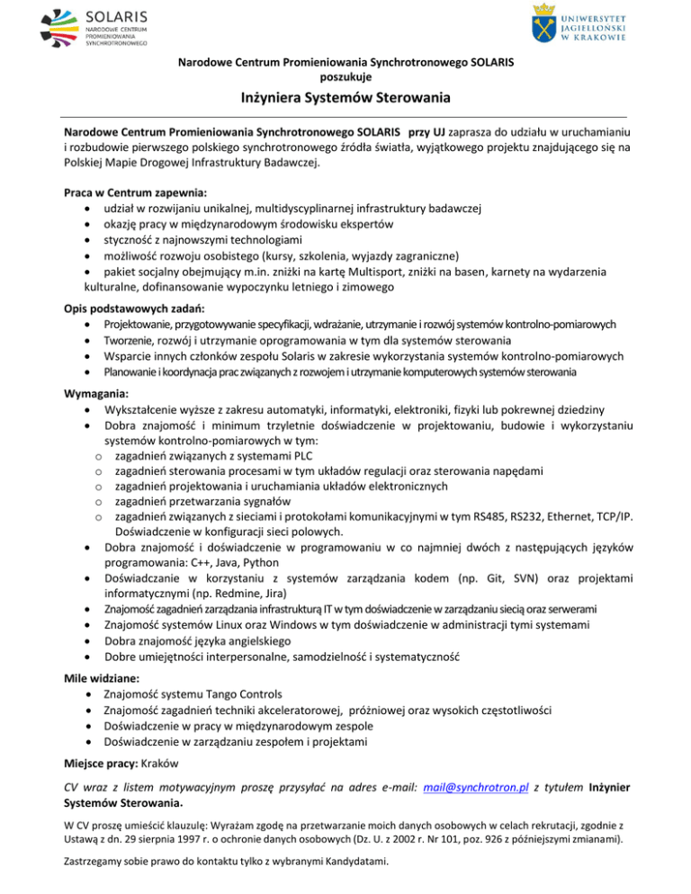 Narodowe Centrum Promieniowania Synchrotronowego SOLARIS poszukuje Inżyniera Systemów Sterowania Narodowe Centrum Promieniowania Synchrotronowego SOLARIS przy UJ zaprasza do udziału w uruchamianiu i rozbudowie pierwszego polskiego synchrotronowego źródła światła, wyjątkowego projektu znajdującego się na Polskiej Mapie Drogowej Infrastruktury Badawczej. Praca w Centrum zapewnia: udział w rozwijaniu unikalnej, multidyscyplinarnej infrastruktury badawczej okazję pracy w międzynarodowym środowisku ekspertów styczność z najnowszymi technologiami możliwość rozwoju osobistego (kursy, szkolenia, wyjazdy zagraniczne) pakiet socjalny obejmujący m.in. zniżki na kartę Multisport, zniżki na basen, karnety na wydarzenia kulturalne, dofinansowanie wypoczynku letniego i zimowego Opis podstawowych zadań: Projektowanie, przygotowywanie specyfikacji, wdrażanie, utrzymanie i rozwój systemów kontrolno-pomiarowych Tworzenie, rozwój i utrzymanie oprogramowania w tym dla systemów sterowania Wsparcie innych członków zespołu Solaris w zakresie wykorzystania systemów kontrolno-pomiarowych Planowanie i koordynacja prac związanych z rozwojem i utrzymanie komputerowych systemów sterowania Wymagania: Wykształcenie wyższe z zakresu automatyki, informatyki, elektroniki, fizyki lub pokrewnej dziedziny Dobra znajomość i minimum trzyletnie doświadczenie w projektowaniu, budowie i wykorzystaniu systemów kontrolno-pomiarowych w tym: o zagadnień związanych z systemami PLC o zagadnień sterowania procesami w tym układów regulacji oraz sterowania napędami o zagadnień projektowania i uruchamiania układów elektronicznych o zagadnień przetwarzania sygnałów o zagadnień związanych z sieciami i protokołami komunikacyjnymi w tym RS485, RS232, Ethernet, TCP/IP. Doświadczenie w konfiguracji sieci polowych. Dobra znajomość i doświadczenie w programowaniu w co najmniej dwóch z następujących języków programowania: C++, Java, Python Doświadczanie w korzystaniu z systemów zarządzania kodem (np. Git, SVN) oraz projektami informatycznymi (np. Redmine, Jira) Znajomość zagadnień zarządzania infrastrukturą IT w tym doświadczenie w zarządzaniu siecią oraz serwerami Znajomość systemów Linux oraz Windows w tym doświadczenie w administracji tymi systemami Dobra znajomość języka angielskiego Dobre umiejętności interpersonalne, samodzielność i systematyczność Mile widziane: Znajomość systemu Tango Controls Znajomość zagadnień techniki akceleratorowej, próżniowej oraz wysokich częstotliwości Doświadczenie w pracy w międzynarodowym zespole Doświadczenie w zarządzaniu zespołem i projektami Miejsce pracy: Kraków CV wraz z listem motywacyjnym proszę przysyłać na adres e-mail: [email protected] z tytułem Inżynier Systemów Sterowania. W CV proszę umieścić klauzulę: Wyrażam zgodę na przetwarzanie moich danych osobowych w celach rekrutacji, zgodnie z Ustawą z dn. 29 sierpnia 1997 r. o ochronie danych osobowych (Dz. U. z 2002 r. Nr 101, poz. 926 z późniejszymi zmianami). Zastrzegamy sobie prawo do kontaktu tylko z wybranymi Kandydatami.