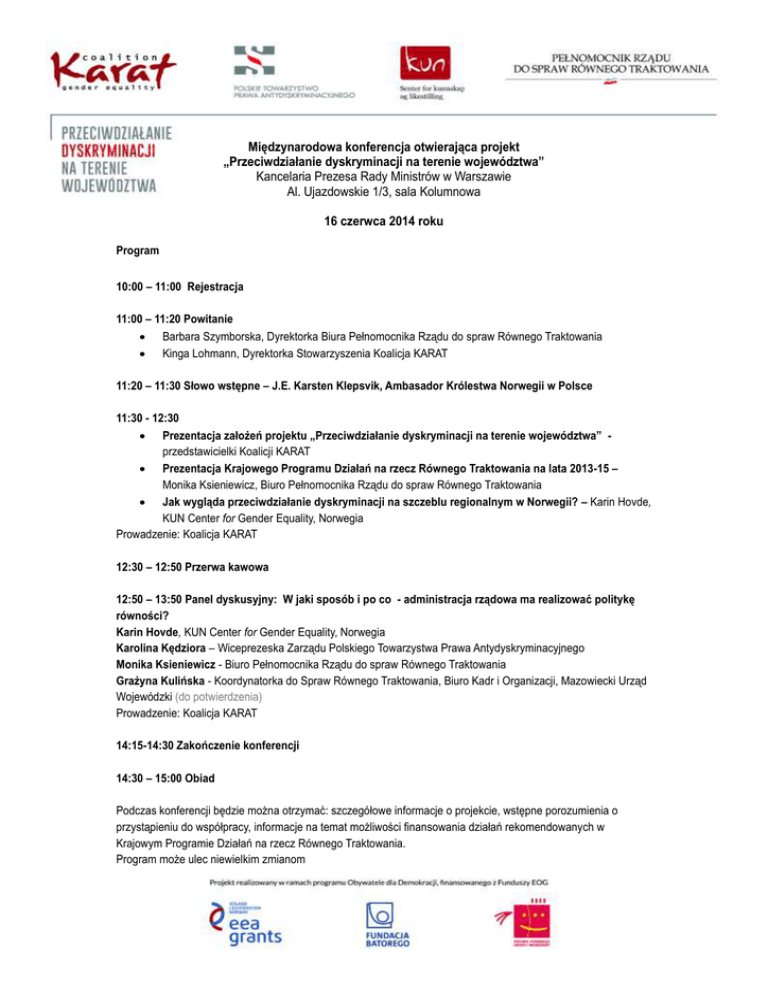 Międzynarodowa konferencja otwierająca projekt „Przeciwdziałanie dyskryminacji na terenie województwa” Kancelaria Prezesa Rady Ministrów w Warszawie Al. Ujazdowskie 1/3, sala Kolumnowa 16 czerwca 2014 roku Program 10:00 – 11:00 Rejestracja 11:00 – 11:20 Powitanie Barbara Szymborska, Dyrektorka Biura Pełnomocnika Rządu do spraw Równego Traktowania Kinga Lohmann, Dyrektorka Stowarzyszenia Koalicja KARAT 11:20 – 11:30 Słowo wstępne – J.E. Karsten Klepsvik, Ambasador Królestwa Norwegii w Polsce 11:30 - 12:30 Prezentacja założeń projektu „Przeciwdziałanie dyskryminacji na terenie województwa” przedstawicielki Koalicji KARAT Prezentacja Krajowego Programu Działań na rzecz Równego Traktowania na lata 2013-15 – Monika Ksieniewicz, Biuro Pełnomocnika Rządu do spraw Równego Traktowania Jak wygląda przeciwdziałanie dyskryminacji na szczeblu regionalnym w Norwegii? – Karin Hovde, KUN Center for Gender Equality, Norwegia Prowadzenie: Koalicja KARAT 12:30 – 12:50 Przerwa kawowa 12:50 – 13:50 Panel dyskusyjny: W jaki sposób i po co - administracja rządowa ma realizować politykę równości? Karin Hovde, KUN Center for Gender Equality, Norwegia Karolina Kędziora – Wiceprezeska Zarządu Polskiego Towarzystwa Prawa Antydyskryminacyjnego Monika Ksieniewicz - Biuro Pełnomocnika Rządu do spraw Równego Traktowania Grażyna Kulińska - Koordynatorka do Spraw Równego Traktowania, Biuro Kadr i Organizacji, Mazowiecki Urząd Wojewódzki (do potwierdzenia) Prowadzenie: Koalicja KARAT 14:15-14:30 Zakończenie konferencji 14:30 – 15:00 Obiad Podczas konferencji będzie można otrzymać: szczegółowe informacje o projekcie, wstępne porozumienia o przystąpieniu do współpracy, informacje na temat możliwości finansowania działań rekomendowanych w Krajowym Programie Działań na rzecz Równego Traktowania. Program może ulec niewielkim zmianom