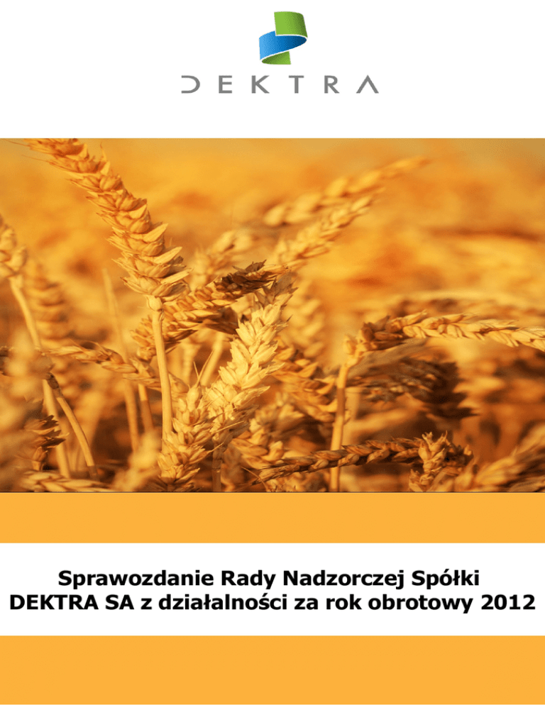 Sprawozdanie Rady Nadzorczej Spółki DEKTRA SA z działalności za rok obrotowy 2012 Sprawozdanie Rady Nadzorczej SPRAWOZDANIE RADY NADZORCZEJ DEKTRA SPÓŁKA AKCYJNA Z WYNIKÓW OCENY SPRAWOZDANIA ZARZĄDU Z DZIAŁALNOŚCI SPÓŁKI, SPRAWOZDANIA FINANSOWEGO ZA ROK OBROTOWY 2012, OCENY WNIOSKU ZARZĄDU SPÓŁKI DOTYCZĄCEGO PRZEZNACZENIA ZYSKU WYPRACOWANEGO W ROKU 2012 ORAZ Z LAT POPRZEDNICH ORAZ ZWIĘZŁEJ OCENY SYTUACJI SPÓŁKI A TAKŻE SPRAWOZDANIE Z DZIAŁALNOŚCI RADY NADZORCZEJ SPÓŁKI W ROKU OBROTOWYM 2012 Sprawozdanie Rady Nadzorczej oraz ocena sytuacji Spółki w roku 2012 zostały sporządzone na podstawie przepisu art. 382 § 3 kodeksu spółek handlowych oraz art. 395 §2 kodeksu spółek handlowych. Sprawozdanie oraz roczna ocena sytuacji Spółki zostały sporządzone w oparciu o : 1. Sprawozdanie Zarządu z działalności Spółki w roku obrotowym 2012; 2. Sprawozdanie finansowe Spółki za rok obrotowy 2012; 3. Raport i opinię z badania sprawozdania finansowego Spółki za rok 2012, sporządzonego przez podmiot uprawniony do badania sprawozdań finansowych spółkę Continuum Consulting Group Poland Sp. z o.o.; 4. Propozycje Zarządu Spółki co do podziału zysku za rok 2012. W roku 2012 w skład Rady Nadzorczej wchodziły następujące osoby Beata Stefańska – Przewodniczący Rady Sławomir Goraj – Wiceprzewodniczący Rady Barbara Rusinowska-Mynett – Sekretarz Rady Piotr Grzesiak Radosław Chłopecki W roku 2012 Rada Nadzorcza sprawowała nadzór nad działalnością Spółki we wszystkich istotnych sferach jej działalności. Strona 1 z 4 Sprawozdanie Rady Nadzorczej Czynności nadzorczo – kontrolne dotyczyły między innymi analizy bieżących wyników ekonomicznych Spółki oraz okresowych sprawozdań finansowych, jak również zapoznawania się z okresowymi informacjami Zarządu Spółki co do bieżącej i planowanej działalności. Na posiedzeniu Rady Nadzorczej podejmowano uchwały, które były wymagane dla prawidłowego funkcjonowania Rady Nadzorczej jako organu, prowadzenia działalności przez Spółkę, w tym zgodnie z przepisami o charakterze wewnętrznym. Kwestie podlegające formalnej ocenie Rady Nadzorczej dotyczyły relacji Spółki z Zarządem, oraz związaną z tym koniecznością zatwierdzania umów oraz wyboru biegłego rewidenta do zbadania sprawozdania finansowego. OCENA SYTUACJI SPÓŁKI W celu zbadania sytuacji finansowej Spółki Rada Nadzorcza powierzyła przeprowadzenie badania sprawozdania finansowego Spółki za rok 2012 spółce Continuum Consulting Group Poland Sp. z o.o., będącej podmiotem uprawnionym do badania sprawozdań finansowych. Po zapoznaniu się z opinią podmiotu badającego sprawozdanie finansowe oraz w oparciu o przeprowadzone własne analizy sprawozdania finansowego za 2012 rok, należy stwierdzić, że sporządzone ono zostało we wszystkich istotnych aspektach, zgodnie z określonymi w Ustawie o rachunkowości zasadami oraz na podstawie prawidłowo prowadzonych ksiąg rachunkowych. Przedstawia ono rzetelnie i jasno wszystkie informacje istotne dla oceny sytuacji majątkowej i finansowej Spółki na dzień 31 grudnia 2012 roku, jak też jej wyniku finansowego za rok obrotowy od 1 stycznia 2012 roku do 31 grudnia 2012 roku. Ponadto jest zgodne z wpływającymi na treść sprawozdania finansowego przepisami prawa i postanowieniami statutu Spółki. W związku z powyższym, tj. po analizie wyników Spółki za rok 2012, sprawozdania Zarządu oraz badaniu dokonanym przez uprawniony podmiot, Rada Nadzorcza stwierdza co następuje: Rok obrotowy 2012 był pozytywnym okresem dla Spółki, a świadczą o tym następujące efekty: a) bilans sporządzony na dzień 31 grudnia 2012 roku po stronie aktywów i pasywów wykazuje sumę 4.790.056,79 zł, b) rachunek zysków i strat za okres 1.01.2012-31.01.2012, wykazujący zysk netto w wysokości 1.094.511,07 zł, c) zestawienie zmian w kapitale własnym za okres 1.01.2012-31.01.2012, wykazujące zmniejszenie stanu kapitału własnego o kwotę 561 488,93 zł, Strona 2 z 4 Sprawozdanie Rady Nadzorczej d) rachunek przepływów pieniężnych za okres 1.01.2012-31.01.2012, wykazujący zmniejszenie stanu środków pieniężnych netto o kwotę 1.137.497,25. W roku 2012 przychody ze sprzedaży wyniosły 15.049.828,31 zł. W wyniku przeprowadzonej analizy wyników finansowych Spółki Rada Nadzorcza uznała, że w najbliższym okresie zasoby finansowe Spółki pozwalają na dalszą prawidłową działalność Spółki. W opinii Rady Nadzorczej, Spółka weszła w rok 2013 w bardzo dobrej i stabilnej kondycji finansowej. WNIOSKI KOŃCOWE Analizowane przez Radę Nadzorczą sprawozdanie Zarządu z działalności Spółki w 2012 roku ocenione zostało jako wyczerpujące oraz dające prawidłowy i rzetelny obraz sytuacji Spółki w okresie sprawozdawczym. Przedłożone przez Zarząd sprawozdanie finansowe sporządzone zostało zgodnie z obowiązującymi zasadami rachunkowości określonymi w Ustawie o rachunkowości z dnia 29.09.1994 roku, stosowanymi w sposób ciągły, na podstawie prawidłowo prowadzonych ksiąg rachunkowych. Rada Nadzorcza w oparciu o opinię Continuum Consulting Group Poland Sp. z o.o. – podmiotu uprawnionego do badania sprawozdań finansowych Spółki oraz własne spostrzeżenia wnosi do Walnego Zgromadzenia DEKTRA SA o zatwierdzenie sprawozdania Zarządu z działalności Spółki oraz sprawozdania finansowego DEKTRA SA za rok obrotowy 2012, a w nim: - wprowadzenie do sprawozdania finansowego; - bilans sporządzony na dzień 31 grudnia 2012 roku, który po stronie aktywów i pasywów zamyka się suma: 4.790.056,79 zł; - rachunek zysków i strat za okres 1.01.2012-31.01.2012, wykazujący zysk netto w wysokości 1.094.511,07 zł; - zestawienie zmian w kapitale własnym za okres od 1 stycznia 2012 roku do 31 grudnia 2012 roku, wykazujące zmniejszenie kapitałów własnych o kwotę: 561 488,93 zł; - rachunek przepływów pieniężnych za rok obrotowy od l stycznia 20