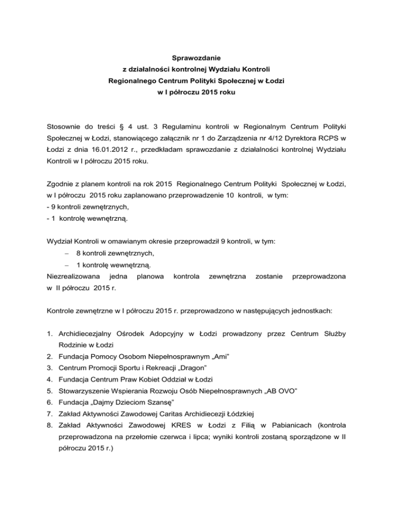 Sprawozdanie z działalności kontrolnej Wydziału Kontroli Regionalnego Centrum Polityki Społecznej w Łodzi w I półroczu 2015 roku Stosownie do treści § 4 ust. 3 Regulaminu kontroli w Regionalnym Centrum Polityki Społecznej w Łodzi, stanowiącego załącznik nr 1 do Zarządzenia nr 4/12 Dyrektora RCPS w Łodzi z dnia 16.01.2012 r., przedkładam sprawozdanie z działalności kontrolnej Wydziału Kontroli w I półroczu 2015 roku. Zgodnie z planem kontroli na rok 2015 Regionalnego Centrum Polityki Społecznej w Łodzi, w I półroczu 2015 roku zaplanowano przeprowadzenie 10 kontroli, w tym: - 9 kontroli zewnętrznych, - 1 kontrolę wewnętrzną. Wydział Kontroli w omawianym okresie przeprowadził 9 kontroli, w tym: 8 kontroli zewnętrznych, 1 kontrolę wewnętrzną. Niezrealizowana jedna planowa kontrola zewnętrzna zostanie przeprowadzona w II półroczu 2015 r. Kontrole zewnętrzne w I półroczu 2015 r. przeprowadzono w następujących jednostkach: 1. Archidiecezjalny Ośrodek Adopcyjny w Łodzi prowadzony przez Centrum Służby Rodzinie w Łodzi 2. Fundacja Pomocy Osobom Niepełnosprawnym „Ami” 3. Centrum Promocji Sportu i Rekreacji „Dragon” 4. Fundacja Centrum Praw Kobiet Oddział w Łodzi 5. Stowarzyszenie Wspierania Rozwoju Osób Niepełnosprawnych „AB OVO” 6. Fundacja „Dajmy Dzieciom Szansę” 7. Zakład Aktywności Zawodowej Caritas Archidiecezji Łódzkiej 8. Zakład Aktywności Zawodowej KRES w Łodzi z Filią w Pabianicach (kontrola przeprowadzona na przełomie czerwca i lipca; wyniki kontroli zostaną sporządzone w II półroczu 2015 r.) Do najpoważniejszych lub najczęściej powtarzających się nieprawidłowości i uchybień, stwierdzonych w czasie kontroli zewnętrznych należało: 1. Dokonanie zwrotu uzyskanych przychodów w postaci odsetek bankowych po terminie wynikającym z zapisów umowy o wsparcie realizacji zadania publicznego. 2. Odprowadzenie do Urzędu Skarbowego podatku w zaniżonej wysokości z powodu nieuzasadnionego wyliczenia kosztów uzyskania przychodów oraz przyjęcia za podstawę opodatkowania kwoty brutto pomniejszonej o koszty uzyskania przychodu na rachunku do umowy o praktyki absolwenckie. 3. Składanie Sprawozdania końcowego z realizacji zadania po terminie wskazanym w umowie o wsparcie realizacji zadania publicznego. 4. Błędne sporządzanie Sprawozdania częściowego/końcowego (np. zamieszczanie nieprawidłowych danych; wskazywanie adnotacji o braku uzyskania odsetek wykazywanie błędnych źródeł finansowania bankowych, pomimo ich uzyskania; wkładu własnego). 5. Niedokonanie weryfikacji formalnej dokumentów księgowych, m. in. w zakresie poprawności ujętych na dokumencie danych dotyczących numeru umowy zlecenie, nazwy nabywcy, daty wystawienia. 6. Niedokonanie weryfikacji rachunkowej dokumentów księgowych, m. in. w zakresie poprawności ujętych na dokumencie danych dotyczących wyliczenia wartości netto danej pozycji na fakturze; kwoty podatku, zaliczki na podatek dochodowy, wynagrodzenia netto na rachunku do umowy zlecenie. 7. Błędne sporządzanie opisów merytorycznych na dokumentach stanowiących podstawę rozliczenia dotacji: zamieszczanie w opisach nieprawidłowych informacji, zamieszczanie opisu merytorycznego dokumentów księgowych na osobnych kartkach, zamiast drugostronnie na oryginałach dokumentów, dokonanie korekt w opisach merytorycznych zamieszczanych na dokumentach księgowych przy użyciu korektora. 8. Nienaniesienie drugostronnego opisu merytorycznego wydatku na dokumencie księgowym, który stanowi wkład własny do zadania. 9. Błędne sporządzanie umów o dzieło, m.in. wskazywanie błędnej kwoty wynagrodzenia słownie, wpisywanie nieprawidłowej daty zawarcia umowy. 10. Prowadzenie dokumentacji zadania w sposób utrudniający ocenę wykonania zadania pod względem merytorycznym. 11. Popełnianie błędów na wyciągach bankowych/potwierdzeniach operacji (np. nieprawidłowy numer dokumentu księgowego w tytule operacji, błędne dane kontrahenta). 12. Składnie do RCPS potwierdzeń operacji dotyczących zapłaty składek ZUS i podatku dochodowego od osób fizycznych do Urzędu Skarbowego bez naniesionych adnotacji, jakich umów wpłaty dotyczą. 13. Popełnianie błędów w opisach poszczególnych dokumentów potwierdzających zapłatę podatku dochodowego od osób fizycznych do Urzędu Skarbowego (np. błędny numer rachunku/umowy, której wpłata dotyczy). 14. Nieumieszczanie na wydawanych w ramach realizacji zadania materiałach promocyjno – informacyjnych oraz zakupionym sprzęcie adnotacji o źródle dofinansowania zadania i loga Zleceniodawcy. W I półroczu 2015 r. wydano 1 decyzję administracyjną oraz złożono 1 zawiadomienie o możliwości popełnienia przestępstwa dotyczące nieprawidłowości wykrytej w czasie kontroli przeprowadzonej w II półroczu 2014 r. Łódź, 30.07.2015 r.