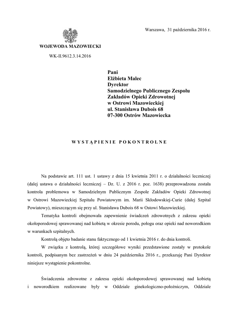Warszawa, 31 października 2016 r. WOJEWODA MAZOWIECKI WK-II.9612.3.14.2016 Pani Elżbieta Malec Dyrektor Samodzielnego Publicznego Zespołu Zakładów Opieki Zdrowotnej w Ostrowi Mazowieckiej ul. Stanisława Dubois 68 07-300 Ostrów Mazowiecka WYSTĄPIENIE POKONTROLNE Na podstawie art. 111 ust. 1 ustawy z dnia 15 kwietnia 2011 r. o działalności leczniczej (dalej ustawa o działalności leczniczej – Dz. U. z 2016 r. poz. 1638) przeprowadzona została kontrola problemowa w Samodzielnym Publicznym Zespole Zakładów Opieki Zdrowotnej w Ostrowi Mazowieckiej Szpitalu Powiatowym im. Marii Skłodowskiej-Curie (dalej Szpital Powiatowy), mieszczącym się przy ul. Stanisława Dubois 68 w Ostowi Mazowieckiej. Tematyka kontroli obejmowała zapewnienie świadczeń zdrowotnych z zakresu opieki okołoporodowej sprawowanej nad kobietą w okresie porodu, połogu oraz opieki nad noworodkiem w warunkach szpitalnych. Kontrolą objęto badanie stanu faktycznego od 1 kwietnia 2016 r. do dnia kontroli. W związku z kontrolą, której szczegółowe wyniki przedstawione zostały w protokole kontroli, podpisanym bez zastrzeżeń w dniu 24 października 2016 r., przekazuję Pani Dyrektor niniejsze wystąpienie pokontrolne. Świadczenia zdrowotne z zakresu opieki okołoporodowej sprawowanej nad kobietą i noworodkiem realizowane były w Oddziale ginekologiczno-położniczym, Oddziale neonatologicznym oraz Sali porodowej. Zgodnie z danymi zgłoszonymi do rejestru podmiotów wykonujących działalność leczniczą Oddział ginekologiczno-położniczy dysponował 24 łóżkami, w tym 7 łóżkami w systemie rooming-in (matka z dzieckiem), a Oddział neonatologiczny – 7 łóżeczkami dla noworodków, w tym 2 łóżeczkami intensywnej opieki medycznej i 4 inkubatorami. W poddanym badaniu okresie w Szpitalu Powiatowym odbyło się 220 porodów. Ustalono, że 94 porody przeprowadzone zostały z nacięciem i szyciem krocza (co stanowi 42,70% porodów), a 60 – poprzez cięcie cesarskie (27,20% porodów). W trakcie akcji porodowej w 15 przypadkach zastosowano znieczulenie zewnątrzoponowe, a w 13 gazem wziewnym. Średni czas pobytu pacjentki w Oddziale ginekologiczno-położniczym wynosił 2-3 dni. Szpital Powiatowy zapewniał realizację świadczeń zdrowotnych z zakresu opieki okołoporodowej sprawowanej nad kobietą w okresie porodu, połogu oraz opieki nad noworodkiem w warunkach szpitalnych, poprzez: omówienie planu porodu, wykonywanie badań diagnostycznych i klinicznych, monitorowanie parametrów życiowych w poszczególnych okresach porodu, dobór najdogodniejszych pozycji rodzącej podczas porodu, uśmierzanie bólu z wykorzystaniem naturalnych metod lub środków farmakologicznych, bieżące informowanie rodzącej o postępach porodu, identyfikację czynników ryzyka śródporodowego u rodzącej i dziecka, ocenę stanu zdrowia noworodka, edukację i instruktaż w zakresie pielęgnacji i karmienia noworodka, wykonywanie świadczeń profilaktycznych oraz badań przesiewowych u noworodka – zgodnie z wymogami określonymi w rozporządzeniu Ministra Zdrowia z dnia 20 września 2012 r. w sprawie standardów postępowania medycznego przy udzielaniu świadczeń zdrowotnych z zakresu opieki okołoporodowej sprawowanej nad kobietą w okresie fizjologicznej ciąży, fizjologicznego porodu, połogu oraz opieki nad noworodkiem (dalej rozporządzenie w sprawie standardów opieki okołoporodowej – Dz. U. z 2016 r. poz. 1132). Świadczenia zdrowotne z zakresu opieki okołoporodowej sprawowanej nad kobietą w okresie porodu, połogu w warunkach szpitalnych realizowane były przez 10 lekarzy: 7 lekarzy specjalistów w dziedzinie położnictwa i ginekologii, 1 lekarza ze specjalizacją Iº w zakresie położnictwa i ginekologii (posiadający jednocześnie specjalizację Iº w zakresie anestezjologii i intensywnej terapii) oraz 2 lekarzy będących w trakcie specjalizacji z położnictwa i ginekologii. Opiekę nad noworodkiem sprawowało 9 lekarzy: 1 lekarz specjalista w zakresie neonatologii, posiadający jednocześnie specjalizację w zakresie pediatrii, 6 lekarzy było specjalistami w zakresie pediatrii (1 lekarz posiadał jednocześnie specjalizację w zakresie medycyny rodzinnej), 1 lekarz ze specjalizacją Iº w zakresie pediatrii, będący jednocześnie specjalistą w zakresie otolaryngologii oraz 1 lekarz będący w trakcie specjalizacji w zakresie 2 pediatrii. Opieka medyczna zabezpieczona była przez 28 położnych i 2 pielęgniarki. Dwie położne posiadały tytuł magistra położnictwa, 1 położna – ekonomiki i organizacji ochrony zdrowia, 2 pielęgniarki – magistra pielęgniarstwa, a 9 położnych – tytuł licencjata z położnictwa. Specjalizację w dziedzinie pielęgniarstwa położniczego ukończyło 14 położnych, a pielęgniarstwa neonatologicznego – 1 położna i 2 pielęgniarki. Kurs kwalifikacyjny w dziedzinie pielęgniarstwa rodzinnego ukończyły 4 położne, pielęgniarstwa operacyjnego – 15 położnych, a organizacji i zarządzania – 1 położna. Kurs specjalistyczny w zakresie szczepień ochronnych odbyło 9 położnych i 2 pielęgniarki, wykonywania i interpretacji zapisu elektrokardiogramu – 16 położnych, a resuscytacji krążeniowooddechowej – 1 pielęgniarka. Jedna położna posiadała tytuł Certyfikowanego Doradcy Laktacyjnego. Kurs doskonalący w zakresie karmienia piersią jako standard w opiece okołoporodowej odbyła 1 położna, a profesjonalne przygotowanie do prowadzenia zajęć w szkole rodzenia – 1 położna. W dokumentacji podmiotu leczniczego zgromadzono dokumenty potwierdzające prawo wykonywania zawodu aktualnie zatrudnionej kadry lekarskiej, pielęgniarskiej i położnych. Na podstawie analizy dokumentacji medycznej, dotyczącej 30 pacjentek stwierdzono, że dla 25 pacjentek ustalony został plan porodu, który uwzględniał wszystkie elementy postępowania medycznego związanego z opieką podczas porodu i miejsce porodu, zgodnie z wymogami określonym