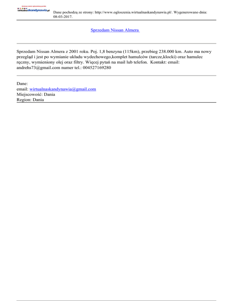 Dane pochodzą ze strony: http://www.ogloszenia.wirtualnaskandynawia.pl/. Wygenerowano dnia: 08-03-2017. Sprzedam Nissan Almera Sprzedam Nissan Almera z 2001 roku. Poj. 1,8 benzyna (115km), przebieg 238.000 km. Auto ma nowy przegląd i jest po wymianie układu wydechowego,komplet hamulców (tarcze,klocki) oraz hamulec ręczny, wymieniony olej oraz filtry. Więcej pytań na mail lub telefon. Kontakt: email: [email protected] numer tel.: 004527169280 Dane: email: [email protected] Miejscowość: Dania Region: Dania