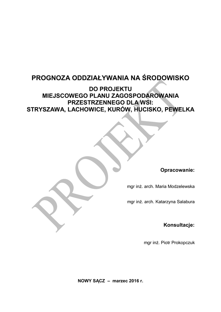 PROGNOZA ODDZIAŁYWANIA NA ŚRODOWISKO DO PROJEKTU MIEJSCOWEGO PLANU ZAGOSPODAROWANIA PRZESTRZENNEGO DLA WSI: STRYSZAWA, LACHOWICE, KURÓW, HUCISKO, PEWELKA Opracowanie: mgr inż. arch. Maria Modzelewska mgr inż. arch. Katarzyna Salabura Konsultacje: mgr inż. Piotr Prokopczuk NOWY SĄCZ – marzec 2016 r. SPIS TREŚCI I. Podstawa prawna i cel opracowania. II. Główne cele projektowanego dokumentu oraz jego powiązania z innymi dokumentami. III. Metoda opracowania. IV. Propozycje metody i częstotliwości monitoringu skutków realizacji ustaleń planu. V. Informacje o możliwym transgranicznym oddziaływaniu na środowisko. VI. Charakterystyka stanu środowiska przyrodniczego na obszarach objętych planem oraz przewidywanym oddziaływaniem. VII. Obszary podlegające ochronie na terenie opracowania i cele ich ochrony uwzględnione w planie. VIII. Stan środowiska na obszarach objętych przewidywanym znaczącym oddziaływaniem. IX. Istniejące problemy ochrony środowiska istotne z punktu widzenia realizacji projektowanego dokumentu. X. Cele ochrony środowiska ustanowione na szczeblu międzynarodowym, wspólnotowym i krajowym oraz sposoby w jakich te cele zostały uwzględnione w planie. XI. Przewidywane znaczące oddziaływanie na cele i przedmiot ochrony obszaru Natura 2000. XII. Przewidywane znaczące oddziaływanie na poszczególne komponenty środowiska. XIII. Rozwiązania mające na celu zapobieganie i ograniczanie negatywnych oddziaływań na środowisko, w szczególności na cele i przedmiot ochrony obszarów Natura 2000. XIV. Rozwiązania alternatywne do rozwiązań zawartych w projekcie planu lub wyjaśnienie braku rozwiązań alternatywnych. XV. Streszczenie. Załącznik graficzny do prognozy oddziaływania na środowisko dla projektu mpzp dla wsi: Stryszawa, Lachowice, Kurów, Hucisko, Pewelka - skala 1: 5000 2 MIEJSCOWY PLAN ZAGOSPODAROWANIA PRZESTRZENNEGO DLA WSI: STRYSZAWA, LACHOWICE, KURÓW, HUCISKO, PEWELKA PROGNOZA ODDZIAŁYWANIA NA ŚRODOWISKO PRAWA AUTORSKIE ZASTRZEŻONE, BIURO URBANISTYCZNE – MARIA MODZELEWSKA I. PODSTAWA PRAWNA I CEL OPRACOWANIA Niniejsze opracowanie sporządzono w oparciu o art. 17 pkt 4 „Ustawy o planowaniu i zagospodarowaniu przestrzennym” z dnia 27 marca 2003 r. (tekst jednolity Dz. U. z 2015 r. poz. 199 z późn. zmianami) oraz art. 46 „Ustawy o udostępnianiu informacji o środowisku i jego ochronie, udziale społeczeństwa w ochronie środowiska oraz o ocenach oddziaływania na środowisko” z dnia 3 października 2008 roku, (tekst jednolity Dz. U z 2013 r., poz.1235 z późn. zmianami). Prognozę oddziaływania na środowisko opracowano zgodnie z art. 51 „Ustawy o udostępnianiu informacji o środowisku i jego ochronie, udziale społeczeństwa w ochronie środowiska oraz o ocenach oddziaływania na środowisko” z dnia 3 października 2008 roku, (tekst jednolity Dz. U z 2013 r., poz. 1235 z późn. zmianami) ze szczególnym uwzględnieniem zakresu i stopnia szczegółowości informacji zawartych w prognozie oddziaływania, uzgodnionych z Regionalną Dyrekcją Ochrony Środowiska w Krakowie dnia 11.03.2016 r., znak: OO.411.3.15.2016.MZi oraz z Państwowym Powiatowym Inspektorem Sanitarnym w Suchej Beskidzkiej dnia 9.03.2016 r., znak: NNZ. 9022.1.25.2016. Celem prognozy jest przedstawienie i ocenienie skutków wpływu realizacji ustaleń zawartych w planie na cele i przedmiot ochrony obszaru Natura 2000, elementy środowiska przyrodniczego i kulturowego, a w szczególności na ludzi, powietrze, powierzchnię ziemi łącznie z glebą, kopaliny, wody powierzchniowe i podziemne, klimat, świat zwierzęcy i roślinny – we wzajemnym powiązaniu, ekosystemy oraz krajobraz, a także dobra materialne i dobra kultury. Prognoza powinna jednocześnie przedstawiać możliwości rozwiązań eliminujących lub ograniczających szkodliwe oddziaływanie na środowisko wynikające z realizacji ustaleń projektowanej zmiany planu. Prognoza oddziaływania na środowisko wykonana jest dla potrzeb mpzp obejmującego części wsi: Stryszawa, Lachowice, Kurów, Hucisko, Pewelka i stanowi zmianę miejscowych planów zagospodarowania przestrzennego dla ww. miejscowości uchwalonych przez radę gminy w roku 2002 i 2005 z poźn. zmianami. Obszar objęty planem obejmuje teren przewidywany dla lokalizacji linii elektroenergetycznej 110kV relacji Jeleśnia – Sucha Beskidzka wraz z pasem terenów z nią sąsiadujących o łącznej szerokości 100 metrów. Projekt planu wraz z prognozą oddziaływania na środowisko dla części wsi: Stryszawa, Lachowice, Kurów, Hucisko i Pewelka wykonywany jest na podstawie uchwały Rady Gminy nr IX/59/15 z dnia 11 września 2015 r. 3 MIEJSCOWY PLAN ZAGOSPODAROWANIA PRZESTRZENNEGO DLA WSI: STRYSZAWA, LACHOWICE, KURÓW, HUCISKO, PEWELKA PROGNOZA ODDZIAŁYWANIA NA ŚRODOWISKO PRAWA AUTORSKIE ZASTRZEŻONE, BIURO URBANISTYCZNE – MARIA MODZELEWSKA II. GŁÓWNE CELE PROJEKTOWANEGO POWIĄZANIA Z INNYMI DOKUMENTAMI DOKUMENTU ORAZ JEGO Celem mpzp dla części miejscowości: Stryszawa, Lachowice, Kurów, Hucisko i Pewelka jest umożliwienie lokalizacji na ww. terenie linii elektroenergetycznej 110 KV relacji Jeleśnia – Sucha Beskidzka oraz doprowadzenie do niesprzeczności nowego planu dla ww. obszaru z ustaleniami obowiązującego studium uwarunkowań i kierunków zagospodarowania przestrzennego gminy uchwalonego uchwałą Nr XXII/153/12 Rady Gminy Stryszawa z dnia 3 grudnia 2012 r. Istniejąca obecnie na obszarze gminy sieć rozdzielcza średniego napięcia 15kV nie zabezpiecza zwiększonego zapotrzebowania na energię elektryczną. Dlatego też w planie województwa oraz studium uwarunkowań i kierunków zagospodarowania przestrzennego gminy Stryszawa wskazano przebieg projektowanej linii 110 kV. Ponadto obszar objęty planem miejscowym otoczony jest terenami, posiadającymi nowe plany zagospodarowania przestrzennego uchwalone w latach 2014 - 2016, z których wyłączono obszar objęty obecnie opracowywanym planem. Dlatego t