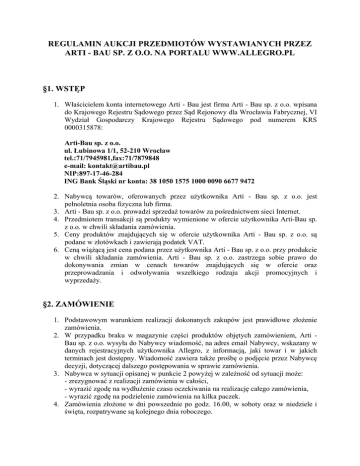 REGULAMIN AUKCJI PRZEDMIOTÓW WYSTAWIANYCH PRZEZ ARTI - BAU SP. Z O.O. NA PORTALU WWW.ALLEGRO.PL §1. WSTĘP 1. Właścicielem konta internetowego Arti - Bau jest firma Arti - Bau sp. z o.o. wpisana do Krajowego Rejestru Sądowego przez Sąd Rejonowy dla Wrocławia Fabrycznej, VI Wydział Gospodarczy Krajowego Rejestru Sądowego pod numerem KRS 0000315878: Arti-Bau sp. z o.o. ul. Łubinowa 1/1, 52-210 Wrocław tel.:71/7945981,fax:71/7879848 e-mail: [email protected] NIP:897-17-46-284 ING Bank Śląski nr konta: 38 1050 1575 1000 0090 6677 9472 2. Nabywcą towarów, oferowanych przez użytkownika Arti - Bau sp. z o.o. jest pełnoletnia osoba fizyczna lub firma. 3. Arti - Bau sp. z o.o. prowadzi sprzedaż towarów za pośrednictwem sieci Internet. 4. Przedmiotem transakcji są produkty wymienione w ofercie użytkownika Arti-Bau sp. z o.o. w chwili składania zamówienia. 5. Ceny produktów znajdujących się w ofercie użytkownika Arti - Bau sp. z o.o. są podane w złotówkach i zawierają podatek VAT. 6. Ceną wiążącą jest cena podana przez użytkownika Arti - Bau sp. z o.o. przy produkcie w chwili składania zamówienia. Arti - Bau sp. z o.o. zastrzega sobie prawo do dokonywania zmian w cenach towarów znajdujących się w ofercie oraz przeprowadzania i odwoływania wszelkiego rodzaju akcji promocyjnych i wyprzedaży. §2. ZAMÓWIENIE 1. Podstawowym warunkiem realizacji dokonanych zakupów jest prawidłowe złożenie zamówienia. 2. W przypadku braku w magazynie części produktów objętych zamówieniem, Arti Bau sp. z o.o. wysyła do Nabywcy wiadomość, na adres email Nabywcy, wskazany w danych rejestracyjnych użytkownika Allegro, z informacją, jaki towar i w jakich terminach jest dostępny. Wiadomość zawiera także prośbę o podjęcie przez Nabywcę decyzji, dotyczącej dalszego postępowania w sprawie zamówienia. 3. Nabywca w sytuacji opisanej w punkcie 2 powyżej w zależność od sytuacji może: - zrezygnować z realizacji zamówienia w całości, - wyrazić zgodę na wydłużenie czasu oczekiwania na realizację całego zamówienia, - wyrazić zgodę na podzielenie zamówienia na kilka paczek. 4. Zamówienia złożone w dni powszednie po godz. 16.00, w soboty oraz w niedziele i święta, rozpatrywane są kolejnego dnia roboczego. 5. Przyjęcie do realizacji zamówienia rozpoczyna się po zaksięgowaniu pieniędzy na koncie bankowym. 6. Do sprzedaży promocyjnej oraz wyprzedaży przeznaczona jest ograniczona liczba towarów i realizacja zamówień następuje według kolejności wpływania potwierdzonych zamówień na te towary, aż do wyczerpania się zapasów objętych tą formą sprzedaży. 7. Do każdego zamówienia wystawiamy paragon lub, na życzenie, fakturę VAT. W przypadku faktury VAT wymagane jest zaznaczenie takiej opcji przy zamówieniu oraz podanie danych firmy z NIP w panelu użytkownika. Paragony/faktury wystawiane są w chwili, gdy wszystkie zamówione przez Nabywcę towary są skompletowane i gotowe do wysyłki. 8. Zmiany w wysyłce możliwe są poprzez kontakt z Biurem Obsługi Klienta e-mailem pod adresem [email protected] §3. DOSTAWA 1. Zamówiony towar wysyłany jest do Nabywcy za pośrednictwem Poczty Polskiej. 2. W chwili wysyłki przedmiotu, dla każdego użytkownika jest wysyłane powiadomienie o wysyłce przedmiotu. 3. Czas realizacji zamówienia: Z reguły zamówienia są zrealizowane w ciągu 7 dni roboczych. W przypadku kiedy Arti-Bau sp. z o.o. ma większą ilość zamówień do zrealizowania, termin dostawy może ulec wydłużeniu. O nadaniu paczki Nadawca będzie poinformowany mailem. 4. Zwrot nie doręczonej paczki: Nabywca ma obowiązek skontaktować się z Biurem Obsługi Klienta e-mailem pod adresem [email protected] jeżeli paczka nie zostaje do niego doręczona w ciągu 7 dni od daty nadania. Nabywca, który tego nie zrobi, będzie, w przypadku zwrotu nie doręczonej paczki do Arti - Bau sp. z o.o. , obciążony kosztami przesłania. 5. Odmowy przyjęcia paczki: W przypadku bezpodstawnej odmowy przyjęcia zamówionej i nieuszkodzonej przesyłki przez Nabywcę, zamówiony towar wraca do Arti - Bau sp. z o.o., a Nabywca zostanie obciążony kosztami przesłania oraz opłaty manipulacyjnej w wysokości 40% wartości dokonanych zakupów. §4. PŁATNOŚĆ 1. Płatność odbywa się zawsze przelewem bankowym na konto podane na stronie sklepu. 2. Arti - Bau sp. z o.o. zastrzega sobie prawo własności towaru do momentu zapłaty ceny towaru zgodnie z postanowieniami niniejszego Regulaminu. 3. Arti - Bau sp. z o.o. dostarcza towar Nabywcy wraz z dokumentem sprzedaży w postaci paragonu fiskalnego lub faktury VAT, jeżeli Nabywca zażądał jej wystawienia przy dokonywaniu zamówienia i podał niezbędne dane do wystawienia faktury. Dokument sprzedaży stanowi potwierdzenie treści złożonego zamówienia. §5. ZWROTY 1. Towary sprzedawane przez Arti - Bau sp. z o.o. są fabrycznie nowe i pierwszego gatunku. 2. Zwrotowi lub wymianie podlega tylko towar bez widocznych oznak używania, czysty, kompletny, bezwonny. Wraz ze zwracanym towarem należy przesłać oryginały dokumentów zakupu i dostawy. 3. W razie ewentualnego zwrotu należy powiadomić Arti - Bau sp. z o.o. o zamiarze zwrotu towaru za pośrednictwem poczty elektronicznej, wysyłając wiadomość na adres [email protected]. 4. Koszty przesyłki zwracanego towaru do sklepu w każdym przypadku ponosi Nabywca w całości. W przypadku zamówienia z darmową wysyłką Nabywca zwracając paczkę ponosi koszt wysłania oraz koszt odesłania paczki. 5. Po odebraniu towaru użytkownik Arti - Bau sp. z o.o. niezwłocznie zwróci Nabywcy zapłaconą kwotę, stanowiącą wyłącznie cenę zwróconego towaru, wskazaną na dokumencie zakupu, przelewem na wskazany rachunek bankowy. 6. Jeśli towar został wysłany na koszt Arti - Bau sp. z o.o. z kwoty podlegającej zwrotowi zostanie potrącony koszt wysyłki do Nabywcy. 7. Arti - Bau sp. z o.o. nie wymienia towaru na inny kolor lub rodzaj. W tak