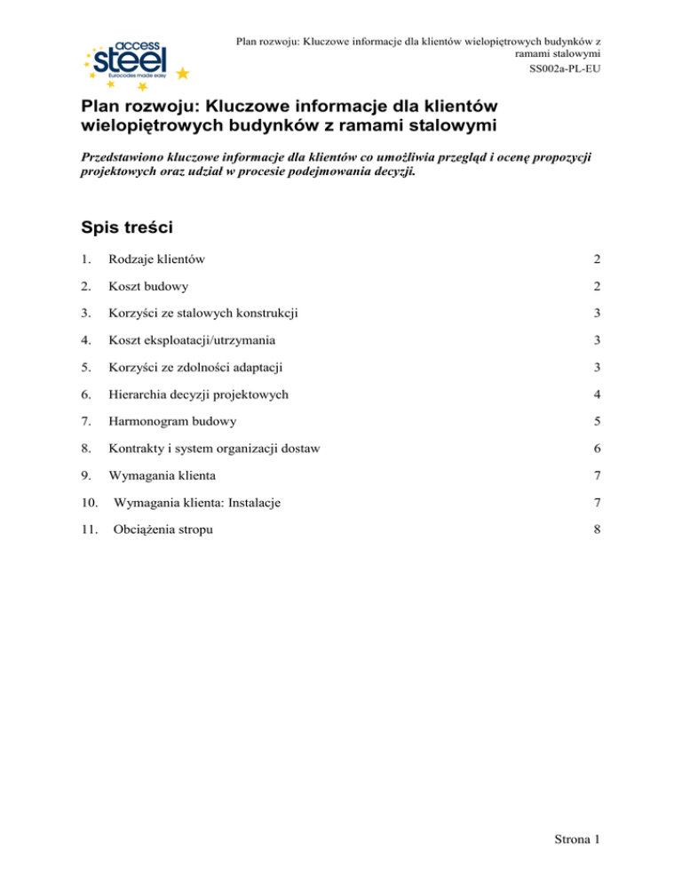 Plan rozwoju: Kluczowe informacje dla klientów wielopiętrowych budynków z ramami stalowymi SS002a-PL-EU Plan rozwoju: Kluczowe informacje dla klientów wielopiętrowych budynków z ramami stalowymi Przedstawiono kluczowe informacje dla klientów co umoŜliwia przegląd i ocenę propozycji projektowych oraz udział w procesie podejmowania decyzji. Spis treści 1. Rodzaje klientów 2 2. Koszt budowy 2 3. Korzyści ze stalowych konstrukcji 3 4. Koszt eksploatacji/utrzymania 3 5. Korzyści ze zdolności adaptacji 3 6. Hierarchia decyzji projektowych 4 7. Harmonogram budowy 5 8. Kontrakty i system organizacji dostaw 6 9. Wymagania klienta 7 10. Wymagania klienta: Instalacje 7 11. ObciąŜenia stropu 8 Strona 1 Plan rozwoju: Kluczowe informacje dla klientów wielopiętrowych budynków z ramami stalowymi SS002a-PL-EU 1. Rodzaje klientów Klienci są głównie zainteresowani kosztami i ceną. Występują dwa rodzaje klientów: Deweloperzy, którzy po cenach komercyjnych odstępują powierzchnie innym uŜytkownikom. Oni są głównie zainteresowani kosztem budowy obiektu. Większość kosztów utrzymania budynku cedowana jest na przyszłych posiadaczy. Właściciele zajmowanego lokalu, tacy jak banki albo duŜe spółki, którzy będą jedynymi albo najwaŜniejszymi uŜytkownikami budynku. Powinni być oni zainteresowani nie tylko kosztem budowy obiektu ale równieŜ kosztami utrzymania i eksploatacji. Jest jeden przypadek połączenia tych dwóch typów klientów, w którym deweloper buduje podstawową konstrukcję. Później, na podstawie oddzielnego kontraktu, montuje się instalacje i dopasowuje obiekt do wymagań uŜytkowników. Poszczególne piętra w tych budynkach mogą róŜnić się wyposaŜeniem i instalacjami. W przypadku budynków uŜyteczności publicznej jest równieŜ rosnąca tendencja do prywatnego finansowania zarówno budowy obiektu jaki jego dalszego obsługiwania, typowo przez 30-letni okres. Tacy inwestorzy wyraźnie zainteresowani kosztem eksploatacji. Oprócz spełnienia wymagań klienta, konieczne jest spełnienie lokalnych i narodowych przepisów i regulacji dotyczących projektowania i wznoszenia budynków. Na przykład, Europejska Dyrektywa dotycząca Oszczędności Energii w Budynkach ma rosnący wpływ na wybór układów ogrzewania i chłodzenia i na całościowym projektowaniu aby zmniejszyć podstawowe zuŜycie energii i produkcję CO2 i nawet by wprowadzić odnawialne technologie energii. 2. Koszt budowy PrzybliŜony podział kosztów budowy dla typowego biurowca jest następujący: Fundamenty 5-15% Konstrukcja i stropy 10-15% Obudowa i dach 15-25% Instalacje (mechaniczne i elektryczne) 15-25% Instalacje sanitarne i inne 5-10% Wykończenie, ścianki działowe, meble i sprzęty 10-20% Przygotowanie i zarządzanie placem budowy 10-15% Koszty przygotowania i zarządzania placem budowy obejmują, obsługę urządzeń, włączając Ŝurawie, magazynowanie i wyposaŜenie. Koszty te mogą się zmienić wraz ze skalą projektu i mogą wynosić 15% kosztu całkowitego dla intensywnie prowadzonej budowy stalowej konstrukcji, zmniejszając się do 10% dla większego stopnia prefabrykacji. Koszt konstrukcji ram konstrukcji nadziemnej rzadko wynosi więcej niŜ 10% z sumy kosztów, ale to ma waŜny wpływ na inne koszty. Na przykład, redukcja o 100 mm grubości całkowitej stropu moŜe prowadzić do 2,5% oszczędności w koszcie obudowy albo 0,5% oszczędności w ogólnie kosztów budowy. Strona 2 Plan rozwoju: Kluczowe informacje dla klientów wielopiętrowych budynków z ramami stalowymi SS002a-PL-EU 3. Korzyści ze stalowych konstrukcji Konstrukcja stalowa oferuje wiele korzyści klientowi/uŜytkownikowi w eksploatacji: Wolne od słupów rozpiętości, pozwalają na elastyczność w uŜytkowaniu. Łatwość dobudowy i adaptacji w przyszłości, włączając wymianę instalacji. Wariantowość obudowy i róŜne systemy pokryć dachowych. Długą trwałość obiektu i łatwość utrzymania. Efektywność energetyczna budynków. 4. Koszt eksploatacji/utrzymania Szacuje się, Ŝe łączny koszt utrzymania budynku podczas 60-letniego okresu eksploatacji moŜe być 3 do 5 razy większy od kosztu wybudowania obiektu. WaŜnymi składnikami w długoterminowych kosztach utrzymania budynku są: Bezpośrednie koszty eksploatacyjne ogrzewania, oświetlenia, klimatyzacji itp. Odnawianie wnętrz, pomniejsze malowanie co 3-5 lat, gruntowne remonty co 10-20 lat. Wymiana instalacji, w przybliŜeniu co 15-20 lat. Prawdopodobnie wymiana obudowy po 25-30 latach. Europejska Dyrektywa dotycząca Oszczędności Energii w Budynkach wymaga obecnie aby biurowce posiadały „certyfikat energetyczny” który definiuje zuŜycie i określa oszczędności energii. W wielu współczesnych budynkach są zaprojektowane rozwiązania i urządzenia oszczędzające energię, włączając podwójnie powłoki elewacji, pojemność cieplną i kominy do wentylacji naturalnej, kolektory słoneczne w pokryciu dachu itd. 5. Korzyści ze zdolności adaptacji Ogólne oczekiwania dla wszystkich wielopiętrowych budynków znacznie się zmieniają podczas ich okresu uŜytkowania. Jest teŜ prawdopodobne, Ŝe uŜytkowanie budynku zmieni się kilka razy podczas jego okresu uŜytkowania Ŝycia. Coraz częściej zmienia się charakter wykorzystania (przeznaczenie) budynków, na przykład w wielu waŜnych europejskich miastach, występuje rosnący trend by zamienić biurowce na apartamenty. W latach sześćdziesiątych i siedemdziesiątych (XX wieku), wiele budynków było zbudowanych przy do minimalnych kosztach i najmniejszych wymaganiach. Budynki te okazały się niezdolne do adaptacji na zmieniające się potrzeby uŜytkowników , co doprowadziło do ich wczesnego wyburzenia. ChociaŜ trudno jest przewidzieć moŜliwe zmiany na etapie projektu, to moŜna uzyskać widoczne korzyści stosując taką konstrukcję, która łatwo daje się przystosować w zaleŜności od wymagań podczas okresu Ŝycia konstrukcji. Kluczem
