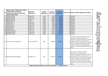 Lp 2 3 4 5 6 7 8 9 10 13 14 15 16 Nazwa, postać i dawka leku, środka spożywczego specjalnego przeznaczenia żywieniowego albo wyrobu medycznego Insuman Comb 25 Mixtard 30 Penfill Mixtard 40 Penfill Mixtard 50 Penfill Polhumin Mix - 2 Polhumin Mix - 3 Polhumin Mix - 4 Polhumin Mix - 5 Actrapid Penfill Insuman Rapid NovoMix 30 Penfill NovoMix 50 Penfill NovoRapid Penfill 17 Levemir (Insulinum detemirum) 18 Abasaglar (Insulinum glargine) Zawartość opakowania Poziom odpłatności 5 wkł.a 3 ml 5 wkł.a 3 ml 5 wkł.a 3 ml 5 x 3 ml 5 wkł.a 3 ml 5 wkł.a 3 ml 5 wkł.a 3 ml 5 wkł.a 3 ml 5 wkł.a 3 ml 5 wkł.a 3 ml 5 wkł.a 3 ml 5 wkł.po 3ml 5 wkł.a 3 ml ryczałt ryczałt ryczałt ryczałt ryczałt ryczałt ryczałt ryczałt ryczałt ryczałt ryczałt ryczałt ryczałt 5 wkł.a 3ml (Penfil) 10 wkł.po 3 ml 30% 30% Cena od 01.01.2016 Cena od Zmiana ceny Zakres wskazań objętych refundacją 01.03.2016 9,05 zł 13,26 zł 14,58 zł 14,58 zł 4,00 zł 4,00 zł 4,00 zł 4,00 zł 7,87 zł 9,05 zł 42,75 zł 42,75 zł 42,75 zł 110,88 zł 107,32 zł źródło: Ministerstwo Zdrowia, stan na 1 marca 2016 roku. 9,05 zł 13,26 zł 14,58 zł 14,58 zł 4,00 zł 4,00 zł 4,00 zł 4,00 zł 7,87 zł 9,05 zł 42,75 zł 42,75 zł 42,75 zł 110,88 zł 107,32 zł mojacukrzyca.org - - - zł zł zł zł zł zł zł zł zł zł zł zł zł Cukrzyca Cukrzyca Cukrzyca Cukrzyca Cukrzyca Cukrzyca Cukrzyca Cukrzyca Cukrzyca Cukrzyca Cukrzyca Cukrzyca Cukrzyca Cukrzyca typu I u dorosłych, młodzieży i dzieci w wieku od 2 lat i powyżej; Cukrzyca typu 2 u pacjentów leczonych insuliną NPH od co najmniej 6 miesięcy i z HbA1c ≥8% oraz cukrzyca typu 2 u zł pacjentów leczonych insuliną NPH od co najmniej 6 miesięcy i z udokumentowanymi nawracającymi epizodami ciężkiej lub nocnej hipoglikemii oraz cukrzyca o znanej przyczynie (zgodnie z definicją wg. WHO) Cukrzyca typu I u dorosłych, młodzieży i dzieci od 6 roku życia; Cukrzyca typu 2 u pacjentów leczonych insuliną NPH od co najmniej 6 miesięcy i z HbA1c ≥8% oraz cukrzyca typu 2 u zł pacjentów leczonych insuliną NPH od co najmniej 6 miesięcy i z udokumentowanymi nawracającymi epizodami ciężkiej lub nocnej hipoglikemii oraz cukrzyca typu 1 u dzieci w wieku od 2 do 6 lat oraz cukrzyca o znanej przyczynie (zgodnie z definicją wg. WHO) Nazwa, postać i dawka leku, środka spożywczego specjalnego Lp przeznaczenia żywieniowego albo wyrobu medycznego 18 Lantus (Insulinum glargine) 19 Lantus (Insulinum glargine) 20 21 22 23 24 25 26 27 28 29 30 31 32 33 34 35 36 37 38 39 40 41 42 43 Apidra Apidra Apidra SoloStar Gensulin M30 (30/70) Gensulin M30 (30/70) Gensulin M40 (40/60) Gensulin M50 (50/50) Gensulin N Gensulin N Gensulin R Gensulin R Humulin M3 (30/70) Humulin N Humulin R Insuman Basal SoloStar Insuman Comb 25 SoloStar Insuman Rapid SoloStar Polhumin N Polhumin R Insulatard Penfill Insuman Basal Humalog Humalog Mix25 Humalog Mix50 Zawartość opakowania 5 wstrzykiwaczy SoloStar po 3ml Poziom odpłatności 30% Cena od 01.01.2016 Cena od Zmiana ceny Zakres wskazań objętych refundacją 01.03.2016 72,95 zł 5 wkładów po 3ml (do 30% 72,95 zł wstrzykiwaczy OptiPen/ClickStar) ryczałt 23,96 zł 1 fiol. a 10 ml 5 wkł. a 3 ml OPTIPEN ryczałt 32,65 zł 5 wstrz.a 3 ml ryczałt 32,65 zł 1 fiol.a 10 ml ryczałt 4,87 zł 5 wkł.a 3 ml ryczałt 4,00 zł 5 wkł.a 3 ml ryczałt 4,00 zł 5 wkł.a 3 ml ryczałt 4,00 zł 1 fiol.a 10 ml ryczałt 4,87 zł 5 wkł.a 3 ml ryczałt 4,00 zł 1 fiol. po 10 ml ryczałt 4,87 zł 5 wkł.a 3 ml ryczałt 4,00 zł 5 wkł.a 3 ml ryczałt 6,01 zł 5 wkł.a 3 ml ryczałt 6,01 zł 5 wkł.a 3 ml ryczałt 6,01 zł 5 wstrz. SoloStar 3 ml ryczałt 4,00 zł 5 wstrz. SoloStar 3 ml ryczałt 4,00 zł 5 wstrz. SoloStar 3 ml ryczałt 4,00 zł 5 wkł.a 3 ml ryczałt 4,00 zł 5 wkł.a 3 ml ryczałt 4,00 zł 5 wkł.a 3 ml ryczałt 9,26 zł 5 wkł.a 3 ml ryczałt 9,05 zł 5 wkł.a 3 ml ryczałt 40,21 zł 5 wkł.a 3 ml ryczałt 40,21 zł 5 wkł.a 3 ml ryczałt 40,21 zł źródło: Ministerstwo Zdrowia, stan na 1 marca 2016 roku. 72,95 zł - 72,95 zł - 23,96 zł 32,65 zł 32,65 zł 4,87 zł 4,00 zł 4,00 zł 4,00 zł 4,87 zł 4,00 zł 4,87 zł 4,00 zł 6,01 zł 6,01 zł 6,01 zł 4,00 zł 4,00 zł 4,00 zł 4,00 zł 4,00 zł 9,26 zł 9,05 zł 40,21 zł 40,21 zł 40,21 zł mojacukrzyca.org Cukrzyca typu I u dorosłych, młodzieży i dzieci od 6 roku życia; Cukrzyca typu 2 u pacjentów leczonych insuliną NPH od co najmniej 6 zł miesięcy i z HbA1c ≥8% oraz cukrzyca typu 2 u pacjentów leczonych insuliną NPH od co najmniej 6 miesięcy i z udokumentowanymi nawracającymi epizodami ciężkiej lub nocnej hipoglikemii oraz cukrzyca typu 1 u dzieci w wieku od 2 do 6 lat oraz cukrzyca o znanej przyczynie (zgodnie z definicją wg. WHO) zł zł zł zł zł zł zł zł zł zł zł zł zł zł zł zł zł zł zł zł zł zł zł zł zł Cukrzyca Cukrzyca Cukrzyca Cukrzyca Cukrzyca Cukrzyca Cukrzyca Cukrzyca Cukrzyca Cukrzyca Cukrzyca Cukrzyca Cukrzyca Cukrzyca Cukrzyca Cukrzyca Cukrzyca Cukrzyca Cukrzyca Cukrzyca Cukrzyca Cukrzyca Cukrzyca Cukrzyca