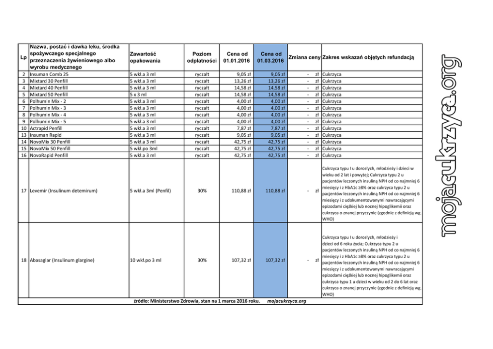 Tabela z cenami insulin od 1 marca 2016 r.
