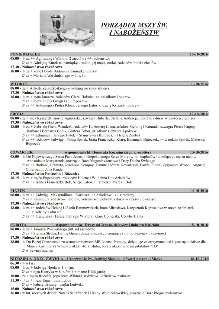PORZ¥DEK MSZY ŒW. I NABO¯EÑSTW PONIEDZIA£EK 08.00 - 1/ za ++ Agnieszkê i Wiktora, 2 ziêciów i ++ rodzeñstwo 2/ za + Adelajdê Kurek na pami¹tkê urodzin, jej mê¿a, córkê, rodziców, braci i ziêciów 17.30 - Nabo¿eñstwo ró¿añcowe 18.00 - 1/ za + ¿onê Dorotê Badura na pami¹tkê urodzin 2/ za + Mariana Warchulskiego w 1. r. œm. 10-10-2016 WTOREK 08.00 - za + Alfreda Zaj¹czkoskiego w kolejn¹ rocznicê œmierci 17.30 - Nabo¿eñstwo ró¿añcowe 18.00 - 1/ za + syna Janusza, rodziców Giera, Hakuba, ++ dziadków i pokrew. 2/ za + mê¿a Leona Grygiel i ++ z pokrew. 3/ za ++ Antoniego i Piotra Kloza, Jerzego Latosik, £ucjê Ksi¹¿ek i pokrew. 11-10-2016 ŒRODA 12-10-2016 08.00 - za + ojca Ryszarda, siostrê Agnieszkê, szwagra Huberta, Stefana, Andrzeja, pokrew. i dusze w czyœæcu cierpi¹ce 17.30 - Nabo¿eñstwo ró¿añcowe 18.00 - 1/ za + Gabrielê Giera-Wandzik, rodziców Kazimierê i Jana, teœciów Stefaniê i Konrada, szwagra Piotra Kupny, Barbarê i Bernarda Copik, Gintera Tobor, dziadków z obu str. i pokrew. 2/ za ++ Edmunda i Jerzego Pytel, + Stanis³awa i Konrada, + Helenê Zdebel 3/ za ++ rodziców Jadwigê i Piotra Spa³ek, brata Franciszka, Klarê, Emanuela Bujoczek, ++ z rodzin Spa³ek, Maleska, Bujoczek CZWARTEK wspomnienie b³. Honorata KoŸmiñskiego, prezbitera 13-10-2016 08.00 - 1/ Do Najœwiêtszego Serca Pana Jezusa i Niepokalanego Serca Maryi w int. kap³anów i modl¹cych siê za nich w Apostolacie Margaretek, prosz¹c o Bo¿e b³ogos³awieñstwo i Dary Ducha Œwiêtego 2/ za ++ Barbarê, Helmuta, Joachima Kempny, Danutê i Józefa Kowalczyk, Paw³a, Piotra, Zygmunta Wróbel, Augustê Opfermann, Jana Kinder 17.30 - Nabo¿eñstwo Fatimskie i Ró¿aniec 18.15 - 1/ za + mê¿a Eugeniusza, rodziców Helenê i Wilhelma i ++ dziadków 2/ za ++ Annê i Franciszka Bok, Alicjê Tabor, ++ z rodzin Marek i Bok PI¥TEK 14-10-2016 08.00 - 1/ za ++ Jadwigê, Maksymiliana i Dariusza, ++ dziadków i ++ z rodziny 2/ za + Rajnholda, rodziców, teœciów, rodzeñstwo, pokrew. i dusze w czyœæcu cierpi¹ce 17.30 - Nabo¿eñstwo ró¿añcowe 18.00 - 1/ za ++ rodziców Helenê i Józefa Baranowskich, brata Miros³awa, Krzysztofa Kapuœcioka w rocznicê œmierci, ++ z rodziny z obu str. 2/ za ++ Franciszka, Teresê Pietryga, Wiktora, Klarê Gomerski, Cecyliê Hajda SOBOTA wspomnienie œw. Teresy od Jezusa, dziewicy i doktora Koœcio³a 15-10-2016 08.00 - 1/ za + Janusza Poremskiego (int. od s¹siadów) 2/ za + Stefana Stroka, Halinê Giera i dusze w czyœæcu cierpi¹ce (int. od kuzynek i kuzynów) 17.30 - Nabo¿eñstwo ró¿añcowe 18.00 - 1/ Do Bo¿ej Opatrznoœci za wstawiennictwem MB Nieust. Pomocy, dziêkuj¹c za otrzymane ³aski, prosz¹c o dalsze dla Marii i Kazimierza Wójcik z okazji 40. r. œlubu, oraz z okazji urodzin jubilatów /TD/ 2/ w pewnej intencji NIEDZIELA XXIX ZWYK£A - Uroczystoœæ œw. Jadwigi Œl¹skiej, g³ównej patronki Œl¹ska 06.30 - w o l n a 08.00 - 1/ za + Jadwigê Herda w 1. r. œm. 2/ za + ojca Henryka w 8. r. œm. i + mamê Hildegardê 10.00 - za + mê¿a Rudolfa, jego brata Wiktora, rodziców i dziadków z obu str. 11.30 - 1/ za + mê¿a Eugeniusza Lubos 2/ za + babciê Urszulê i wujka Ludwika 15.00 - Nabo¿eñstwo ró¿añcowe 16.00 - w int. rocznych dzieci: Natalii Schafranek i Hanny Wojciechowskiej, prosz¹c o Bo¿e b³ogos³awieñstwo 16-10-2016 Niedziela XXVIII Zwyk³a - 09-10-2016 06.30 - za + syna Antoniego, rodziców Piotra i Gertrudê, syna Paw³a, rodziców Annê i Walentego, syna Herberta, synow¹ Jadwigê, pokrew., + Adelajdê na pami¹tkê urodzin 08.00 - za ++ Bertê, Jakuba, synów Antoniego, Gerarda, synow¹ Urszulê, ziêcia Alojzego, Martê, Antoniego, synów Jana, Alojzego, córkê Gertrudê, ziêcia Feliksa, ++ z rodziny i dusze w czyœæcu cierpi¹ce 10.00 - 1/ za + Wiktoriê Zawielak w 1. r. œmierci 2/ za + Karola Stroka, Joannê Brzezina, Stefana i Mariê Stroka, Emanuela i Petronelê Brzezina, ++ z rodzin Stroka, Brzezina, Wystrach 11.30 - Do Bo¿ej Opatrznoœci za wstawiennictwem MB Nieust. Pomocy, dziêkuj¹c za otrzymane ³aski, prosz¹c o dalsze dla Danuty i Andrzeja z okazji 20. r. œlubu, dla babci Irmgardy i Jadwigi z okazji urodzin, oraz o Bo¿e b³ogos³awieñstwo i Dary Ducha Œwiêtego dla ca³ej rodziny /TD/ 13.00 - œlub: Waloszczyk Robert - Styrnalska Dominika 15.00 - Nabo¿eñstwo Ró¿añcowe 16.00 - Do Bo¿ej Opatrznoœci za wstawiennictwem MB Nieust. Pomocy, dziêkuj¹c za otrzymane ³aski, prosz¹c o dalsze dla Anny i Bernarda Szulc z okazji 1. r. œlubu Og³oszenia duszpasterskie 1/ Serdecznie zapraszamy dzieci, m³odzie¿ i doros³ych do udzia³u w nabo¿eñstwach ró¿añcowych - dziœ o 15.00, a od poniedzia³ku do soboty o 17.30. 2/ Dzisiejsza kolekta przeznaczona jest na potrzeby naszej parafii. Bóg zap³aæ za sk³adane ofiary. 3/ Dziœ prze¿ywamy Dzieñ Papieski. W przysz³¹ niedzielê po Mszach œw. odbêdzie siê zbiórka do puszek na rzecz Fundacji Dzie³o Nowego Tysi¹clecia, która wspiera dzieci i m³odzie¿ pochodz¹ce z rodzin ubogich. 4/ W trwaj¹cym Roku Mi³osierdzia zapraszamy parafian codziennie na g. 15.00 na Koronkê do Mi³osierdzia Bo¿ego, oraz adoracjê Najœw. Sakramentu (do godz. 18.00). W tym czasie jest równie¿ okazja do Spowiedzi. 5/ Spotkania klas III gimnazjum przed bierzmowaniem: w poniedzia³ek o 16.45 - ch³opcy, we wtorek o 16.45 - dziewczyny. 6/ W Czwartek na godz. 17.30 serdecznie zapraszamy parafian i goœci na ostatnie w tym roku NABO¯EÑSTWO FATIMSKIE i Ró¿aniec. Msza Œw. wieczorna w tym dniu bêdzie wyj¹tkowo po nabo¿eñstwie - o 18.15. 7/ W pi¹tek przypada Dzieñ Edukacji Narodowej. zachêcamy do modlitwy w int. nauczycieli i wychowawców. 8/ W pi¹tek o 18.00 - Msza œw. SZKOLNA. O 19.00 - spotkanie Oazy i KSM. 9/ W sobotê - Pielgrzymka Apostolstwa Powo³aniowego im. ks. Teodora Christopha do Miasteczka Œl. 10/ W sobotê na Jasnej Górze odbêdzie siê “Pokuta Narodowa”. Szczegó³y - na plakacie oraz w najnowszym Go