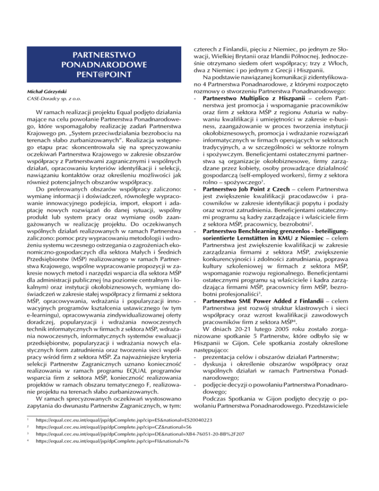 PARTNERSTWO PONADNARODOWE PENT@POINT Michał Górzyński CASE-Doradcy sp. z o.o. W ramach realizacji projektu Equal podjęto działania mające na celu powołanie Partnerstwa Ponadnarodowego, które wspomagałoby realizację zadań Partnerstwa Krajowego pn. „System przeciwdziałania bezrobociu na terenach słabo zurbanizowanych”. Realizacja wstępnego etapu prac skoncentrowała się na sprecyzowaniu oczekiwań Partnerstwa Krajowego w zakresie obszarów współpracy z Partnerstwami zagranicznymi i wspólnych działań, opracowaniu kryteriów identyfikacji i selekcji, nawiązaniu kontaktów oraz określeniu możliwości jak również potencjalnych obszarów współpracy. Do preferowanych obszarów współpracy zaliczono: wymianę informacji i doświadczeń, równoległe wypracowanie innowacyjnego podejścia, import, eksport i adaptację nowych rozwiązań do danej sytuacji, wspólny produkt lub system pracy oraz wymianę osób zaangażowanych w realizację projektu. Do oczekiwanych wspólnych działań realizowanych w ramach Partnerstwa zaliczono: pomoc przy wypracowaniu metodologii i wdrożeniu systemu wczesnego ostrzegania o zagrożeniach ekonomiczno-gospodarczych dla sektora Małych i Średnich Przedsiębiorstw (MŚP) realizowanego w ramach Partnerstwa Krajowego, wspólne wypracowanie propozycji w zakresie nowych metod i narzędzi wsparcia dla sektora MŚP dla administracji publicznej (na poziomie centralnym i lokalnym) oraz instytucji okołobiznesowych, wymianę doświadczeń w zakresie stałej współpracy z firmami z sektora MŚP, opracowywania, wdrażania i popularyzacji innowacyjnych programów kształcenia ustawicznego (w tym e-learningu), opracowywania zindywidualizowanej oferty doradczej, popularyzacji i wdrażania nowoczesnych technik informatycznych w firmach z sektora MŚP, wdrażania nowoczesnych, informatycznych systemów ewaluacji przedsiębiorstw, popularyzacji i wdrażania nowych elastycznych form zatrudnienia oraz tworzenia sieci współpracy wśród firm z sektora MŚP. Za najważniejsze kryteria selekcji Partnerstw Zagranicznych uznano konieczność realizowania w ramach programu EQUAL programów wsparcia firm z sektora MŚP, konieczność realizowania projektów w ramach obszaru tematycznego F, realizowanie projektu na terenach słabo zurbanizowanych. W ramach sprecyzowanych oczekiwań wystosowano zapytania do dwunastu Partnerstw Zagranicznych, w tym: czterech z Finlandii, pięciu z Niemiec, po jednym ze Słowacji, Wielkiej Brytanii oraz Irlandii Północnej. Jednocześnie otrzymano siedem ofert współpracy; trzy z Włoch, dwa z Niemiec i po jednym z Grecji i Hiszpanii. Na podstawie nawiązanej komunikacji zidentyfikowano 4 Partnerstwa Ponadnarodowe, z którymi rozpoczęto rozmowy o stworzeniu Partnerstwa Ponadnarodowego: - Partnerstwo Multiplico z Hiszpanii – celem Partnerstwa jest promocja i wspomaganie pracowników oraz firm z sektora MŚP z regionu Asturia w nabywaniu kwalifikacji i umiejętności w zakresie e-business, zaangażowanie w proces tworzenia instytucji okołobiznesowych, promocja i wdrażanie rozwiązań informatycznych w firmach operujących w sektorach tradycyjnych, a w szczególności w sektorze rolnym i spożywczym. Beneficjentami ostatecznymi partnerstwa są organizacje okołobiznesowe, firmy zarządzane przez kobiety, osoby prowadzące działalność gospodarczą (self-employed workers), firmy z sektora rolno – spożywczego1. - Partnerstwo Job Point z Czech – celem Partnerstwa jest zwiększenie kwalifikacji pracodawców i pracowników w zakresie identyfikacji popytu i podaży oraz wzrost zatrudnienia. Beneficjentami ostatecznymi programu są kadry zarządzające i właściciele firm z sektora MŚP, pracownicy, bezrobotni2. - Partnerstwo Benchlearning grenzenlos - beteiligungsorientierte Lernstätten in KMU z Niemiec – celem Partnerstwa jest zwiększenie kwalifikacji w zakresie zarządzania firmami z sektora MŚP, zwiększenie konkurencyjności i zdolności zatrudniania, poprawa kultury szkoleniowej w firmach z sektora MŚP, wspomaganie rozwoju regionalnego. Beneficjentami ostatecznymi programu są właściciele i kadra zarządzająca firmami MŚP, pracownicy firm MŚP, bezrobotni profesjonaliści3. - Partnerstwo SME Power Added z Finlandii – celem Partnerstwa jest rozwój struktur klastrowych i sieci współpracy oraz wzrost kwalifikacji zawodowych pracowników firm z sektora MŚP4. W dniach 20-21 lutego 2005 roku zostało zorganizowane spotkanie 5 Partnerstw, które odbyło się w Hiszpanii w Gijon. Cele spotkania zostały określone następująco: - prezentacja celów i obszarów działań Partnerstw; - dyskusja i określenie obszarów współpracy oraz wspólnych działań w ramach Partnerstwa Ponadnarodowego; - podjęcie decyzji o powołaniu Partnerstwa Ponadnarodowego; Podczas Spotkania w Gijon podjęto decyzję o powołaniu Partnerstwa Ponadnarodowego. Przedstawiciele 1 https://equal.cec.eu.int/equal/jsp/dpComplete.jsp?cip=ES&national=ES20040223 2 https://equal.cec.eu.int/equal/jsp/dpComplete.jsp?cip=CZ&national=56 https://equal.cec.eu.int/equal/jsp/dpComplete.jsp?cip=DE&national=XB4-76051-20-BB%2F207 https://equal.cec.eu.int/equal/jsp/dpComplete.jsp?cip=FI&national=76 3 4 10 wszystkich Partnerstw zgłosili deklaracje uczestniczenia w Partnerstwie. W ramach poczynionych ustaleń określono cele i formy współpracy Partnerstwa Ponadnarodowego, sprecyzowano zakres zadań Partnerów, określono wspólne produkty Partnerstwa Ponadnarodowego, budżet działań, sposób ewaluacji działań projektu oraz zasady funkcjonowania Partnerstwa (w tym m. in. zasady rozliczeń, sposób komunikacji, model zarządzania Partnerstwem). W dniu 15 kwietnia 2005 roku wszystkie Partnerstwa Krajowe zaakceptowały wspólnie opracowaną umowę o Partnerstwie Ponadnarodowym (TCA). Umowa reguluje cele i zasady funkcjonowania Partnerstwa Ponadnarodowego w oparciu o założenia ustalone podczas spotkania w Gijon. Do najważniejszych postanowień umowy z