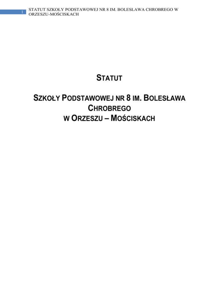 1 STATUT SZKOŁY PODSTAWOWEJ NR 8 IM. BOLESŁAWA CHROBREGO W ORZESZU-MOŚCISKACH STATUT SZKOŁY PODSTAWOWEJ NR 8 IM. BOLESŁAWA CHROBREGO W ORZESZU – MOŚCISKACH 2 STATUT SZKOŁY PODSTAWOWEJ NR 8 IM. BOLESŁAWA CHROBREGO W ORZESZU-MOŚCISKACH SPIS TREŚCI Rozdział I - Postanowienia ogólne ...................................................... 3 Rozdział II - Cele i zadania szkoły ...................................................... 3 Rozdział III - Organy szkoły ................................................................ 6 Rozdział IV - Współpraca rodziców i nauczycieli ................................ 9 Rozdział V - Organizacja szkoły ....................................................... 10 Rozdział VI - Nauczyciele i inni pracownicy szkoły........................... 30 Rozdział VII - Uczniowie szkoły ........................................................ 36 Rozdział VIII - Oddział przedszkolny ................................................ 42 Rozdział IX - Postanowienia końcowe .............................................. 44 3 STATUT SZKOŁY PODSTAWOWEJ NR 8 IM. BOLESŁAWA CHROBREGO W ORZESZU-MOŚCISKACH Rozdział I - Postanowienia ogólne §1 1. Placówka nosi nazwę - Szkoła Podstawowa nr 8 im. Bolesława Chrobrego w Orzeszu – Mościskach. 2. Szkole nadano imię Bolesława Chrobrego 7 września 1968 roku. 3. Siedziba Szkoły Podstawowej nr 8 im. Bolesława Chrobrego w Orzeszu, zwanej dalej szkołą mieści się w Orzeszu – Mościskach przy ul. Chrobrego 64. 4. Szkoła posiada własną pieczęć. 5. Organem prowadzącym Szkołę Podstawową nr 8 im. Bolesława Chrobrego jest Gmina Orzesze. 6. Organem nadzoru pedagogicznego jest Kuratorium Oświaty w Katowicach, delegatura w Rybniku. 7. Szkoła jest jednostką budżetową. 8. Szkoła kształci uczniów w oddziałach w cyklu sześcioletnim. 9. Szkoła prowadzi oddział przedszkolny. 10. Szkoła może organizować działalność innowacyjną i eksperymentalną zgodnie z obowiązującymi przepisami w sprawie zasad i warunków prowadzenia działalności innowacyjnej i eksperymentalnej przez szkoły i placówki publiczne. 11. W szkole mogą być realizowane dodatkowe zajęcia edukacyjne i nadobowiązkowe zajęcia pozalekcyjne. Rozdział II - Cele i zadania szkoły §2 Szkoła realizuje cele i zadania określone w ustawie o systemie oświaty oraz przepisach wydanych na jej podstawie. 1. Celem szkoły jest w szczególności: 1) umożliwienie zdobycia wiedzy i umiejętności niezbędnych do uzyskania świadectwa ukończenia szkoły, 2) umacnianie wiary we własne siły i możliwości osiągnięcia sukcesów oraz dążenia do osiągania celów, 3) rozwijanie wrażliwości moralnej, 4) rozwijanie wrażliwości estetycznej, 5) wzmacnianie poczucia tożsamości kulturowej, historycznej, narodowej i etnicznej dziecka, 6) rozwijanie umiejętności poznawania siebie oraz otoczenia rodzinnego, społecznego, kulturowego, technicznego i przyrodniczego dostępnego doświadczeniu dziecka, 7) wyposażenie uczniów w wiedzę i umiejętności stosownie do ich rozwoju i zdolności, 8) rozbudzanie potrzeb korzystania z dzieł myśli ludzkiej i dóbr kultury, rozwijanie wrażliwości estetycznej i zdolności twórczego myślenia, zachęcanie uczniów do samokształcenia, 9) umożliwianie poznania języka i metodologii dziedzin wiedzy, 10) ułatwianie rozumienia i poznawania samego siebie, znajdowania swego miejsca w społeczeństwie, 11) przyjmowania odpowiedzialności za siebie i innych, 4 STATUT SZKOŁY PODSTAWOWEJ NR 8 IM. BOLESŁAWA CHROBREGO W ORZESZU-MOŚCISKACH 11) ułatwianie uczestnictwa w kulturze, sztuce, kulturze fizycznej i sporcie, 12) rozwijanie wrażliwości moralnej, otwartości na poglądy i potrzeby innych ludzi, 13) ukształtowanie racjonalnego podejścia do problemów życiowych, w tym do kryzysów okresu dojrzewania i umiejętności ich rozwiązywania. 2. Zadaniem szkoły jest w szczególności: 1) zapewnienie opieki i wspomagania rozwoju dziecka w przyjaznym, bezpiecznym i zdrowym środowisku, poczuciu więzi z rodziną, 2) uwzględnianie indywidualnych potrzeb dziecka, troska o zapewnienie równych szans, 3) stwarzanie warunków do rozwijania samodzielności, obowiązkowości, podejmowania odpowiedzialności za siebie i najbliższe otoczenie, 4) stwarzanie warunków do indywidualnego i grupowego działania na rzecz innych dzieci, 5) stwarzanie warunków do rozwoju wyobraźni, fantazji oraz ekspresji plastycznej, muzycznej i ruchowej, 6) inspirowanie aktywności badawczej oraz wyrażania myśli i przeżyć, 7) zapewnienie warunków do harmonijnego rozwoju fizycznego i psychicznego oraz zachowań prozdrowotnych. 8) stworzenie uczniom warunków do nabywania oraz utrwalania wiedzy i umiejętności stosownie do ich możliwości psychofizycznych, 9) kształtowanie postawy dociekliwości i refleksyjności, 10) zapewnienie młodzieży możliwości korzystania z technologii informatycznej i komunikacyjnej na lekcjach różnych przedmiotów i zajęciach pozalekcyjnych, 11) poszerzanie wiedzy i umiejętności związanych ze zdrowymi stylami życia i profilaktyką zaburzeń, także patologii społecznej, 12) rozwijanie poczucia odpowiedzialności i miłości do ojczyzny, 13) umożliwienie uczniom podtrzymywania poczucia tożsamości narodowej, etnicznej, językowej i religijnej, a przede wszystkim nauki języka ojczystego i gwary śląskiej oraz własnej historii i kultury, 14) kształtowanie tolerancji wobec jednostki, grupy społecznej, narodu, rasy i państwa, 15) realizowanie podstawy programowej kształcenia ogólnego dla sześcioletnich szkół podstawowych 16) organizowanie zajęć nadobowiązkowych i pozalekcyjnych do wyboru przez uczniów i rodziców 17) przestrzeganie zasady oceniania, klasyfikowania i promowania uczniów, przeprowadzanie sprawdzianów, 18) umożliwianie uczniom szczególnie uzdolnionym realizacji obowiązku szkolnego indywidualnym tokiem lub programem nauki oraz ukończenie szkoł