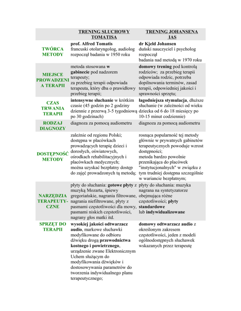 TRENING SŁUCHOWY TRENING JOHANSENA TOMATISA IAS prof. Alfred Tomatis dr Kjeld Johansen TWÓRCA francuski otolaryngolog, audiolog duński nauczyciel i psycholog METODY rozpoczął badania w 1950 roku rozpoczął badania nad metodą w 1970 roku metoda stosowana w domowy trening pod kontrolą gabinecie pod nadzorem rodziców; za przebieg terapii MIEJSCE terapeuty; odpowiada rodzic, potrzeba PROWADZENI za przebieg terapii odpowiada dopilnowania terminów, zasad A TERAPII terapeuta, który dba o prawidłowy terapii, odpowiedniej jakości i przebieg terapii; sprawności sprzętu; intensywne słuchanie w krótkim łagodniejsza stymulacja, dłuższe CZAS czasie (45 godzin po 2 godziny słuchanie (w zależności od wieku TRWANIA dziennie z przerwą 3-5 tygodniową dziecka od 6 do 18 miesięcy po TERAPII po 30 godzinach) 10-15 minut codziennie) RODZAJ diagnoza za pomocą audiometru diagnoza za pomocą audiometru DIAGNOZY zależnie od regionu Polski; rosnąca popularność tej metody dostępna w placówkach głównie w prywatnych gabinetów prowadzących terapię dzieci i terapeutycznych powoduje wzrost dorosłych, oświatowych, dostępności; DOSTĘPNOŚĆ ośrodkach rehabilitacyjnych i metoda bardzo powolnie METODY placówkach medycznych; przenikająca do placówek można uzyskać bezpłatny dostęp "instytucjonalnych" w związku z do zajęć prowadzonych tą metodą; tym trudniej dostępna szczególnie w wariancie bezpłatnym; płyty do słuchania: gotowe płyty z płyty do słuchania: muzyka muzyką Mozarta, śpiewy nagrana na syntetyzatorze NARZĘDZIA gregoriańskie, nagrania filtrowane, obejmująca różne TERAPEUTY- nagrania niefiltrowane, płyty z częstotliwości; płyty CZNE pasmami częstotliwości dla mowy, standardowe pasmami niskich częstotliwości, lub indywidualizowane nagrany głos matki itd. SPRZĘT DO wysokiej jakości odtwarzacz domowy odtwarzacz audio z TERAPII audio, markowe słuchawki określonym zakresem modyfikowane do odbioru częstotliwości, jeden z modeli dźwięku drogą przewodnictwa ogólnodostępnych słuchawek kostnego i powietrznego, wskazanych przez terapeutę urządzenie zwane Elektronicznym Uchem służącym do modyfikowania dźwięków i dostosowywania parametrów do tworzenia indywidualnego planu terapeutycznego; faza pasywnego słuchania oraz faza aktywna z PRZEBIEG wykorzystaniem Ucha TERAPII Elektronicznego - aktywny udział dziecka w sesjach z mikrofonem podczas fazy pasywnego CO MOŻEMY słuchania można:rozmawiać, ROBIĆ bawić się, grać w gry planszowe, PODCZAS rysować, malować, układać puzzle TRWANIA i układanki; nie jemy ale możemy SESJI pić, nie piszemy ani nie czytamy TERAPEUTYC podczas fazy aktywnej: ZNEJ czytamy, powtarzamy słowa, teksty, pracujemy z głosem WIEK od około 3 roku życia w górę KONTROLA test kontrolny po każdym z etapów POSTĘPÓW / TESTY KONTROLNE skumulowana odpłatność za każdy KOSZTY z etapów treningu (diagnostyka TERAPII plus koszt godziny terapii) tylko słuchanie pasywne podczas słuchania należy: odprężyć się, nie rozmawiamy, nie jemy, nie pijemy, nie oglądamy telewizji, nie czytamy, nie piszemy; możemy malować, rysować, lepić z plasteliny od około 3 roku życia w górę test kontrolny co 4-10 tygodni w zależności od wieku dziecka koszty rozłożone w czasie (diagnostyka plus koszt kolejnych płyt) źródło: http://integracjasensoryczna.org/html/tomatis/tomatis-johansen.html