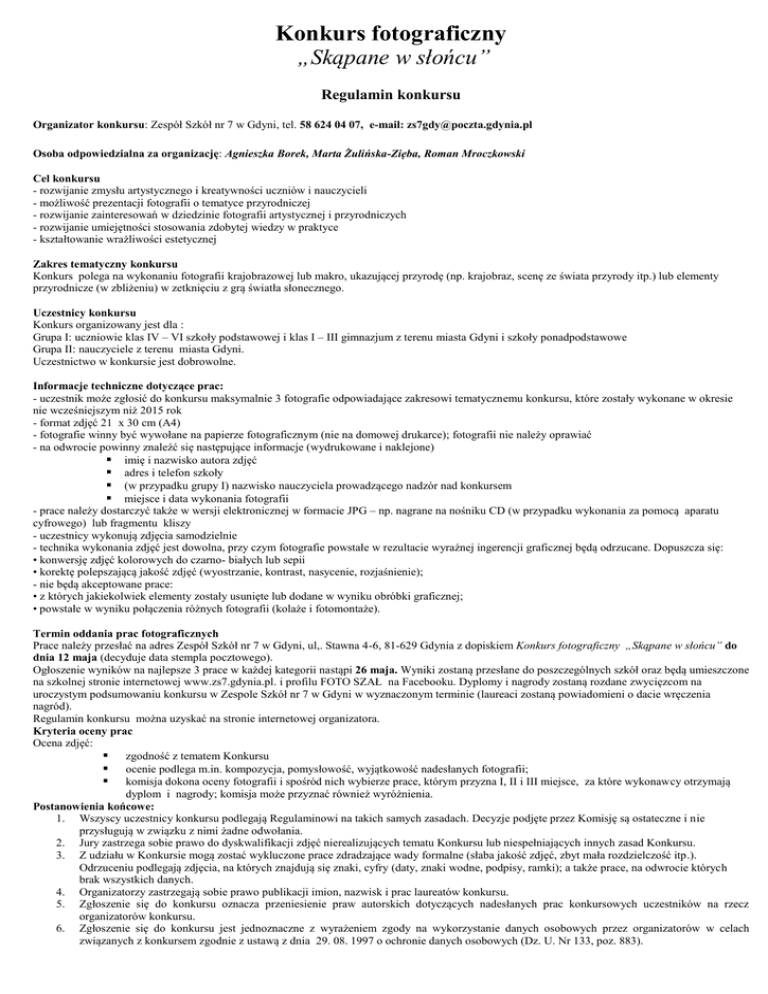 Konkurs fotograficzny „Skąpane w słońcu” Regulamin konkursu Organizator konkursu: Zespół Szkół nr 7 w Gdyni, tel. 58 624 04 07, e-mail: [email protected] Osoba odpowiedzialna za organizację: Agnieszka Borek, Marta Żulińska-Zięba, Roman Mroczkowski Cel konkursu - rozwijanie zmysłu artystycznego i kreatywności uczniów i nauczycieli - możliwość prezentacji fotografii o tematyce przyrodniczej - rozwijanie zainteresowań w dziedzinie fotografii artystycznej i przyrodniczych - rozwijanie umiejętności stosowania zdobytej wiedzy w praktyce - kształtowanie wrażliwości estetycznej Zakres tematyczny konkursu Konkurs polega na wykonaniu fotografii krajobrazowej lub makro, ukazującej przyrodę (np. krajobraz, scenę ze świata przyrody itp.) lub elementy przyrodnicze (w zbliżeniu) w zetknięciu z grą światła słonecznego. Uczestnicy konkursu Konkurs organizowany jest dla : Grupa I: uczniowie klas IV – VI szkoły podstawowej i klas I – III gimnazjum z terenu miasta Gdyni i szkoły ponadpodstawowe Grupa II: nauczyciele z terenu miasta Gdyni. Uczestnictwo w konkursie jest dobrowolne. Informacje techniczne dotyczące prac: - uczestnik może zgłosić do konkursu maksymalnie 3 fotografie odpowiadające zakresowi tematycznemu konkursu, które zostały wykonane w okresie nie wcześniejszym niż 2015 rok - format zdjęć 21 x 30 cm (A4) - fotografie winny być wywołane na papierze fotograficznym (nie na domowej drukarce); fotografii nie należy oprawiać - na odwrocie powinny znaleźć się następujące informacje (wydrukowane i naklejone) imię i nazwisko autora zdjęć adres i telefon szkoły (w przypadku grupy I) nazwisko nauczyciela prowadzącego nadzór nad konkursem miejsce i data wykonania fotografii - prace należy dostarczyć także w wersji elektronicznej w formacie JPG – np. nagrane na nośniku CD (w przypadku wykonania za pomocą aparatu cyfrowego) lub fragmentu kliszy - uczestnicy wykonują zdjęcia samodzielnie - technika wykonania zdjęć jest dowolna, przy czym fotografie powstałe w rezultacie wyraźnej ingerencji graficznej będą odrzucane. Dopuszcza się: • konwersję zdjęć kolorowych do czarno- białych lub sepii • korektę polepszającą jakość zdjęć (wyostrzanie, kontrast, nasycenie, rozjaśnienie); - nie będą akceptowane prace: • z których jakiekolwiek elementy zostały usunięte lub dodane w wyniku obróbki graficznej; • powstałe w wyniku połączenia różnych fotografii (kolaże i fotomontaże). Termin oddania prac fotograficznych Prace należy przesłać na adres Zespół Szkół nr 7 w Gdyni, ul,. Stawna 4-6, 81-629 Gdynia z dopiskiem Konkurs fotograficzny „Skąpane w słońcu” do dnia 12 maja (decyduje data stempla pocztowego). Ogłoszenie wyników na najlepsze 3 prace w każdej kategorii nastąpi 26 maja. Wyniki zostaną przesłane do poszczególnych szkół oraz będą umieszczone na szkolnej stronie internetowej www.zs7.gdynia.pl. i profilu FOTO SZAŁ na Facebooku. Dyplomy i nagrody zostaną rozdane zwycięzcom na uroczystym podsumowaniu konkursu w Zespole Szkół nr 7 w Gdyni w wyznaczonym terminie (laureaci zostaną powiadomieni o dacie wręczenia nagród). Regulamin konkursu można uzyskać na stronie internetowej organizatora. Kryteria oceny prac Ocena zdjęć: zgodność z tematem Konkursu ocenie podlega m.in. kompozycja, pomysłowość, wyjątkowość nadesłanych fotografii; komisja dokona oceny fotografii i spośród nich wybierze prace, którym przyzna I, II i III miejsce, za które wykonawcy otrzymają dyplom i nagrody; komisja może przyznać również wyróżnienia. Postanowienia końcowe: 1. Wszyscy uczestnicy konkursu podlegają Regulaminowi na takich samych zasadach. Decyzje podjęte przez Komisję są ostateczne i nie przysługują w związku z nimi żadne odwołania. 2. Jury zastrzega sobie prawo do dyskwalifikacji zdjęć nierealizujących tematu Konkursu lub niespełniających innych zasad Konkursu. 3. Z udziału w Konkursie mogą zostać wykluczone prace zdradzające wady formalne (słaba jakość zdjęć, zbyt mała rozdzielczość itp.). Odrzuceniu podlegają zdjęcia, na których znajdują się znaki, cyfry (daty, znaki wodne, podpisy, ramki); a także prace, na odwrocie których brak wszystkich danych. 4. Organizatorzy zastrzegają sobie prawo publikacji imion, nazwisk i prac laureatów konkursu. 5. Zgłoszenie się do konkursu oznacza przeniesienie praw autorskich dotyczących nadesłanych prac konkursowych uczestników na rzecz organizatorów konkursu. 6. Zgłoszenie się do konkursu jest jednoznaczne z wyrażeniem zgody na wykorzystanie danych osobowych przez organizatorów w celach związanych z konkursem zgodnie z ustawą z dnia 29. 08. 1997 o ochronie danych osobowych (Dz. U. Nr 133, poz. 883).