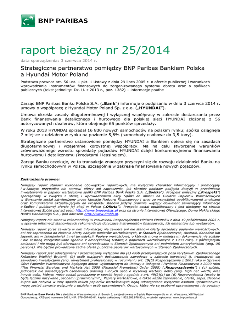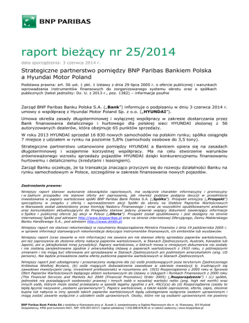 raport bieżący nr 25/2014 data sporządzenia: 3 czerwca 2014 r. Strategiczne partnerstwo pomiędzy BNP Paribas Bankiem Polska a Hyundai Motor Poland Podstawa prawna: art. 56 ust. 1 pkt. 1 Ustawy z dnia 29 lipca 2005 r. o ofercie publicznej i warunkach wprowadzania instrumentów finansowych do zorganizowanego systemu obrotu oraz o spółkach publicznych (tekst jednolity: Dz. U. z 2013 r., poz. 1382) – informacje poufne Zarząd BNP Paribas Banku Polska S.A. („Bank”) informuje o podpisaniu w dniu 3 czerwca 2014 r. umowy o współpracę z Hyundai Motor Poland Sp. z o.o. („HYUNDAI”). Umowa określa zasady długoterminowej i wyłącznej współpracy w zakresie dostarczania przez Bank finansowania detalicznego i hurtowego dla polskiej sieci HYUNDAI złożonej z 56 autoryzowanych dealerów, która obejmuje 65 punktów sprzedaży. W roku 2013 HYUNDAI sprzedał 16 830 nowych samochodów na polskim rynku; spółka osiągnęła 7 miejsce z udziałem w rynku na poziomie 5,8% (samochody osobowe do 3,5 tony). Strategiczne partnerstwo ustanowione pomiędzy HYUNDAI a Bankiem opiera się na zasadach długoterminowej i wzajemnie korzystnej współpracy. Ma na celu stworzenie warunków zrównoważonego wzrostu sprzedaży pojazdów HYUNDAI dzięki konkurencyjnemu finansowaniu hurtowemu i detalicznemu (kredytami i leasingiem). Zarząd Banku oczekuje, że ta transakcja znacząco przyczyni się do rozwoju działalności Banku na rynku samochodowym w Polsce, szczególnie w zakresie finansowania nowych pojazdów. Zastrzeżenie prawne: Niniejszy raport stanowi wykonanie obowiązków raportowych, ma wyłącznie charakter informacyjny i promocyjny i w żadnym przypadku nie stanowi oferty ani zaproszenia, jak również podstaw podjęcia decyzji w przedmiocie inwestowania w papiery wartościowe spółki BNP Paribas Bank Polska S.A. („Spółka”). Prospekt emisyjny („Prospekt”) sporządzony w związku z ofertą i wprowadzeniem akcji Spółki do obrotu na Giełdzie Papierów Wartościowych w Warszawie został zatwierdzony przez Komisję Nadzoru Finansowego i wraz ze wszystkimi opublikowanymi aneksami oraz komunikatami aktualizującymi do Prospektu stanowi jedyny prawnie wiążący dokument zawierający informacje o Spółce i publicznej ofercie jej akcji w Polsce („Oferta”). Prospekt został opublikowany i jest dostępny na stronie internetowej Spółki pod adresem http://www.bnpparibas.pl oraz na stronie internetowej Oferującego, Domu Maklerskiego Banku Handlowego S.A., pod adresem http://www.dmbh.pl. Niniejszy raport nie stanowi rekomendacji w rozumieniu Rozporządzenia Ministra Finansów z dnia 19 października 2005 r. w sprawie informacji stanowiących rekomendacje dotyczące instrumentów finansowych, ich emitentów lub wystawców. Niniejszy raport (oraz zawarte w nim informacje) nie zawiera ani nie stanowi oferty sprzedaży papierów wartościowych, ani też zaproszenia do złożenia oferty nabycia papierów wartościowych, w Stanach Zjednoczonych, Australii, Kanadzie lub Japonii, ani w jakiejkolwiek innej jurysdykcji. Papiery wartościowe, o których mowa w niniejszym dokumencie nie zostały i nie zostaną zarejestrowane zgodnie z amerykańską Ustawą o papierach wartościowych z 1933 roku, z późniejszymi zmianami i nie mogą być oferowane ani sprzedawane w Stanach Zjednoczonych ani podmiotom amerykańskim (ang. US persons). Nie będzie prowadzona żadna oferta publiczna papierów wartościowych w Stanach Zjednoczonych. Niniejszy raport jest udostępniany i przeznaczony wyłącznie dla (a) osób przebywających poza terytorium Zjednoczonego Królestwa Wielkiej Brytanii, (b) osób mających doświadczenie zawodowe w zakresie inwestycji tj. trudniących się zawodowo inwestycjami (ang. investment professionals) w rozumieniu art. 19(5) Rozporządzenia z 2005 roku w Sprawie Ofert Papierów Wartościowych będącego aktem wykonawczym do Ustawy o Usługach i Rynkach Finansowych z 2000 roku (The Financial Services and Markets Act 2000 (Financial Promotion) Order 2005) („Rozporządzenie”) i (c) spółek, jednostek nie posiadających osobowości prawnej i innych osób o wysokiej wartości netto (ang. high net worth) oraz innych osób, którym może zostać przekazany w sposób legalny zgodnie z art. 49(2)(a) do (d) Rozporządzenia (osoby te będą łącznie nazywane „osobami uprawnionymi”). Papiery wartościowe, a także każde zaproszenie, oferta, zapis, zlecenie kupna lub nabycia w inny sposób takich papierów wartościowych będą udostępniane wyłącznie osobom uprawnionym i mogą zostać zawarte wyłącznie z udziałem osób uprawnionych. Osoby, które nie są osobami uprawnionymi nie powinny BNP Paribas Bank Polska SA z siedzibą w Warszawie przy ul. Suwak 3, zarejestrowany w Sądzie Rejonowym dla m. st. Warszawy, XIII Wydział Gospodarczy, KRS pod numerem 6421, NIP: 676-007-83-01, kapitał zakładowy 1.532.886.878,90 zł, w całości wpłacony | www.bnpparibas.pl BNP Paribas Bank Polska S.A. | raport bieżący nr 25/2014 działać w oparciu o materiały zamieszczone w niniejszym raporcie, ani w oparciu o zawarte w nich treści, ani na nich polegać. Niniejszy raport nie może być rozpowszechniany, bezpośrednio lub pośrednio, w Stanach Zjednoczonych Ameryki, Australii, Kanadzie i Japonii. Podpisy osób reprezentujących spółkę: data imię i nazwisko stanowisko/funkcja 03.06.2014 r. Frédéric Amoudru prezes zarządu podpis