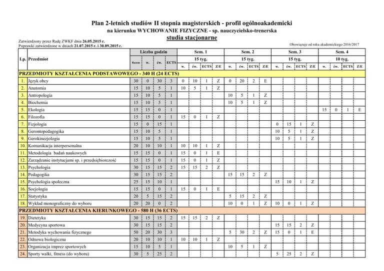 Plan 2-letnich studiów II stopnia magisterskich - profil ogólnoakademicki na kierunku WYCHOWANIE FIZYCZNE - sp. nauczycielsko-trenerska studia stacjonarne Zatwierdzony przez Radę ZWKF dnia 26.05.2015 r. Poprawki zatwierdzone w dniach 21.07.2015 r. i 30.09.2015 r. Obowiązuje od roku akademickiego 2016/2017 Liczba godzin Lp. Przedmiot Razem w. ćw. ECTS Sem. 1 Sem. 2 Sem. 3 Sem. 4 15 tyg. 15 tyg. 15 tyg. 10 tyg. w. ćw. ECTS Z/E w. ćw. ECTS Z/E 0 20 2 E w. ćw. ECTS Z/E w. ćw. ECTS Z/E 15 0 1 E PRZEDMIOTY KSZTAŁCENIA PODSTAWOWEGO - 340 H (24 ECTS) 1. Język obcy 30 0 30 3 0 10 1 Z 2. Anatomia 15 10 5 1 10 5 1 Z 3. Antropologia 15 10 5 1 10 5 1 Z 4. Biochemia 15 10 5 1 10 5 1 Z 5. Ekologia 15 15 0 1 6. Filozofia 15 15 0 1 7. Fizjologia 15 0 15 1 0 15 1 Z 8. Gerontopedagogika 15 10 5 1 10 5 1 Z 9. Gerokinezjologia 15 10 5 1 10 5 1 Z 10. Komunikacja interpersonalna 20 10 10 1 10 10 1 Z 11. Metodologia badań naukowych 15 15 0 1 15 0 1 E 12. Zarządzanie instytucjami sp. i przedsiębiorczość 15 15 0 1 15 0 1 Z 13. Psychologia 30 15 15 2 15 15 2 Z 14. Pedagogika 30 15 15 2 15. Psychologia społeczna 25 15 10 1 15 10 1 Z 16. Socjologia 15 15 0 1 17. Statystyka 20 5 15 2 5 15 2 Z 18. Wykład monograficzny do wyboru 20 20 0 2 10 0 1 Z 10 0 1 Z 15 15 2 Z 15 0 1 E 5 25 2 Z 15 0 1 Z 15 15 0 1 15 2 Z E PRZEDMIOTY KSZTAŁCENIA KIERUNKOWEGO - 580 H (36 ECTS) 19. Dietetyka 30 15 15 2 20. Medycyna sportowa 30 15 15 2 21. Metodyka wychowania fizycznego 50 20 30 3 22. Odnowa biologiczna 20 10 10 1 23. Organizacja imprez sportowych 15 10 5 1 24. Sporty walki, fitness (do wyboru) 30 5 25 2 15 10 15 10 2 1 Z 5 30 2 Z 10 5 1 Z Z Poprawki zatwierdzone w dniach 21.07.2015 r. i 30.09.2015 r. Liczba godzin Lp. Przedmiot Razem w. ćw. ECTS w. Sem. 1 Sem. 2 Sem. 3 Sem. 4 15 tyg. 15 tyg. 15 tyg. 10 tyg. ćw. ECTS Z/E 25. Edukacja zdrowotna 15 5 10 2 26. Teoria i metodyka gimnastyki 30 10 20 2 27. Teoria i metodyka lekkoatletyki 30 10 20 2 28. Teoria i metodyka pływania 30 10 20 2 29. Teoria i metodyka piłki ręcznej 30 5 25 2 30. Teoria i metodyka piłki siatkowej 30 5 25 2 31. Teoria i metodyka piłki nożnej 30 5 25 2 32. Teoria i metodyka koszykówki 30 5 25 2 33. Turystyka szkolna 30 15 15 2 15 15 2 Z 34. WF specjalne 30 20 10 3 20 10 3 Z ZAJĘCIA SPORTOWE I REKREACYJNE DO WYBORU 120 20 100 4 30 5 25 1 5 25 1 Z 30 5 25 1 30 5 25 1 30 5 25 1 35. 36. 37. 38. Judo/sumo Tenis stołowy Kulturystyka Futsal Akrobatyka sportowa Łyżwiarstwo Aqua aerobik Unihokej 10 20 2 w. 5 25 2 ECTS Z/E w. ćw. ECTS Z/E 5 10 2 E 10 20 2 Z w. ćw. ECTS Z/E 5 25 2 Z 5 25 1 Z 10 55 5 E Z 10 5 ćw. 20 25 2 2 Z Z Z 5 25 1 5 25 2 Z 5 25 1 Z Z Specjalizacja trenerska do wyboru - 370 H (33 ECTS) 39. Dyscyplina kierunkowa 270 80 190 21 15 40. Żywienie 15 5 10 2 41. Pedagogika sportu 10 10 0 1 42. Biochemia sportu 10 0 10 2 43. Biomechanika sportu 10 0 10 1 44. Teoria sportu 15 5 10 2 45. Psychologia sportu 10 10 0 1 10 0 1 Z 46. Fizjologia sportu 10 0 10 1 0 10 1 Z 47. Teoria treningu 20 10 10 2 10 10 2 Z 0 45 10 6 2 Z 30 40 5 Z 5 10 2 Z 25 50 5 Z 10 0 1 Z 5 10 2 Z Z 0 10 1 Z Poprawki zatwierdzone w dniach 21.07.2015 r. i 30.09.2015 r. Liczba godzin Lp. Przedmiot Razem w. ćw. ECTS Sem. 1 Sem. 2 Sem. 3 Sem. 4 15 tyg. 15 tyg. 15 tyg. 10 tyg. ćw. w. ECTS Z/E w. ćw. ECTS w. ćw. ECTS 0 15 1 0 15 120 240 26 145 230 Z/E w. ćw. ECTS Z/E 1 0 30 16 E 26 55 155 29 Z/E INNE PRZEDMIOTY OBOWIĄZKOWE - 60 (18 ECTS) 48. Seminarium magisterskie Razem bez praktyk 60 0 1350 510 60 18 840 111 215 30 405 Godziny w semestrze 49. Praktyka w gimnazjum 60 0 60 4 50. Praktyka w szkole średniej 60 0 60 4 51. Praktyka zawodowa trenerska 30 0 30 1 ECTS w semestrze ECTS w roku akademickim 190 360 0 930 120 60 4 210 Z 0 60 4 Z 30 30 1500 510 375 30 60 30 1 30 60 Z