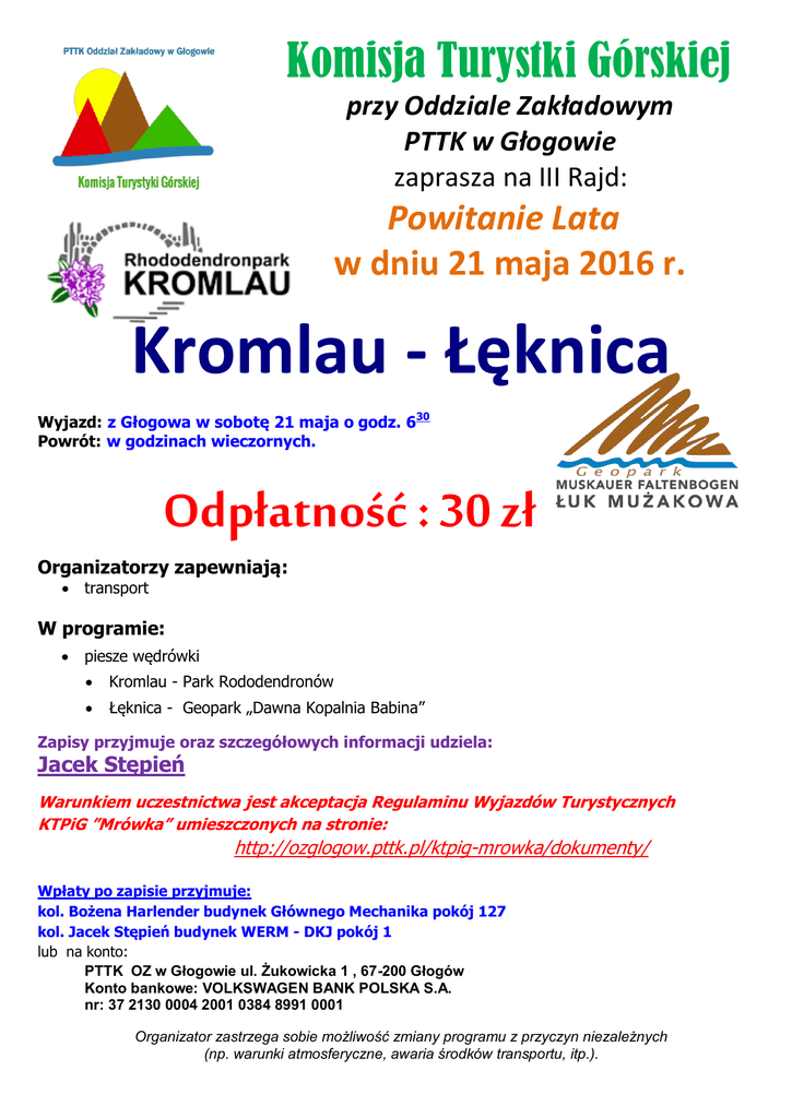 Komisja Turystki Górskiej przy Oddziale Zakładowym PTTK w Głogowie zaprasza na III Rajd: Powitanie Lata w dniu 21 maja 2016 r. Kromlau - Łęknica Wyjazd: z Głogowa w sobotę 21 maja o godz. 630 Powrót: w godzinach wieczornych. Odpłatność : 30 zł Organizatorzy zapewniają: transport W programie: piesze wędrówki Kromlau - Park Rododendronów Łęknica - Geopark „Dawna Kopalnia Babina” Zapisy przyjmuje oraz szczegółowych informacji udziela: Jacek Stępień Warunkiem uczestnictwa jest akceptacja Regulaminu Wyjazdów Turystycznych KTPiG ”Mrówka” umieszczonych na stronie: http://ozglogow.pttk.pl/ktpig-mrowka/dokumenty/ Wpłaty po zapisie przyjmuje: kol. Bożena Harlender budynek Głównego Mechanika pokój 127 kol. Jacek Stępień budynek WERM - DKJ pokój 1 lub na konto: PTTK OZ w Głogowie ul. Żukowicka 1 , 67-200 Głogów Konto bankowe: VOLKSWAGEN BANK POLSKA S.A. nr: 37 2130 0004 2001 0384 8991 0001 Organizator zastrzega sobie możliwość zmiany programu z przyczyn niezależnych (np. warunki atmosferyczne, awaria środków transportu, itp.).
