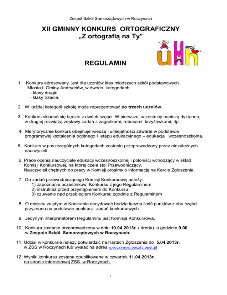 Zespół Szkół Samorządowych w Roczynach XII GMINNY KONKURS ORTOGRAFICZNY „Z ortografią na Ty” REGULAMIN 1. Konkurs adresowany jest dla uczniów klas młodszych szkół podstawowych Miasta i Gminy Andrychów, w dwóch kategoriach: - klasy drugie - klasy trzecie. 2. W każdej kategorii szkołę może reprezentować po trzech uczniów. 3. Konkurs składać się będzie z dwóch części. W pierwszej uczestnicy napiszą dyktando, w drugiej rozwiążą zestawy zadań z zagadkami, rebusami, krzyżówkami, itp. 4. Merytorycznie konkurs obejmuje wiedzę i umiejętności zawarte w podstawie programowej kształcenia ogólnego I etapu edukacyjnego – edukacja wczesnoszkolna. . 5. Konkurs w poszczególnych kategoriach zostanie przeprowadzony przez niezależnych nauczycieli. 6. Prace ocenią nauczyciele edukacji wczesnoszkolnej i poloniści wchodzący w skład Komisji Konkursowej, na której czele stoi Przewodniczący. Nauczycieli chętnych do pracy w Komisji prosimy o informację na Karcie Zgłoszenia. 7. Do zadań przewodniczącego Komisji Konkursowej należy: 1) zapoznanie uczestników Konkursu z jego Regulaminem 2) instruktaż przed przystąpieniem do Konkursu 3) czuwanie nad przebiegiem Konkursu zgodnie z Regulaminem 8. O miejscu zajętym w Konkursie decydować będzie łączna ilość punktów z obu części przyznana na podstawie punktacji zadań konkursowych. 9. Jedynym interpretatorem Regulaminu jest Komisja Konkursowa. 10. Konkurs zostanie przeprowadzony w dniu 10.04.2013r. ( środa) o godzinie 9.00 w Zespole Szkół Samorządowych w Roczynach. 11. Udział w konkursie należy potwierdzić na Kartach Zgłoszenia do 5.04.2013r. w ZSS w Roczynach lub wysłać na adres [email protected] 12. Wyniki konkursu zostaną opublikowane w czwartek 11.04.2013r. na stronie internetowej ZSS w Roczynach. 1 13. Uroczyste rozdanie nagród odbędzie się w ZSS w Roczynach 17.04.2013r. ( środa ) o godzinie 12.00 14. Warunkiem uczestnictwa w konkursie jest dostarczenie w dniu konkursu zgody rodzica, prawnego opiekuna ucznia na jego udział w konkursie i przetwarzanie danych osobowych ( w rozumieniu ustawy z dnia 29 sierpnia 1997r. o ochronie danych osobowych Dz. U. z 2002r., nr 101, poz. 926 ze zm.) w celach związanych z przeprowadzeniem konkursu, a w szczególności wyłonieniem zwycięzców, ich upublicznienie na stronie internetowej organizatora i w prasie lokalnej. Zachęcamy do udziału! 2