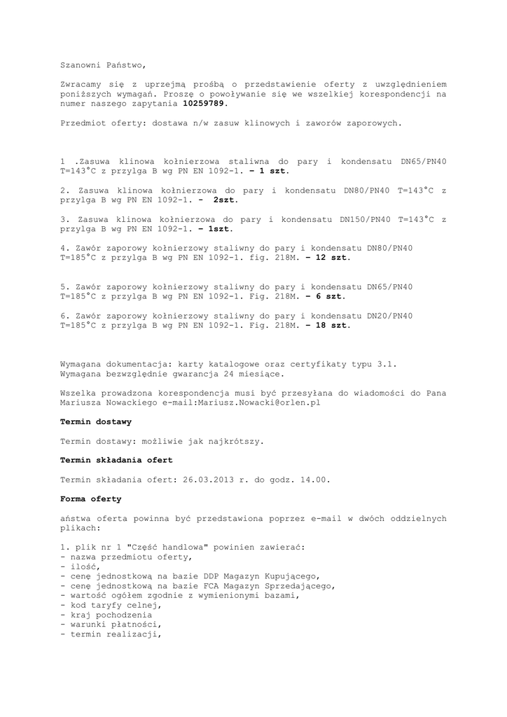 Szanowni Państwo, Zwracamy się z uprzejmą prośbą o przedstawienie oferty z uwzględnieniem poniższych wymagań. Proszę o powoływanie się we wszelkiej korespondencji na numer naszego zapytania 10259789. Przedmiot oferty: dostawa n/w zasuw klinowych i zaworów zaporowych. 1 .Zasuwa klinowa kołnierzowa staliwna do pary T=143°C z przylga B wg PN EN 1092-1. – 1 szt. i kondensatu DN65/PN40 2. Zasuwa klinowa kołnierzowa do pary i kondensatu DN80/PN40 T=143°C z przylga B wg PN EN 1092-1. - 2szt. 3. Zasuwa klinowa kołnierzowa do pary i kondensatu DN150/PN40 T=143°C z przylga B wg PN EN 1092-1. – 1szt. 4. Zawór zaporowy kołnierzowy staliwny do pary i kondensatu DN80/PN40 T=185°C z przylga B wg PN EN 1092-1. fig. 218M. – 12 szt. 5. Zawór zaporowy kołnierzowy staliwny do pary i kondensatu DN65/PN40 T=185°C z przylga B wg PN EN 1092-1. Fig. 218M. – 6 szt. 6. Zawór zaporowy kołnierzowy staliwny do pary i kondensatu DN20/PN40 T=185°C z przylga B wg PN EN 1092-1. Fig. 218M. – 18 szt. Wymagana dokumentacja: karty katalogowe oraz certyfikaty typu 3.1. Wymagana bezwzględnie gwarancja 24 miesiące. Wszelka prowadzona korespondencja musi być przesyłana do wiadomości do Pana Mariusza Nowackiego e-mail:[email protected] Termin dostawy Termin dostawy: możliwie jak najkrótszy. Termin składania ofert Termin składania ofert: 26.03.2013 r. do godz. 14.00. Forma oferty aństwa oferta powinna być przedstawiona poprzez e-mail w dwóch oddzielnych plikach: 1. plik nr 1 "Część handlowa" powinien zawierać: - nazwa przedmiotu oferty, - ilość, - cenę jednostkową na bazie DDP Magazyn Kupującego, - cenę jednostkową na bazie FCA Magazyn Sprzedającego, - wartość ogółem zgodnie z wymienionymi bazami, - kod taryfy celnej, - kraj pochodzenia - warunki płatności, - termin realizacji, - oświadczenie, że w stosunku do Państwa firmy nie wszczęto postępowania likwidacyjnego lub upadłościowego, - oświadczenie, że zapoznali się Państwo i akceptują warunki powyższego zapytania. "Część handlowa" oferty powinna być zabezpieczona hasłem tylko w przypadku kiedy wartość oferty przekracza 50.000,00 PLN, które powinno zostać przesłane w terminie późniejszym do Kupca wyłącznie na jego wyraźną prośbę. 2. plik nr 2 "Część techniczna" powinien zawierać: - przedmiot oferty wraz ze specyfikacją techniczną, - karty techniczne - kraj pochodzenia, - termin realizacji - warunki gwarancji. Pozostałe warunki Prosimy o zawarcie w ofercie następujących informacji: - czas działania na rynku, - referencje, - zasięg działania, - główni klienci, - kapitał zakładowy opłacony (w przypadku Spółek) - ilość zatrudnianych osób. Państwa oferta będzie oceniana pod warunków technicznych i handlowych. względem przedstawionych powyżej W przypadku braku spełnienia wymogów niniejszego zapytania, Państwa oferta może nie być rozpatrywana. W przypadku złożenia zamówienia obowiązują aktualnie zatwierdzone OGÓLNE WARUNKI ZAKUPU TOWARÓW ORAZ ZAKUPU TOWARÓW I ŚWIADCZENIA USŁUG Polskiego Koncernu Naftowego ORLEN Spółka Akcyjna, które są załączone do niniejszej wiadomości oraz są dostępne na www.orlen.pl. PKN ORLEN S.A. zastrzega sobie prawo do dowolnego wyboru podmiotu/podmiotów, z którymi będą prowadzone negocjacje w odniesieniu do części lub całości zakresu złożonych odpowiedzi oraz do zawarcia umowy z więcej niż jednym Dostawcą wyłonionym w drodze negocjacji, przy czym zakres umowy może obejmować całość lub część zakresu złożonej odpowiedzi na zapytanie ofertowe. PKN ORLEN S.A. zastrzega sobie prawo do odwołania, zamknięcia procesu wyboru Dostawcy i odstąpienia od negocjacji bez podania przyczyn. Z tego tytułu nie przysługują żadne roszczenia wobec Zapraszającego. Niniejsze zapytanie stanowi zaproszenie do negocjacji w rozumieniu art. 72 k.c. Polski Koncern Naftowy ORLEN Spółka Akcyjna z siedzibą w Płocku, ul. Chemików 7, 09-411 Płock, wpisana do Krajowego Rejestru Sądowego prowadzonego przez Sąd Rejonowy dla m.st. Warszawy XIV Wydział Gospodarczy w Warszawie pod numerem KRS: 0000028860, numer NIP: 774 00 01 454, kapitał zakładowy/kapitał wpłacony: 534.636.326,25 zł, będąca czynnym podatnikiem podatku VAT. Z poważaniem,