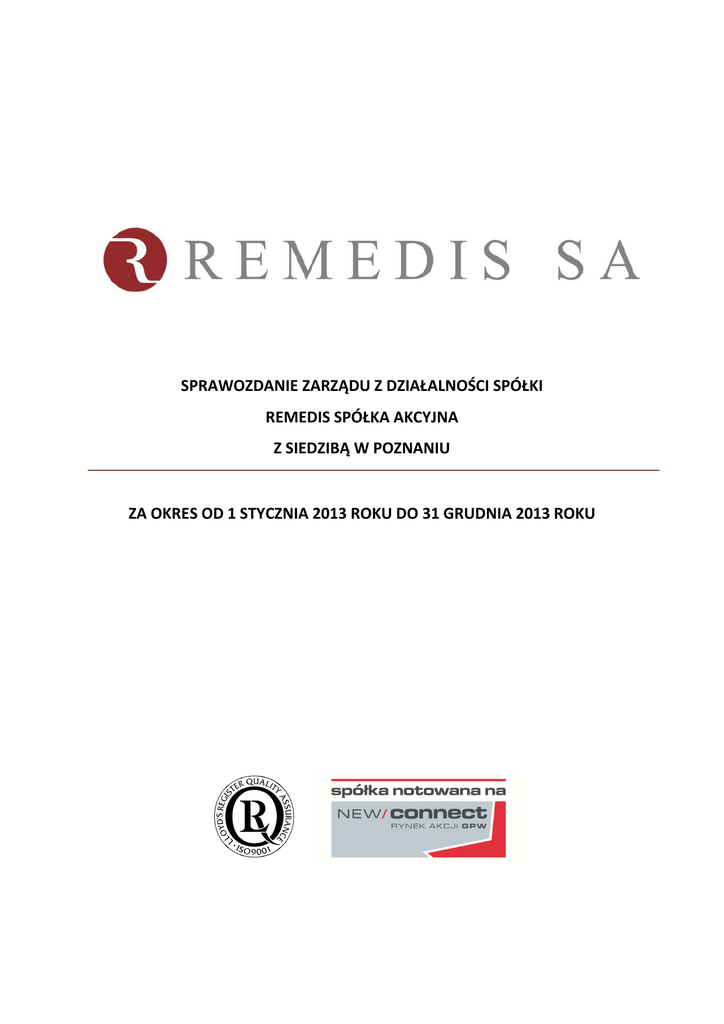 SPRAWOZDANIE ZARZĄDU Z DZIAŁALNOŚCI SPÓŁKI REMEDIS SPÓŁKA AKCYJNA Z SIEDZIBĄ W POZNANIU ZA OKRES OD 1 STYCZNIA 2013 ROKU DO 31 GRUDNIA 2013 ROKU abcde Sprawozdanie Zarządu Remedis SA za 2013 r. Spis treści I Informacje podstawowe o spółce 1. Dane podstawowe 2. Podstawowe informacje o działalności spółki 3. Władze spółki 4. Struktura akcjonariatu II Komentarz dotyczący aktualizacji i przewidywanej sytuacji finansowej 1. Ocena sytuacji finansowej 2. Analiza wskaźnikowa III Zdarzenia istotne w rozwoju działalności spółki, które wystąpiły w roku obrotowym, a także po jego zakończeniu 1. Udzielone finansowanie 2. Emisje obligacji i zaciągnięte zobowiązania 3. Pozostałe zdarzenia oraz informacje IV Przewidywania dotyczące rozwoju jednostki V Ważniejsze osiągnięcia w dziedzinie badań i rozwoju VI Informacje dotyczące nabycia akcji własnych Strona 2 VII Opis istotnych czynników ryzyka i zagrożeń Sprawozdanie Zarządu Remedis SA za 2013 r. I. Informacje podstawowe o spółce 1. Dane podstawowe Spółka Remedis Spółka Akcyjna z siedzibą w Poznaniu powstała na mocy aktu zawiązania spółki z dnia 26 października 2006 r. sporządzonego przez Kancelarię Notarialną Mikołaja Borkowskiego w Poznaniu. Od 28 grudnia 2006 r. spółka jest zarejestrowana w Krajowym Rejestrze Sądowym pod numerem KRS 0000270485. 1. Nazwa: REMEDIS SPÓŁKA AKCYJNA 2. Forma prawna: spółka akcyjna 3. Siedziba: Poznań 4. Adres: ul. Petera Mansfelda 4, 60-855 Poznań 5. Telefon: +48 61 665 78 00 Fax: +48 61 665 78 09 6. Adres poczty elektronicznej: [email protected] 7. Adres strony internetowej: www.remedis.eu 2. Podstawowe informacje o działalności spółki Działalność Remedis SA obejmuje świadczenie usług dla jednostek działających w sektorze finansów publicznych (m.in. podmiotów leczniczych, jednostek samorządu terytorialnego, spółek komunalnych) polegających na: o udzielaniu finansowania, o przeprowadzaniu restrukturyzacji zobowiązań, o świadczeniu usług faktoringowych, o przeprowadzaniu analiz finansowych, tworzeniu programów restrukturyzacyjnych Strona 3 i naprawczych, Sprawozdanie Zarządu Remedis SA za 2013 r. o przygotowywaniu dokumentów strategicznych i operacyjnych: strategii rozwoju, strategii sektorowych (np. edukacyjnych), biznesplanów, planów rozwoju lokalnego, wieloletnich planów inwestycyjnych itp., o pozyskiwaniu finansowania, o zarządzaniu podmiotami. 3. Władze spółki Zarząd spółki jest jednoosobowy. Funkcję Prezesa Zarządu pełni Krzysztof Nowak. W 2013 r. członkowie Zarządu spółki nie otrzymywali wynagrodzenia z Remedis SA. Na dzień sporządzenia niniejszego sprawozdania Rada Nadzorcza składała się z czterech osób. W skład Rady Nadzorczej wchodzili: o Piotr Orłowski – Przewodniczący Rady Nadzorczej, o Aneta Koszczyńska – Członek Rady Nadzorczej, o Wiesław Markwitz – Członek Rady Nadzorczej, o Michał Okła – Członek Rady Nadzorczej. Spółka w roku 2013 wypłaciła łącznie 4.200 zł brutto Członkom Rady Nadzorczej z tytułu udziału w posiedzeniach Rady Nadzorczej. 4. Struktura akcjonariatu Na dzień sporządzenia niniejszego sprawozdania kapitał zakładowy Remedis SA dzielił się na 63.300.102 akcji (wartość nominalna jednej akcji – 0,10 zł), w tym: o 17.210.000 imiennych akcji serii A uprzywilejowanych w zakresie prawa głosu – na każdą akcję przypadają dwa głosy, o 5.246.000 akcji na okaziciela serii B nieuprzywilejowanych, o 14.970.666 akcji na okaziciela serii C nieuprzywilejowanych, o 1.700.000 akcji na okaziciela serii D nieuprzywilejowanych, o 24.173.436 akcji na okaziciela serii E nieuprzywilejowanych. Na dzień sporządzenia niniejszego sprawozdania skład akcjonariatu spółki przedstawiał się Strona 4 następująco (wg ostatnich dostępnych publicznie danych): Sprawozdanie Zarządu Remedis SA za 2013 r. Krzysztof Nowak KLN Investments Sp. z o.o. INC SA Pozostali inwestorzy RAZEM: Liczba akcji % w kapitale 603.000 34.577.666 25.283.316 2.836.120 63.300.102 0,95% 54,63% 39,94% 4,48% 100,00% Liczba głosów na WZA 1.206.000 51.184.666 25.283.313 2.836.120 80.510.102 % w głosach na WZA 1,50% 63,58% 31,40% 3,52% 100,00% Strona 5 Akcjonariusz Sprawozdanie Zarządu Remedis SA za 2013 r. II. Komentarz dotyczący aktualnej i przewidywalnej sytuacji finansowej 1. Ocena sytuacji finansowej W roku 2013 spółka prowadziła działalność gospodarczą polegającą na świadczeniu usług finansowych, w tym głównie udzielaniu pożyczek zakładom opieki zdrowotnej. Ponadto w wyniku połączenia ze spółką Inwest Consulting SA spółka przejęła bazę klientów i poszerzyła wachlarz świadczonych usług o usługi prowadzone dotychczas przez spółkę przejętą. W poniższych tabelach zaprezentowane zostały wybrane dane finansowe obrazujące Za okres Za okres od 01.01.2013 od 01.01.2012 Zmiana Zmiana do 31.12.2013 do 31.12.2012 wartościowo w% Przychody netto ze sprzedaży produktów 2 424 615,75 1 696 269,37 728 346,38 42,94% Koszt wytworzenia sprzedanych produktów 1 405 858,03 1 151 510,93 254 347,10 22,09% Zysk brutto ze sprzedaży 1 018 757,72 544 758,44 473 999,28 87,01% Koszty ogólnego zarządu 1 257 928,89 1 195 487,41 62 441,48 5,22% Zysk (strata) ze sprzedaży -239 171,17 -650 728,97 411 557,80 -63,25% Zysk (strata) z działalności operacyjnej -365 250,80 -633 647,69 268 396,89 -42,36% Zysk (strata) brutto -104 810,76 -771 541,07 666 730,31 -86,42% Zysk (strata) netto -115 232,76 -629 050,07 513 817,31 -81,68% 65 877,81 0 65 877,81 100,00% 22 514 456,95 13 445 372,99 9 069 083,96 67,45% Kapitał własny 8 089 266,73 3 870 620,11 4 218 646,62 108,99% Kapitał podstawowy 6 330 010,20 3 912 666,60 2 417 343,60 61,78% Wybrane dane finansowe w zł Zobowiązania długoterminowe Zobowiązania krótkoterminowe Poz. Aktywa Stan na dzień Stan na dzień Zmiana Zmiana 31.12.2013 31.12.2012 wartościowo w% A. Aktywa trwałe 8 975 393,31 5 714 849,18 3 260 544,13 57,05% I. War