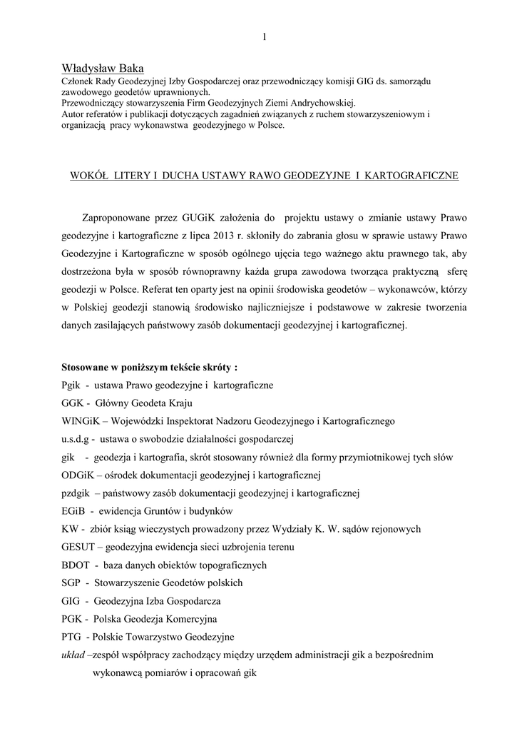 1 Władysław Baka Członek Rady Geodezyjnej Izby Gospodarczej oraz przewodniczący komisji GIG ds. samorządu zawodowego geodetów uprawnionych. Przewodniczący stowarzyszenia Firm Geodezyjnych Ziemi Andrychowskiej. Autor referatów i publikacji dotyczących zagadnień związanych z ruchem stowarzyszeniowym i organizacją pracy wykonawstwa geodezyjnego w Polsce. WOKÓŁ LITERY I DUCHA USTAWY RAWO GEODEZYJNE I KARTOGRAFICZNE Zaproponowane przez GUGiK założenia do projektu ustawy o zmianie ustawy Prawo geodezyjne i kartograficzne z lipca 2013 r. skłoniły do zabrania głosu w sprawie ustawy Prawo Geodezyjne i Kartograficzne w sposób ogólnego ujęcia tego ważnego aktu prawnego tak, aby dostrzeżona była w sposób równoprawny każda grupa zawodowa tworząca praktyczną sferę geodezji w Polsce. Referat ten oparty jest na opinii środowiska geodetów – wykonawców, którzy w Polskiej geodezji stanowią środowisko najliczniejsze i podstawowe w zakresie tworzenia danych zasilających państwowy zasób dokumentacji geodezyjnej i kartograficznej. Stosowane w poniższym tekście skróty : Pgik - ustawa Prawo geodezyjne i kartograficzne GGK - Główny Geodeta Kraju WINGiK – Wojewódzki Inspektorat Nadzoru Geodezyjnego i Kartograficznego u.s.d.g - ustawa o swobodzie działalności gospodarczej gik - geodezja i kartografia, skrót stosowany również dla formy przymiotnikowej tych słów ODGiK – ośrodek dokumentacji geodezyjnej i kartograficznej pzdgik – państwowy zasób dokumentacji geodezyjnej i kartograficznej EGiB - ewidencja Gruntów i budynków KW - zbiór ksiąg wieczystych prowadzony przez Wydziały K. W. sądów rejonowych GESUT – geodezyjna ewidencja sieci uzbrojenia terenu BDOT - baza danych obiektów topograficznych SGP - Stowarzyszenie Geodetów polskich GIG - Geodezyjna Izba Gospodarcza PGK - Polska Geodezja Komercyjna PTG - Polskie Towarzystwo Geodezyjne układ –zespół współpracy zachodzący między urzędem administracji gik a bezpośrednim wykonawcą pomiarów i opracowań gik 2 A. UWAGI W ŚWIETLE LITERY PRAWA W tej części referatu w celu przejrzystości tekstu zawarte będą uwagi dotyczące zapisów niektórych artykułów Pgik, a ponieważ konkluzją wszystkich uwag jest wniosek o opracowanie nowej ustawy Pgik, więc poruszamy tu kwestie najistotniejsze. 1. W sprawie kompetencji w wykonywaniu zleceń na opracowania geodezyjne i kartograficzne, wymagających geodezyjnych uprawnień zawodowych. W świetle postanowień art. 46 ust.1 oraz art. 75 ust.1 u.s.d.g. do prowadzenia działalności gospodarczej w dziedzinie geodezji i kartografii nie są wymagane koncesja ani zezwolenie Jeśli w u.s.d.g. wg Art. 19 przedsiębiorca geodezyjny jest jedynie obowiązany zapewnić, aby w ramach tej działalności samodzielne funkcje, o których mowa w art. 42 ust.2 Pgik, były wykonane przez osoby posiadające odpowiednie uprawnienia zawodowe, to nie dopowiadają, że w wykonaniu prac geodezyjnych i kartograficznych powinien brać udział geodeta uprawniony zatrudniony w danej jednostce o geodezyjnej działalności gospodarczej, lecz to również nie znaczy, aby tę kwestię pozostawiać bez dostosowania do wagi i specyfiki zawody geodezyjnego. Obecnie trzymając się literalnie zapisów u.s.d.g. i Art 42 Pgik przyzwala się, aby przedsiębiorca dobierał do swej działalności uprawnionego kierownika roboty, co z punktu widzenia organizacji i skutecznego działania jest postawieniem sprawy "na głowie". Np w notariacie i w innych dziedzinach to kierownik dobiera pracowników, a nie na odwrót. Art.4. §3 Ustawy Prawo o notariacie z dnia 14 lutego 1991 r stanowi: "Kilku notariuszy może prowadzić jedną kancelarię na zasadach spółki cywilnej lub partnerskiej. W takim jednak wypadku każdy z notariuszy dokonuje czynności notarialnych we własnym imieniu i ponosi odpowiedzialność za czynności przez siebie dokonane." Uwaga ta wiąże się z konkretem odpowiedzialności, bo jeśli dobrany kierownik powierzone zadanie wykona lub tylko podpisze dokumenty , a zadanie zostało powierzone przez zleceniodawcę właścicielowi firmy to kto daną prace firmuje? Uszczegółowienie zapisów w tej kwestii w nowym Pgik jest więc chyba dopuszczalne, a nawet konieczne.W Art. 42 Pgik ust. 2 punkt 1, wystarczyłoby do dodać prowadzenie działalności geodezyjno-kartograficznej. Działalność geodezyjna i kartograficzna nie znajduje analogii do branży handlowych czy wąsko pojętych usług, posiada natomiast charakter służebny podobnie jak działalność notarialna i podobnie jak ona, potraktowana być powinna jako zawód publicznego zaufania. W innym aspekcie kompetencyjności: wójt, burmistrz czy prezydent miasta może wyznaczyć do przeprowadzenia rozgraniczenia prowadzącego praktykę zawodową w ramach 3 geodezyjnej działalności gospodarczej geodetę posiadającego uprawnienia do wykonania rozgraniczenia np. w drodze przetargu, lecz nie może to być pracownik jakiegokolwiek urzędu publicznego, Pomiary geodezyjne i czynności geodezyjno-prawne powinien mieć prawo wykonywać wyłącznie geodeta uprawniony pracujący w firmie geodezyjnej lub prowadzący geodezyjną działalność gospodarczą, nie zatrudniony w urzędzie państwowym i taki zapis należałoby umieścić w nowym Pgik. Środowisko geodetów-wykonawców szczególnie podkreśla, że w żadnym wypadku pracownicy urzędów państwowych nie powinni brać udziału w wykonawstwie geodezyjno – kartograficznym polegającym na wykonywaniu zleceń. Istniejące w tej sprawie przepisy niezbyt skutecznie zapobiegają nieprawidłowościom godzącym w zasady uczciwej konkurencji. 2. W sprawie obowiązku inwestora do zlecenia geodecie uprawnionemu inwentaryzacji powykonawczej przewodów podziemnych. Art.27.ust.2. punkt 2 obecnego Pgik zmienić trzeba tak, aby obowiązkiem inwentaryzacji powykonawczej objęte były wszystkie obiekty budowlane bez względu na postawy prawne ich realizacji, bowiem dotychczasowe brzmieni