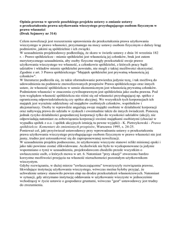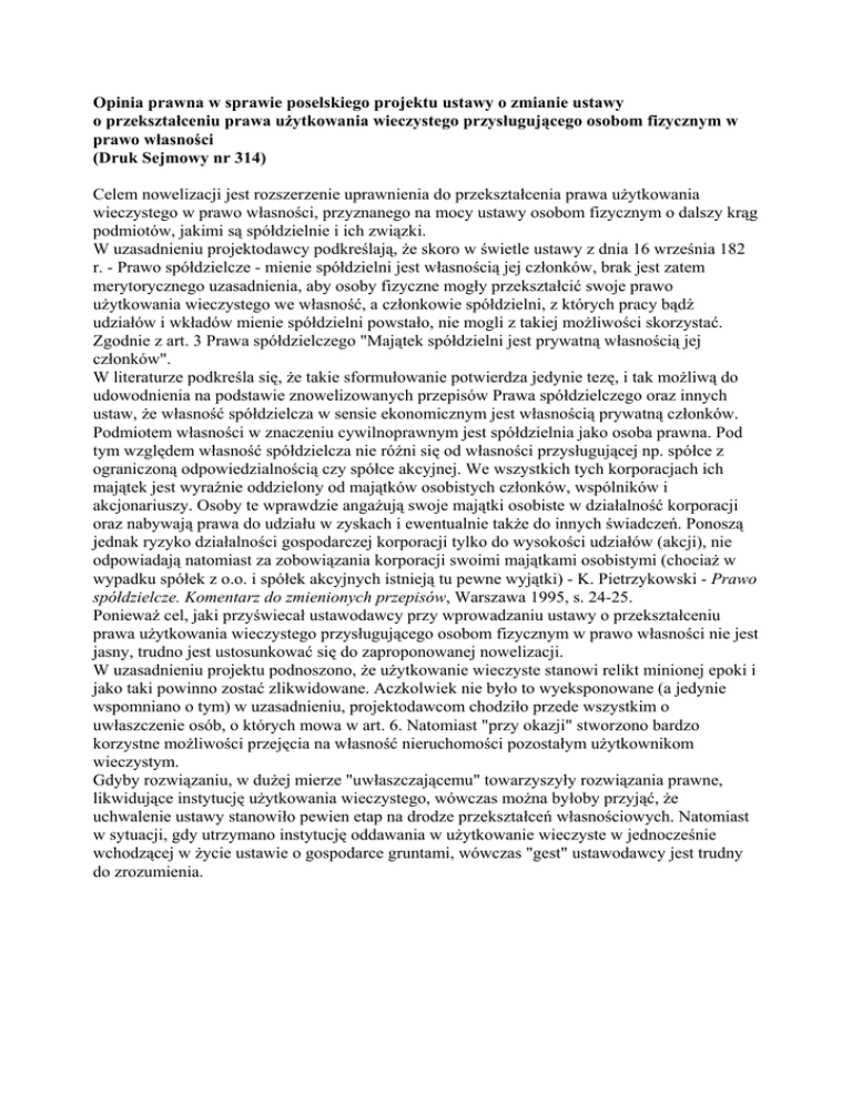 Opinia prawna w sprawie poselskiego projektu ustawy o zmianie ustawy o przekształceniu prawa użytkowania wieczystego przysługującego osobom fizycznym w prawo własności (Druk Sejmowy nr 314) Celem nowelizacji jest rozszerzenie uprawnienia do przekształcenia prawa użytkowania wieczystego w prawo własności, przyznanego na mocy ustawy osobom fizycznym o dalszy krąg podmiotów, jakimi są spółdzielnie i ich związki. W uzasadnieniu projektodawcy podkreślają, że skoro w świetle ustawy z dnia 16 września 182 r. - Prawo spółdzielcze - mienie spółdzielni jest własnością jej członków, brak jest zatem merytorycznego uzasadnienia, aby osoby fizyczne mogły przekształcić swoje prawo użytkowania wieczystego we własność, a członkowie spółdzielni, z których pracy bądź udziałów i wkładów mienie spółdzielni powstało, nie mogli z takiej możliwości skorzystać. Zgodnie z art. 3 Prawa spółdzielczego "Majątek spółdzielni jest prywatną własnością jej członków". W literaturze podkreśla się, że takie sformułowanie potwierdza jedynie tezę, i tak możliwą do udowodnienia na podstawie znowelizowanych przepisów Prawa spółdzielczego oraz innych ustaw, że własność spółdzielcza w sensie ekonomicznym jest własnością prywatną członków. Podmiotem własności w znaczeniu cywilnoprawnym jest spółdzielnia jako osoba prawna. Pod tym względem własność spółdzielcza nie różni się od własności przysługującej np. spółce z ograniczoną odpowiedzialnością czy spółce akcyjnej. We wszystkich tych korporacjach ich majątek jest wyraźnie oddzielony od majątków osobistych członków, wspólników i akcjonariuszy. Osoby te wprawdzie angażują swoje majątki osobiste w działalność korporacji oraz nabywają prawa do udziału w zyskach i ewentualnie także do innych świadczeń. Ponoszą jednak ryzyko działalności gospodarczej korporacji tylko do wysokości udziałów (akcji), nie odpowiadają natomiast za zobowiązania korporacji swoimi majątkami osobistymi (chociaż w wypadku spółek z o.o. i spółek akcyjnych istnieją tu pewne wyjątki) - K. Pietrzykowski - Prawo spółdzielcze. Komentarz do zmienionych przepisów, Warszawa 1995, s. 24-25. Ponieważ cel, jaki przyświecał ustawodawcy przy wprowadzaniu ustawy o przekształceniu prawa użytkowania wieczystego przysługującego osobom fizycznym w prawo własności nie jest jasny, trudno jest ustosunkować się do zaproponowanej nowelizacji. W uzasadnieniu projektu podnoszono, że użytkowanie wieczyste stanowi relikt minionej epoki i jako taki powinno zostać zlikwidowane. Aczkolwiek nie było to wyeksponowane (a jedynie wspomniano o tym) w uzasadnieniu, projektodawcom chodziło przede wszystkim o uwłaszczenie osób, o których mowa w art. 6. Natomiast "przy okazji" stworzono bardzo korzystne możliwości przejęcia na własność nieruchomości pozostałym użytkownikom wieczystym. Gdyby rozwiązaniu, w dużej mierze "uwłaszczającemu" towarzyszyły rozwiązania prawne, likwidujące instytucję użytkowania wieczystego, wówczas można byłoby przyjąć, że uchwalenie ustawy stanowiło pewien etap na drodze przekształceń własnościowych. Natomiast w sytuacji, gdy utrzymano instytucję oddawania w użytkowanie wieczyste w jednocześnie wchodzącej w życie ustawie o gospodarce gruntami, wówczas "gest" ustawodawcy jest trudny do zrozumienia. Jak podkreśla się w doktrynie (Małgorzata Bednarek - Przemiany własności w Polsce, Instytut Nauk Prawnych PAN, Warszawa 1994, s. 171): "Nie wolno zapominać o tym, iż przepisy o charakterze «uwłaszczeniowym» ze swej natury należą do kategorii nadzwyczajnych środków prawnych. Ich stosowanie powinno być zatem ograniczone do regulowania sytuacji wyjątkowych, w których nie jest możliwe bądź wielce utrudnione korzystanie ze «zwykłych» unormowań przewidzianych dla stanów faktycznych danego typu". Tymczasem, zgodnie z poprzednio obowiązującym art. 6 ustawy z dnia 29.04.1985 r. o gospodarce gruntami i wywłaszczeniu nieruchomości nieruchomość oddana w użytkowanie wieczyste mogła być sprzedana użytkownikowi wieczystemu tej nieruchomości za cenę ustaloną w sposób określony w art. 39. Z wnioskiem w tej sprawie mógł wystąpić użytkownik wieczysty, zarząd gminy lub rejonowy organ administracji ogólnej". Również obowiązująca od dnia 1.01.1998 r. ustawa z dnia 21.08.1997 r. o gospodarce nieruchomościami (Dz. U. z 1997 r. Nr 115, poz. 741) przewiduje możliwość nabycia przez użytkowników wieczystych nieruchomości według zasad określonych w art. 28, art. 37 ust. 2 pkt. 5), art. 67 i art. 69 ( które to zasady kształtują się odmiennie niż uregulowane w ustawie o przekształceniu prawa użytkowania wieczystego przysługującego osobom fizycznym w prawo własności). Należy wziąć również pod uwagę, że na mocy ustawy z dnia 7.10.1992 r. (Dz. U. Nr 91, poz. 455), którą zmieniono ustawę z dnia 29.09.1990 r., wprowadzając do niej m.in. nowy art. 2c, spółdzielnie będące w dniu 5 grudnia 1990 r. użytkownikami gruntów państwowych (z wyjątkiem nieruchomości rolnych SP, które znalazły się w Zasobie Własności Rolnej Skarbu Państwa) albo komunalnych uzyskały roszczenie o oddanie tych gruntów w użytkowanie wieczyste oraz o przeniesienie własności znajdujących się na tych gruntach budynków, innych urządzeń oraz lokali. Przeniesienie własności znajdujących się na gruncie budynków, innych urządzeń oraz lokali nastąpiło nieodpłatnie, jeżeli zostały one wybudowane lub nabyte ze środków własnych spółdzielni. Spółdzielnie zostały zwolnione od obowiązku wniesienia pierwszej opłaty rocznej z tytułu użytkowania wieczystego gruntów. Tak zatem spółdzielnie brały już do tej pory udział w procesie uwłaszczenia. Reasumując uważam, że dalsze rozszerzanie uprawnień jest kwestią koncepcji politycznej i prawnej w zakresie przekształceń stosunków własno