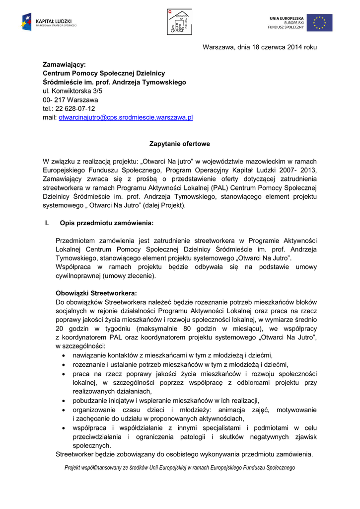 Warszawa, dnia 18 czerwca 2014 roku Zamawiający: Centrum Pomocy Społecznej Dzielnicy Śródmieście im. prof. Andrzeja Tymowskiego ul. Konwiktorska 3/5 00- 217 Warszawa tel.: 22 628-07-12 mail: [email protected] Zapytanie ofertowe W związku z realizacją projektu: „Otwarci Na jutro” w województwie mazowieckim w ramach Europejskiego Funduszu Społecznego, Program Operacyjny Kapitał Ludzki 2007- 2013, Zamawiający zwraca się z prośbą o przedstawienie oferty dotyczącej zatrudnienia streetworkera w ramach Programu Aktywności Lokalnej (PAL) Centrum Pomocy Społecznej Dzielnicy Śródmieście im. prof. Andrzeja Tymowskiego, stanowiącego element projektu systemowego „ Otwarci Na Jutro” (dalej Projekt). I. Opis przedmiotu zamówienia: Przedmiotem zamówienia jest zatrudnienie streetworkera w Programie Aktywności Lokalnej Centrum Pomocy Społecznej Dzielnicy Śródmieście im. prof. Andrzeja Tymowskiego, stanowiącego element projektu systemowego „Otwarci Na Jutro”. Współpraca w ramach projektu będzie odbywała się na podstawie umowy cywilnoprawnej (umowy zlecenie). Obowiązki Streetworkera: Do obowiązków Streetworkera należeć będzie rozeznanie potrzeb mieszkańców bloków socjalnych w rejonie działalności Programu Aktywności Lokalnej oraz praca na rzecz poprawy jakości życia mieszkańców i rozwoju społeczności lokalnej, w wymiarze średnio 20 godzin w tygodniu (maksymalnie 80 godzin w miesiącu), we współpracy z koordynatorem PAL oraz koordynatorem projektu systemowego „Otwarci Na Jutro”, w szczególności: nawiązanie kontaktów z mieszkańcami w tym z młodzieżą i dziećmi, rozeznanie i ustalanie potrzeb mieszkańców w tym z młodzieżą i dziećmi, praca na rzecz poprawy jakości życia mieszkańców i rozwoju społeczności lokalnej, w szczególności poprzez współpracę z odbiorcami projektu przy realizowanych działaniach, pobudzanie inicjatyw i wspieranie mieszkańców w ich realizacji, organizowanie czasu dzieci i młodzieży: animacja zajęć, motywowanie i zachęcanie do udziału w proponowanych aktywnościach, współpraca i współdziałanie z innymi specjalistami i podmiotami w celu przeciwdziałania i ograniczenia patologii i skutków negatywnych zjawisk społecznych. Streetworker będzie zobowiązany do osobistego wykonywania przedmiotu zamówienia. Projekt współfinansowany ze środków Unii Europejskiej w ramach Europejskiego Funduszu Społecznego II. Ogólne wymagania, jakie musi spełnić Streetworker: wykształcenie wyższe psychologiczne lub inne pokrewne z dziedziny nauk społecznych w rozumieniu rozporządzenia Ministra Nauki i Szkolnictwa Wyższego z dnia 8 sierpnia 2011 r. w sprawie obszarów wiedzy, dziedzin nauki i sztuki oraz dyscyplin naukowych i artystycznych, dalej rozporządzenie; doświadczenie w pracy z osobami zagrożonymi wykluczeniem społecznym lub wykluczonymi społecznie; Dodatkowo: a) obciążenie wynikające z zaangażowania w Projekcie nie może wykluczyć możliwości prawidłowej i efektywnej realizacji wszystkich powierzonych Streetworkerowi zadań; b) łączne zaangażowanie zawodowe* Streetworkera w realizację wszystkich projektów finansowanych z funduszy strukturalnych i Funduszu Spójności oraz działań finansowanych z innych źródeł, w tym środków własnych Zamawiającego i innych podmiotów, nie może przekroczyć 240 godzin miesięcznie. *Przez łączne zaangażowanie zawodowe danej osoby rozumie się wszelkie formy zaangażowania zawodowego, w szczególności w ramach stosunku pracy, stosunku cywilnoprawnego i samozatrudnienia, zaangażowania w ramach prowadzenia własnej działalności gospodarczej. Streetworker będzie zobowiązany się do spełnienia ww. warunków, o których mowa w lit. a i b, w okresie kwalifikowania jego wynagrodzenia w Projekcie oraz do niezwłocznego poinformowania Zamawiającego o wystąpieniu sytuacji niespełniania przez niego tych warunków. III. Termin realizacji zamówienia: od 01.07.2014 roku do 31.10. 2014 roku. IV. Okres związania ofertą: 30 dni. V. Wymagania dotyczące złożenia oferty (na własnym wzorze): podanie danych osobowych oraz kontaktowych do Zleceniobiorcy, aktualny życiorys (wraz ze wskazaniem doświadczenia zawodowego, kursów i szkoleń), podanie wysokości wynagrodzenia za wykonanie przedmiotu zamówienia (brutto za godzinę pracy), przedłożenie kopii dyplomu ukończenia studiów wyższych z dziedziny nauk społecznych w rozumieniu rozporządzenia Ministra Nauki i Szkolnictwa Wyższego z dnia 8 sierpnia 2011 r. w sprawie obszarów wiedzy, dziedzin nauki i sztuki oraz dyscyplin naukowych i artystycznych, dalej rozporządzenie, Zamawiający zastrzega, iż składana oferta musi być kompletna, Zamawiający nie będzie wzywał, w toku badania i oceny ofert, do składania uzupełnień dotyczących treści złożonych ofert. Projekt współfinansowany ze środków Unii Europejskiej w ramach Europejskiego Funduszu Społecznego VI. Kryterium wyboru oferty: 1. Cena – 70 %. 2. Doświadczenie zawodowe 30% Oferta może otrzymać maksymalnie 100 punktów. Za najkorzystniejszą zostanie uznana oferta, która uzyska najwyższą liczbę punktów. Nr: Nazwa kryterium: Waga: 1 Cena (C) 70 Liczba punktów za kryterium C = (Cmin/Cof) *100 * waga, Gdzie: - Cmin – najniższa cena spośród wszystkich ofert - Cof – cena podana w ofercie 2 Doświadczenie, (D) 30 *ilość lat doświadczenia w pracy z osobami zagrożonymi wykluczeniem lub wykluczonymi społecznie; Zamawiający będzie przyznawał punkty za doświadczenie w następujący sposób: - 10 pkt za rok pracy osobami zagrożonymi wykluczeniem społecznym lub wykluczonymi społecznie, maksymalnie 30 punktów; VII. Zamawiający zastrzega sobie prawo do: negocjacji w sytuacji, gdy zostanie złożona jedna oferta, która będzie przekraczać założenia budżetowe projektu przewidziane na realizację zamówienia, przeprowadzenia rozmów z wybranym Zleceniobiorcą celem odpowiedniego uszczegó