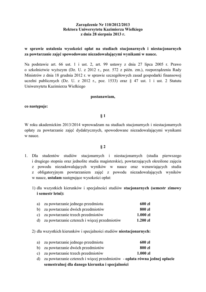 Zarządzenie Nr 110/2012/2013 Rektora Uniwersytetu Kazimierza Wielkiego z dnia 28 sierpnia 2013 r. w sprawie ustalenia wysokości opłat na studiach stacjonarnych i niestacjonarnych za powtarzanie zajęć spowodowane niezadowalającymi wynikami w nauce. Na podstawie art. 66 ust. 1 i ust. 2, art. 99 ustawy z dnia 27 lipca 2005 r. Prawo o szkolnictwie wyższym (Dz. U. z 2012 r., poz. 572 z późn. zm.), rozporządzenia Rady Ministrów z dnia 18 grudnia 2012 r. w sprawie szczegółowych zasad gospodarki finansowej uczelni publicznych (Dz. U. z 2012 r., poz. 1533) oraz § 47 ust. 1 i ust. 2 Statutu Uniwersytetu Kazimierza Wielkiego postanawiam, co następuje: §1 W roku akademickim 2013/2014 wprowadzam na studiach stacjonarnych i niestacjonarnych opłaty za powtarzanie zajęć dydaktycznych, spowodowane niezadowalającymi wynikami w nauce. §2 1. Dla studentów studiów stacjonarnych i niestacjonarnych (studia pierwszego i drugiego stopnia oraz jednolite studia magisterskie), powtarzających określone zajęcia z powodu niezadowalających wyników w nauce oraz wznawiających studia z obligatoryjnym powtarzaniem zajęć z powodu niezadowalających wyników w nauce, ustalam następujące wysokości opłat: 1) dla wszystkich kierunków i specjalności studiów stacjonarnych (semestr zimowy i semestr letni): a) b) c) d) za powtarzanie jednego przedmiotu za powtarzanie dwóch przedmiotów za powtarzanie trzech przedmiotów za powtarzanie czterech i więcej przedmiotów 600 zł 800 zł 1.000 zł 1.200 zł 2) dla wszystkich kierunków i specjalności studiów niestacjonarnych: a) b) c) d) za powtarzanie jednego przedmiotu 600 zł za powtarzanie dwóch przedmiotów 800 zł za powtarzanie trzech przedmiotów 1.000 zł za powtarzanie czterech i więcej przedmiotów - opłata równa jednej opłacie semestralnej dla danego kierunku i specjalności 2. Studenci ostatniego roku studiów stacjonarnych i niestacjonarnych, powtarzający rok i wznawiający studia z powodu braku zaliczenia seminarium dyplomowego, jednego przedmiotu lub łącznie: seminarium dyplomowego i jednego przedmiotu, wnoszą jednorazowo opłatę w wysokości 600 zł, bez względu na różnice programowe. §3 1. 2. 3. Studenci studiów stacjonarnych i niestacjonarnych wnoszą opłatę za powtarzanie przedmiotu z wpisem warunkowym. Opłata za powtarzanie przedmiotu z wpisem warunkowym wynosi 200 zł za każdy powtarzany przedmiot, niezależnie od liczby punktów ECTS przypisanych do powtarzanego przedmiotu. Opłatę, o której mowa w ust. 2 należy wnieść w terminie ustalonym przez właściwego Dziekana. §4 Terminy i formy wnoszenia opłat, o których mowa w § 1 określa Regulamin pobierania opłat i zasad udzielania zwolnień z opłat za usługi edukacyjne świadczone w Uniwersytecie Kazimierza Wielkiego wprowadzony zarządzeniem Nr 14/2011/2012 Rektora UKW z dnia 30 listopada 2011 roku. §5 Zarządzenie wchodzi w życie z dniem podpisania. Rektor prof. dr hab. Janusz Ostoja - Zagórski