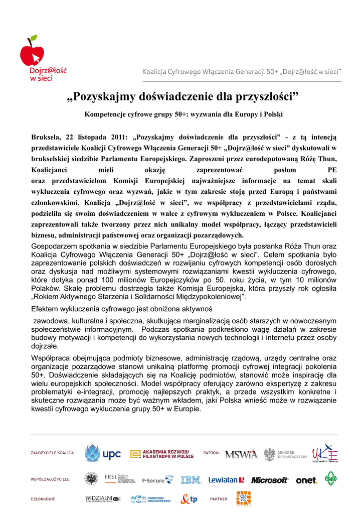 „Pozyskajmy doświadczenie dla przyszłości” Kompetencje cyfrowe grupy 50+: wyzwania dla Europy i Polski Bruksela, 22 listopada 2011: „Pozyskajmy doświadczenie dla przyszłości” - z tą intencją przedstawiciele Koalicji Cyfrowego Włączenia Generacji 50+ „Dojrz@łość w sieci” dyskutowali w brukselskiej siedzibie Parlamentu Europejskiego. Zaproszeni przez eurodeputowaną Różę Thun, Koalicjanci mieli okazję zaprezentować posłom PE oraz przedstawicielom Komisji Europejskiej najważniejsze informacje na temat skali wykluczenia cyfrowego oraz wyzwań, jakie w tym zakresie stoją przed Europą i państwami członkowskimi. Koalicja „Dojrz@łość w sieci”, we współpracy z przedstawicielami rządu, podzieliła się swoim doświadczeniem w walce z cyfrowym wykluczeniem w Polsce. Koalicjanci zaprezentowali także tworzony przez nich unikalny model współpracy, łączący przedstawicieli biznesu, administracji państwowej oraz organizacji pozarządowych. Gospodarzem spotkania w siedzibie Parlamentu Europejskiego była posłanka Róża Thun oraz Koalicja Cyfrowego Włączenia Generacji 50+ „Dojrz@łość w sieci”. Celem spotkania było zaprezentowanie polskich doświadczeń w rozwijaniu cyfrowych kompetencji osób dorosłych oraz dyskusja nad możliwymi systemowymi rozwiązaniami kwestii wykluczenia cyfrowego, które dotyka ponad 100 milionów Europejczyków po 50. roku życia, w tym 10 milionów Polaków. Skalę problemu dostrzegła także Komisja Europejska, która przyszły rok ogłosiła „Rokiem Aktywnego Starzenia i Solidarności Międzypokoleniowej”. Efektem wykluczenia cyfrowego jest obniżona aktywnoś zawodowa, kulturalna i społeczna, skutkujące marginalizacją osób starszych w nowoczesnym społeczeństwie informacyjnym. Podczas spotkania podkreślono wagę działań w zakresie budowy motywacji i kompetencji do wykorzystania nowych technologii i internetu przez osoby dojrzałe. Współpraca obejmująca podmioty biznesowe, administrację rządową, urzędy centralne oraz organizacje pozarządowe stanowi unikalną platformę promocji cyfrowej integracji pokolenia 50+. Doświadczenie składających się na Koalicję podmiotów, stanowić może inspirację dla wielu europejskich społeczności. Model współpracy oferujący zarówno ekspertyzę z zakresu problematyki e-integracji, promocję najlepszych praktyk, a przede wszystkim konkretne i skuteczne rozwiązania może być ważnym wkładem, jaki Polska wnieść może w rozwiązanie kwestii cyfrowego wykluczenia grupy 50+ w Europie. *** Koalicja Cyfrowego Włączenia Generacji 50+ „Dojrz@łość w sieci” powstała w marcu 2010 r. z inicjatywy UPC Polska i Akademii Rozwoju Filantropii w Polsce. Celem działań Koalicji jest zjednoczenie firm, organizacji pozarządowych, urzędów i instytucji na rzecz zachęcenia osób starszych do aktywnego korzystania z Internetu. Współzałożycielami Koalicji zostały: Fundacja dla Uniwersytetu Jagiellońskiego, Fundacja Rozwoju Społeczeństwa Informacyjnego, F-Secure, IBM, Microsoft, Onet.pl, Polska Konfederacja Pracodawców Prywatnych Lewiatan oraz Związek Harcerstwa Polskiego. Członkami Koalicji są również Fundacja Widzialni, Stowarzyszenie Społeczeństwa Wiedzy i Telekomunikacja Polska SA. Parterem przedsięwzięcia jest Urząd Miasta Krakowa. Koalicja ma charakter nieformalny i jest otwarta na kolejne podmioty, które chciałyby zaangażować się w kampanię na rzecz przeciwdziałania e-wykluczeniu osób starszych. Wagę działań Koalicji doceniły Urząd Komunikacji Elektronicznej, Ministerstwo Spraw Wewnętrznych i Administracji oraz Ministerstwo Infrastruktury, obejmując ją swoim patronatem. W ramach prowadzonych działań Koalicja opublikowała jesienią 2010 roku Raport Otwarcia „Między alienacją a adaptacją. Polacy 50+ wobec Internetu.”. Wynika z niego, że aż 10 mln Polaków po 50 roku życia jest wykluczona cyfrowo, co plasuje Polskę na jednym z ostatnich miejsc w Europie. www.dojrzaloscwsieci.pl Kontakt: Dagmara Krzesińska, [email protected]; +48 600 488 020