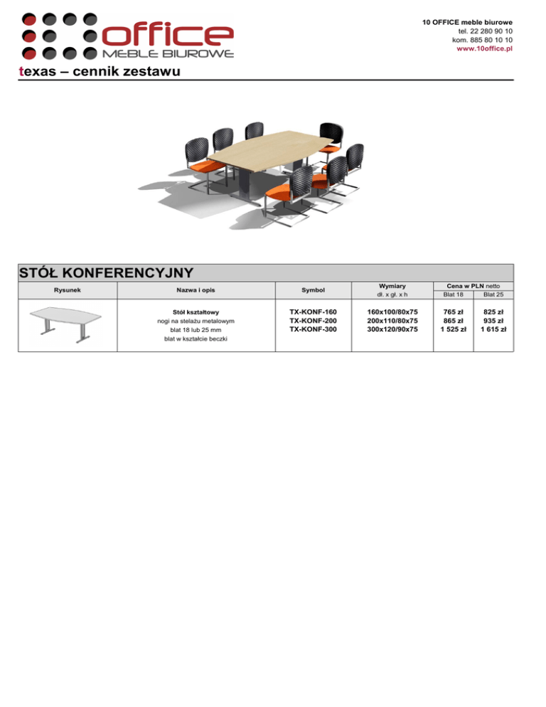 10 OFFICE meble biurowe tel. 22 280 90 10 kom. 885 80 10 10 www.10office.pl texas – cennik zestawu STÓŁ KONFERENCYJNY Rysunek Nazwa i opis Symbol Wymiary dł. x gł. x h Stół kształtowy nogi na stelażu metalowym blat 18 lub 25 mm blat w kształcie beczki TX-KONF-160 TX-KONF-200 TX-KONF-300 160x100/80x75 200x110/80x75 300x120/90x75 Cena w PLN netto Blat 18 Blat 25 765 zł 865 zł 1 525 zł 825 zł 935 zł 1 615 zł