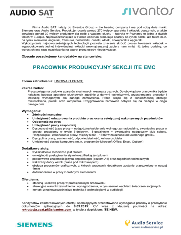 Firma Audio SAT należy do Sivantos Group – the hearing company i ma pod sobą dwie marki: Siemens oraz Audio Service. Produkuje rocznie ponad 270 tysięcy aparatów i wkładek dousznych, a także serwisuje ponad 30 tysięcy produktów dla osób z wadami słuchu – fabryka w Poznaniu to jedna z dwóch takich w Europie. Najnowocześniejsze w Polsce centrum produkuje aparaty na rynek polski, ale także m.in. na rynek niemiecki, angielski, francuski, holenderki, duński, włoski, szwajcarski i węgierski. Wykorzystanie najnowocześniejszych technologii pozwala znacznie skrócić proces tworzenia wkładek – wyprodukowanie jednej indywidualnej wkładki wewnątrzusznej zabiera nam mniej niż jedną godzinę, co wprost skraca czas oczekiwania na aparat przez osoby niedosłyszące. Obecnie poszukujemy kandydatów na stanowisko: PRACOWNIK PRODUKCYJNY SEKCJI ITE EMC Forma zatrudnienia: UMOWA O PRACĘ Zakres zadań: Praca polega na budowie aparatów słuchowych wewnątrz usznych. Do obowiązków pracownika będzie należało: budowa aparatów słuchowych zgodnie z danymi technicznymi, przestrzeganie procedur i instrukcji wymaganych dla danego zamówienia. Praca wiąże się z koniecznością obsługi: mikroszlifierki, polerki oraz komputera. Przygotowanie zamówień odbywa się na bieżąco w ciągu danego dnia. Wymagania: Zdolności manualne Umiejętność odwzorowania produktu oraz oceny estetycznej wykonywanych przedmiotów Odporność na stres Umiejętność pracy zespołowej Dyspozycyjność (czas pracy – nadgodziny/wybieranie wolnego za nadgodziny, ewentualna praca w soboty: pracujemy w trybie 5-dniowym, 8-godzinnym + ewentualne nadgodziny i/lub soboty. Rozpoczęcie i zakończenie pracy: między 6:00 – 18:00 w zależności od ustalonego grafiku. Dyscyplina pracy, sumienność, odpowiedzialność, kultura osobista Umiejętność obsługi komputera (m.in. programów Microsoft Office: Excel, Outlook) Dodatkowe atuty: wykształcenie techniczne jest plusem umiejętność posługiwania się mikroszlifierką jest plusem podstawowa znajomość języka angielskiego (poziom A1) oraz zagadnień technicznych wskazany dobry wzrok (praca pod mikroskopem) obsługa programów graficznych, z których pracownik dodatkowo zostanie przeszkolony w naszej firmie doświadczenie w pracy z drobnymi elementami Oferujemy: stabilną i ciekawą pracę w profesjonalnym środowisku atrakcyjne warunki zatrudnienia i wynagrodzenia, w tym szeroki wachlarz świadczeń socjalnych kontakt z najnowocześniejszą techniką i technologiami w audiologii. Kandydatów zainteresowanych ofertą i spełniających przedstawione wymagania prosimy o przesyłanie dokumentów aplikacyjnych do 8.03.2015: CV wraz z klauzulą poufności na adres: [email protected] w tytule z dopiskiem: ITE NEW.