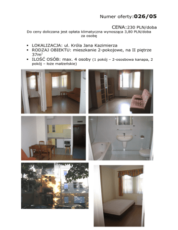 Numer oferty:026/05 CENA:230 PLN/doba Do ceny doliczana jest opłata klimatyczna wynosząca 3,80 PLN/doba za osobę LOKALIZACJA: ul. Króla Jana Kazimierza RODZAJ OBIEKTU: mieszkanie 2-pokojowe, na II piętrze 37m2 ILOŚĆ OSÓB: max. 4 osoby (1 pokój – 2-ososbowa kanapa, 2 pokój – łoŜe małŜeńskie) Numer oferty: 026/05 LOKALIZACJA: ul. Króla Jana Kazimierza Lp. PRZEDMIOT OCENY UWAGI 1. Nowe/stare budownictwo Nowe budownictwo 2. Nowe/stare meble Nowe meble 3. Parking na posesji/GaraŜ Miejsce parkingowe za szlabanem na osiedlu 4. Balkon / taras / ogródek Nie 5. Telewizor (Kablówka, TV Sat), Radio TV, radio 6. Dostęp do telefonu Nie 7. Dostęp do internetu Internet kabel Kuchnia Kuchnia łączona z pokojem, kuchenka elektryczna, czajnik bezprzewodowy, wyposaŜenie w sztućce, zastawę i garnki Łazienka Łazienka z wanną i WC 10. Pościel, ręczniki Tak 11. Dostęp do szafy / półek Tak 12. Pobyt ze zwierzątkiem Do uzgodnienia 13. Pokój zamykany na klucz 14. Niepełnosprawni (winda, podjazd) Obiekt nieprzystosowany 15. Plac zabaw dla dzieci Nie 16. 17. Lokalizacja • Centrum – Dworzec PKP • PlaŜa, park • Dzielnica • Komunikacja miejska Osoby palące Nie 18. Piwnica/schowek Nie 19. Faktura VAT lub Rachunek rachunek 20. Inne Ŝelazko 8. 9. Ładne osiedle, blisko centrum, 10 min od Dworca PKP/SKM, do plaŜy 900 m, w pobliŜu przystanek autobusowy (122, 143, 187, 185)