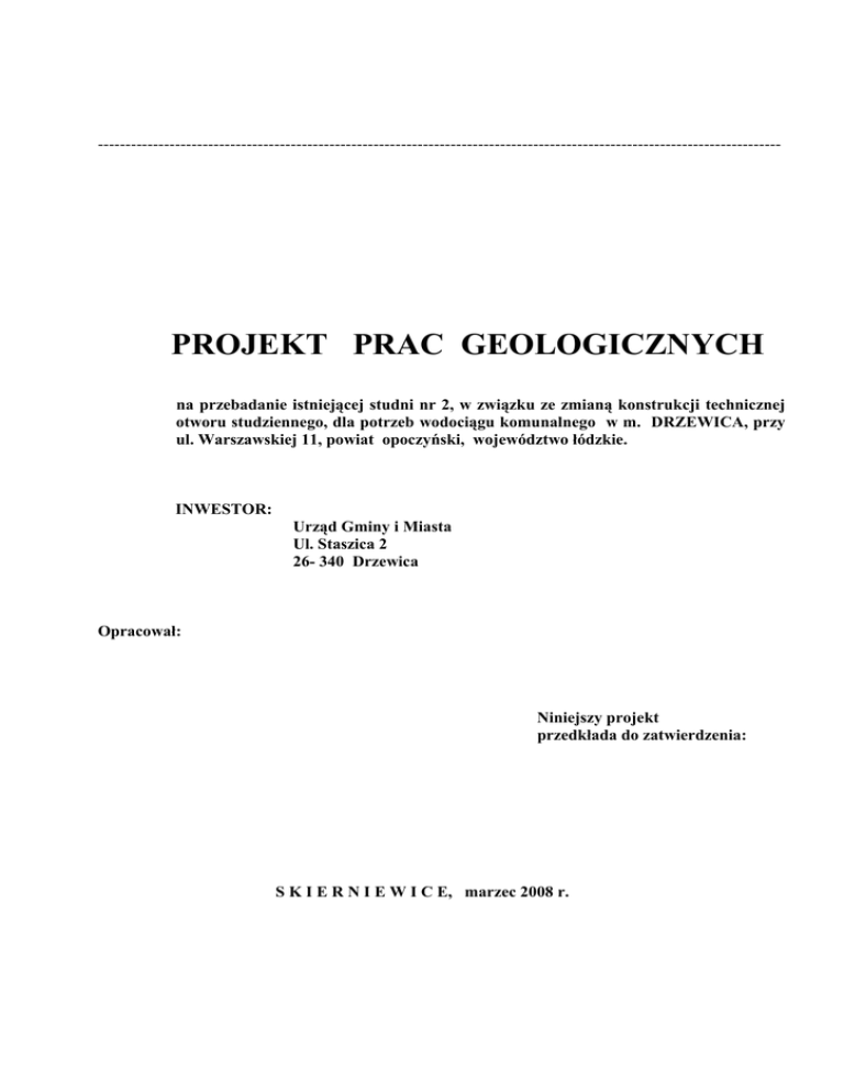 ---------------------------------------------------------------------------------------------------------------------------- PROJEKT PRAC GEOLOGICZNYCH na przebadanie istniejącej studni nr 2, w związku ze zmianą konstrukcji technicznej otworu studziennego, dla potrzeb wodociągu komunalnego w m. DRZEWICA, przy ul. Warszawskiej 11, powiat opoczyński, województwo łódzkie. INWESTOR: Urząd Gminy i Miasta Ul. Staszica 2 26- 340 Drzewica Opracował: Niniejszy projekt przedkłada do zatwierdzenia: S K I E R N I E W I C E, marzec 2008 r. Projekt prac geologicznych na przebadanie istniejącej studni nr 2, w związku ze zmianą konstrukcji technicznej otworu studziennego, dla potrzeb wodociągu komunalnego w m. DRZEWICA, przy ul. Warszawskiej 11, powiat opoczyński, województwo łódzkie. 2 ----------------------------------------------------------------------------------------------------------------------------------------------------- SPIS TREŚCI: Str. I. Wstęp II. Lokalizacja i morfologia terenu III. Opis wyników dotychczasowych prac i badań IV. Szczegółowy zakres prac geologicznych V. Wykonywanie robót wchodzących w zakres przedsięwzięcia VI. Wskaźnikowy koszt projektowanych prac i badań VII. Wnioski i zalecenia końcowe 3 4 4 8 10 11 11 Spis załączników graficznych: 1. 2. 3. 4. 5. 6. 7. Mapa sytuacyjno-wysokościowa w skali 1: 50 000, Mapa sytuacyjno-wysokościowa w skali 1 : 10 000, Mapa sytuacyjno-wysokościowa w skali 1 : 500, Zbiorcze zestawienie wyników studni nr 1 w skali 1 : 300 Projekt geologiczno-techniczny zmiany konstrukcji technicznej studni nr 2 w skali 1 : 300, Kserokopia decyzji zasobowej. Kserokopia decyzji wodnoprawnej na pobór wód podziemnych. Projekt prac geologicznych na przebadanie istniejącej studni nr 2, w związku ze zmianą konstrukcji technicznej otworu studziennego, dla potrzeb wodociągu komunalnego w m. DRZEWICA, przy ul. Warszawskiej 11, powiat opoczyński, województwo łódzkie. 3 ----------------------------------------------------------------------------------------------------------------------------------------------------- I. WSTĘP Przedmiotowy projekt prac geologicznych opracowano na zlecenie Urzędu Gminy i Miasta w Drzewicy. Celem opracowania jest zaprojektowanie zakresu prac i badań na wykonanie zmiany konstrukcji technicznej studni nr 2 dla potrzeb ujęcia komunalnego w miejscowości DRZEWICA, przy ul. Warszawskiej 11, powiat opoczyński, woj. łódzkie (zał. nr 1). Rezultatem projektowanych prac powinna być poprawa wydajności eksploatacyjnej studni nr 2 oraz jakości wody (zmniejszenie zawartości związków żelaza) Zapotrzebowanie na wodę zostało określone przez zleceniodawcę na Q = do 50 - 90 m3/h. Ujęcie wodociągu komunalnego w Drzewicy składa się z dwóch studni głębinowych; nr 1 o głębokości 63,0 m. wykonanej w roku 1975 roku przez Przedsiębiorstwo Zaopatrzenia Rolnictwa w Wodę „WODROL” w Kielcach, przy ul. Armii Czerwonej 106 oraz studni nr 2 o głębokości 135,3 m. wykonanej w latach 1980-1982 przez Przedsiębiorstwo Zaopatrzenia Rolnictwa w Wodę „WODROL” w Pruszkowie z/s przy ul. St. Bryły 2. Zasoby eksploatacyjne tego ujęcia, w wysokości Q = 142,0 m3/h, przy depresji s = 11,15 – 29,20 m, zostały ustalone decyzją Wojewody Radomskiego z dnia 12.08.1983 r. znak: GWOS.III.8530/19/83 (zał. nr 6). W ramach ustalonych zasobów eksploatacyjnych studnie nr 1 i nr 2 mogą być eksploatowane z następującymi wydajnościami eksploatacyjnymi: - Qe = 90,0 m3/h, przy depresji se = 11,15 m. – studnia nr 1, - Qe = 52,0 m3/h, przy depresji se = 29,20 m. – studnia nr 2. Wodociąg komunalny w Drzewicy, którego głównym źródłem zaopatrzenia w wodę jest obecnie studnia nr 1, zaopatruje w wodę miasto Drzewica oraz okoliczne wsie: Zakościele, Dabrówka, Żardki, Żdzary i Domaszewo. Wodociąg komunalny posiada awaryjne połączenie z grupowym wodociągiem wiejskim w m. Strzyżów. Użytkownik ujęcia, Przedsiębiorstwo Gospodarki Komunalnej i Mieszkaniowej Sp. z o.o. w Drzewicy, eksploatuje ujęcie na podstawie aktualnego pozwolenia wodnoprawnego na pobór wód podziemnych, które zostało udzielone przez Starostę Opoczyńskiego, w ilości: Qmaxh = 98,40 m3/h i Qmaxd.= 1 298,0 m3/d. – decyzja Starosty Opoczyńskiego z dnia 25.08.2000 r. znak: OS.III.6223-/G/4/00 (zał. nr 7). Pozwolenie wodnoprawne zostało udzielone do dnia 31.12.2010 r. Studnie ujmują do eksploatacji jurajski poziom wodonośny, którego zwierciadło wody o charakterze swobodnym zostało nawiercone i stabilizowało się na poziomie około 11,7 m. p.p. terenu w studni nr 1 oraz około 9,7 m. p.p. terenu w studni nr 2. W związku ze wzrostem zawartości związków żelaza oraz depresji eksploatacyjnej w studni nr 2, co w konsekwencji spowodowało konieczność ograniczenia jej wydajności eksploatacyjnej do około Qe = 20,0 m3/h, użytkownik ujęcia podjął decyzję o przeprowadzeniu zmiany konstrukcji studni nr 2. Projekt prac geologicznych na przebadanie istniejącej studni nr 2, w związku ze zmianą konstrukcji technicznej otworu studziennego, dla potrzeb wodociągu komunalnego w m. DRZEWICA, przy ul. Warszawskiej 11, powiat opoczyński, województwo łódzkie. 4 ----------------------------------------------------------------------------------------------------------------------------------------------------- Niniejszy projekt prac geologicznych opracowano na podstawie materiałów archiwalnych, wizji lokalnej w terenie oraz literatury fachowej. Podlega on zatwierdzeniu przez Marszałka Województwa Łódzkiego. II. LOKALIZACJA I MORFOLOGIA TERENU. Ujęcie wód podziemnych wodociągu wiejskiego w m. Drzewica zlokalizowane jest w północno-wschodniej części miasta, przy ul. Warszawskiej 11 (zał. nr 2). Działka wodociągowa, na której położone jest ujęcie oraz stacja uzdatniania wody wraz z obiektami towarzyszącymi lokalizowana jest przy wyjeździe z miasta, po lewej stronie drogi asfaltowej prowadząc