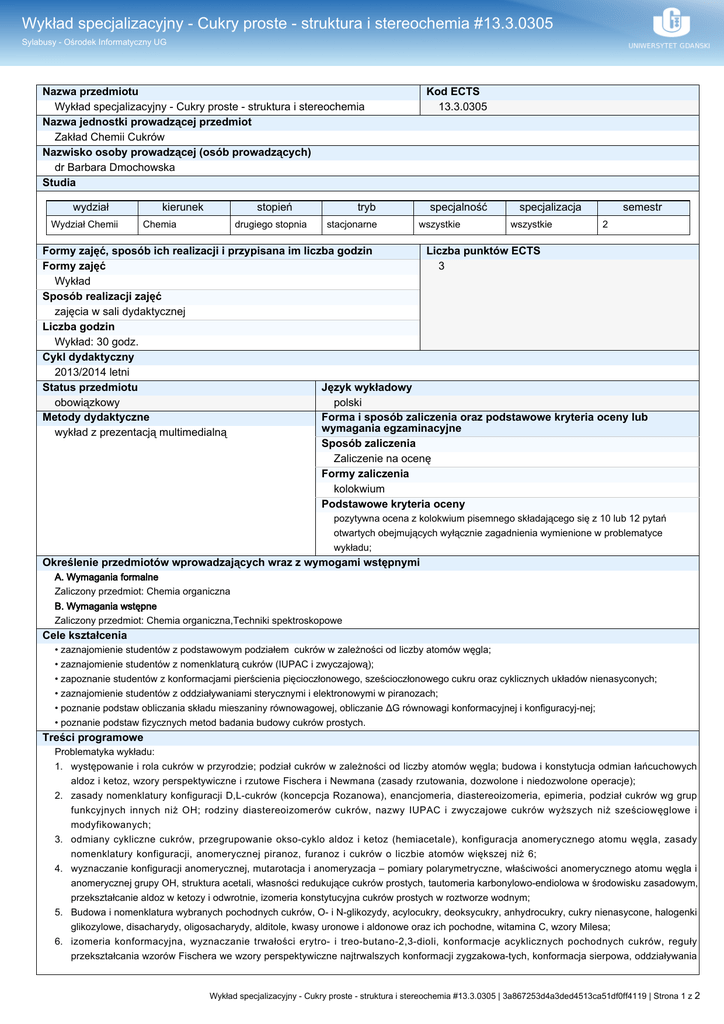 Wykład specjalizacyjny - Cukry proste - struktura i stereochemia #13.3.0305 Sylabusy - Ośrodek Informatyczny UG Nazwa przedmiotu Wykład specjalizacyjny - Cukry proste - struktura i stereochemia Nazwa jednostki prowadzącej przedmiot Zakład Chemii Cukrów Nazwisko osoby prowadzącej (osób prowadzących) dr Barbara Dmochowska Studia wydział Wydział Chemii kierunek Chemia stopień drugiego stopnia Kod ECTS 13.3.0305 tryb stacjonarne specjalność wszystkie specjalizacja wszystkie semestr 2 Formy zajęć, sposób ich realizacji i przypisana im liczba godzin Liczba punktów ECTS Formy zajęć 3 Wykład Sposób realizacji zajęć zajęcia w sali dydaktycznej Liczba godzin Wykład: 30 godz. Cykl dydaktyczny 2013/2014 letni Status przedmiotu Język wykładowy obowiązkowy polski Metody dydaktyczne Forma i sposób zaliczenia oraz podstawowe kryteria oceny lub wymagania egzaminacyjne wykład z prezentacją multimedialną Sposób zaliczenia Zaliczenie na ocenę Formy zaliczenia kolokwium Podstawowe kryteria oceny pozytywna ocena z kolokwium pisemnego składającego się z 10 lub 12 pytań otwartych obejmujących wyłącznie zagadnienia wymienione w problematyce wykładu; Określenie przedmiotów wprowadzających wraz z wymogami wstępnymi A. Wymagania formalne Zaliczony przedmiot: Chemia organiczna B. Wymagania wstępne Zaliczony przedmiot: Chemia organiczna,Techniki spektroskopowe Cele kształcenia • zaznajomienie studentów z podstawowym podziałem cukrów w zależności od liczby atomów węgla; • zaznajomienie studentów z nomenklaturą cukrów (IUPAC i zwyczajową); • zapoznanie studentów z konformacjami pierścienia pięcioczłonowego, sześcioczłonowego cukru oraz cyklicznych układów nienasyconych; • zaznajomienie studentów z oddziaływaniami sterycznymi i elektronowymi w piranozach; • poznanie podstaw obliczania składu mieszaniny równowagowej, obliczanie ΔG równowagi konformacyjnej i konfiguracyj-nej; • poznanie podstaw fizycznych metod badania budowy cukrów prostych. Treści programowe Problematyka wykładu: 1. występowanie i rola cukrów w przyrodzie; podział cukrów w zależności od liczby atomów węgla; budowa i konstytucja odmian łańcuchowych aldoz i ketoz, wzory perspektywiczne i rzutowe Fischera i Newmana (zasady rzutowania, dozwolone i niedozwolone operacje); 2. zasady nomenklatury konfiguracji D,L-cukrów (koncepcja Rozanowa), enancjomeria, diastereoizomeria, epimeria, podział cukrów wg grup funkcyjnych innych niż OH; rodziny diastereoizomerów cukrów, nazwy IUPAC i zwyczajowe cukrów wyższych niż sześciowęglowe i modyfikowanych; 3. odmiany cykliczne cukrów, przegrupowanie okso-cyklo aldoz i ketoz (hemiacetale), konfiguracja anomerycznego atomu węgla, zasady nomenklatury konfiguracji, anomerycznej piranoz, furanoz i cukrów o liczbie atomów większej niż 6; 4. wyznaczanie konfiguracji anomerycznej, mutarotacja i anomeryzacja – pomiary polarymetryczne, właściwości anomerycznego atomu węgla i anomerycznej grupy OH, struktura acetali, własności redukujące cukrów prostych, tautomeria karbonylowo-endiolowa w środowisku zasadowym, przekształcanie aldoz w ketozy i odwrotnie, izomeria konstytucyjna cukrów prostych w roztworze wodnym; 5. Budowa i nomenklatura wybranych pochodnych cukrów, O- i N-glikozydy, acylocukry, deoksycukry, anhydrocukry, cukry nienasycone, halogenki glikozylowe, disacharydy, oligosacharydy, alditole, kwasy uronowe i aldonowe oraz ich pochodne, witamina C, wzory Milesa; 6. izomeria konformacyjna, wyznaczanie trwałości erytro- i treo-butano-2,3-dioli, konformacje acyklicznych pochodnych cukrów, reguły przekształcania wzorów Fischera we wzory perspektywiczne najtrwalszych konformacji zygzakowa-tych, konformacja sierpowa, oddziaływania Wykład specjalizacyjny - Cukry proste - struktura i stereochemia #13.3.0305 | 3a867253d4a3ded4513ca51df0ff4119 | Strona 1 z 2 Wykład specjalizacyjny - Cukry proste - struktura i stereochemia #13.3.0305 Sylabusy - Ośrodek Informatyczny UG destabilizacyjne 1,2-sc i 1,3-syn; 7. konformacje pierścieni piranozowych, zasady nomenklatury konformacji, używanie symboli konformacyjnych dla rozróżnienia epimerów i diastereoizomerów konformacyjnych cukrów, mapa przekształceń konformacyjnych pierścienia cukrowego, porównanie wykresu energetycznego cukrów i cykloheksanu, oddziaływania steryczne i elektronowe w piranozach, matematyczne zależności, czynniki wpływające na całkowitą wartość energii odmian konformacyjnych piranoz, sposób wyznaczania wartości energii oddziaływań niewiążących na podstawie badania równowag powstawania kompleksów boranowych modelowych cyklitoli i wybranych par anomerów cukrów i ich pochodnych, oddziaływania destabilizujące; 8. obliczanie ΔG równowagi konformacyjnej i konfiguracyjnej, efekt anomeryczny, czynniki wpływające na wielkość efektu anomerycznego, wpływ na trwałość konformacji cukru, odwrócony efekt anomeryczny, efekty rozpuszczalnikowe, efekt egzoanomeryczny; 9. fizyczne metody badania budowy cząsteczki cukru: spektroskopia w podczerwieni (cechy widm), spektroskopia NMR (czynniki wpływające na wartość delta, wpływ obecności i orientacji aksjalnych grup np. OAc na delta, wyznaczanie składu mieszaniny równowagowej wolnych cukrów w D2O, wyznaczanie konfiguracji pentopiranoz w stosunku do standardowej beta-D-ksylopiranozy, sprzeżenia spinowo-spinowe, czynniki wpływające na zależność stałej sprzeżenia, relacje konfiguracyjne protonów w pierścieniach piranozowych i furanozowych, określanie konfiguracji i konformacji pierścieni cukrowych na podstawie deltaH1 oraz J1,2, sprzęganie dalekiego zasięgu, analiza widm, porównanie widm 13C NMR furanoz i piranoz); 10. metody chiralooptyczne (czynność optyczna, dichroizm kołowy, Efekt Cottona – krzywa ORD, czynniki wpływające na znak i wielkość Efektu Cottona). Wykaz literatury A. Literatura wymagana do ostatecznego zaliczenia zajęć (zdan