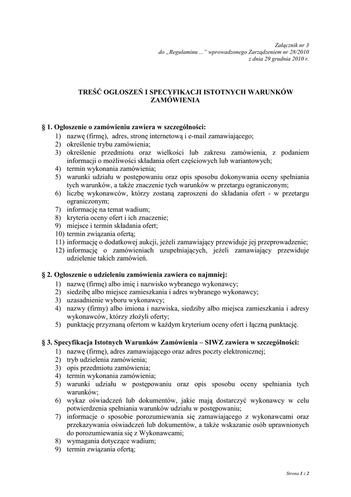 Załącznik nr 3 do „Regulaminu ...” wprowadzonego Zarządzeniem nr 28/2010 z dnia 29 grudnia 2010 r. TREŚĆ OGŁOSZEŃ I SPECYFIKACJI ISTOTNYCH WARUNKÓW ZAMÓWIENIA § 1. Ogłoszenie o zamówieniu zawiera w szczególności: 1) nazwę (firmę), adres, stronę internetową i e-mail zamawiającego; 2) określenie trybu zamówienia; 3) określenie przedmiotu oraz wielkości lub zakresu zamówienia, z podaniem informacji o możliwości składania ofert częściowych lub wariantowych; 4) termin wykonania zamówienia; 5) warunki udziału w postępowaniu oraz opis sposobu dokonywania oceny spełniania tych warunków, a także znaczenie tych warunków w przetargu ograniczonym; 6) liczbę wykonawców, którzy zostaną zaproszeni do składania ofert - w przetargu ograniczonym; 7) informację na temat wadium; 8) kryteria oceny ofert i ich znaczenie; 9) miejsce i termin składania ofert; 10) termin związania ofertą; 11) informację o dodatkowej aukcji, jeżeli zamawiający przewiduje jej przeprowadzenie; 12) informację o zamówieniach uzupełniających, jeżeli zamawiający przewiduje udzielenie takich zamówień. § 2. Ogłoszenie o udzieleniu zamówienia zawiera co najmniej: 1) nazwę (firmę) albo imię i nazwisko wybranego wykonawcy; 2) siedzibę albo miejsce zamieszkania i adres wybranego wykonawcy; 3) uzasadnienie wyboru wykonawcy; 4) nazwy (firmy) albo imiona i nazwiska, siedziby albo miejsca zamieszkania i adresy wykonawców, którzy złożyli oferty; 5) punktację przyznaną ofertom w każdym kryterium oceny ofert i łączną punktację. § 3. Specyfikacja Istotnych Warunków Zamówienia – SIWZ zawiera w szczególności: 1) nazwę (firmę), adres zamawiającego oraz adres poczty elektronicznej; 2) tryb udzielenia zamówienia; 3) opis przedmiotu zamówienia; 4) termin wykonania zamówienia; 5) warunki udziału w postępowaniu oraz opis sposobu oceny spełniania tych warunków; 6) wykaz oświadczeń lub dokumentów, jakie mają dostarczyć wykonawcy w celu potwierdzenia spełniania warunków udziału w postępowaniu; 7) informacje o sposobie porozumiewania się zamawiającego z wykonawcami oraz przekazywania oświadczeń lub dokumentów, a także wskazanie osób uprawnionych do porozumiewania się z Wykonawcami; 8) wymagania dotyczące wadium; 9) termin związania ofertą; Strona 1 z 2 10) 11) 12) 13) 14) 15) 16) 17) 18) 19) opis sposobu przygotowywania ofert; miejsce oraz termin składania i otwarcia ofert; opis sposobu obliczenia ceny; opis kryteriów, którymi zamawiający będzie się kierował przy wyborze oferty, wraz z podaniem znaczenia tych kryteriów i sposobu oceny ofert; informacje o formalnościach, jakie powinny zostać dopełnione po wyborze oferty w celu zawarcia umowy w sprawie zamówienia; wymagania dotyczące zabezpieczenia należytego wykonania umowy; istotne dla stron postanowienia, które zostaną wprowadzone do treści zawieranej umowy w sprawie zamówienia publicznego, ogólne warunki umowy albo wzór umowy; opis części zamówienia, jeżeli zamawiający dopuszcza składanie ofert częściowych; informację o dodatkowej aukcji i trybie jej przeprowadzenia, jeżeli zamawiający przewiduje przeprowadzenie takiej aukcji; informację o przewidywanych zamówieniach uzupełniających, jeżeli zamawiający przewiduje udzielenie takich zamówień. § 4. W postępowaniach prowadzonych w trybie negocjacji z ogłoszeniem i zapytania o cenę SIWZ może zawierać jedynie wybrane elementy wskazane w § 3 w zakresie niezbędnym dla otrzymania kompletnej i prawidłowej oferty. W postępowaniach prowadzonych w trybie z wolnej ręki zamawiający nie tworzy SIWZ. Wykonawca może zwrócić się do zamawiającego o wyjaśnienie treści SIWZ jednak nie później niż na 4 dni robocze przed upływem terminu składania ofert. Zamawiający jest obowiązany udzielić wyjaśnień niezwłocznie. § 5. Treść zapytań wraz z wyjaśnieniami zamawiający przekazuje wykonawcom, którym przekazał SIWZ, bez ujawniania źródła zapytania, a jeżeli SIWZ jest udostępniana na stronie internetowej, zamieszcza na tej stronie. § 6. W uzasadnionych przypadkach zamawiający może przed upływem terminu składania ofert zmienić treść SIWZ. Dokonaną zmianę SIWZ Zamawiający przekazuje niezwłocznie wszystkim Wykonawcom, którym przekazano SIWZ, a jeżeli SIWZ jest udostępniana na stronie internetowej, zamieszcza ją także na tej stronie. § 7. Niedopuszczalne jest dokonywanie zmian w treści SIWZ po upływie terminu składania wniosków o dopuszczenie do udziału w przetargu ograniczonym, które prowadziłyby do zmiany treści ogłoszenia o zamówieniu. Strona 2 z 2