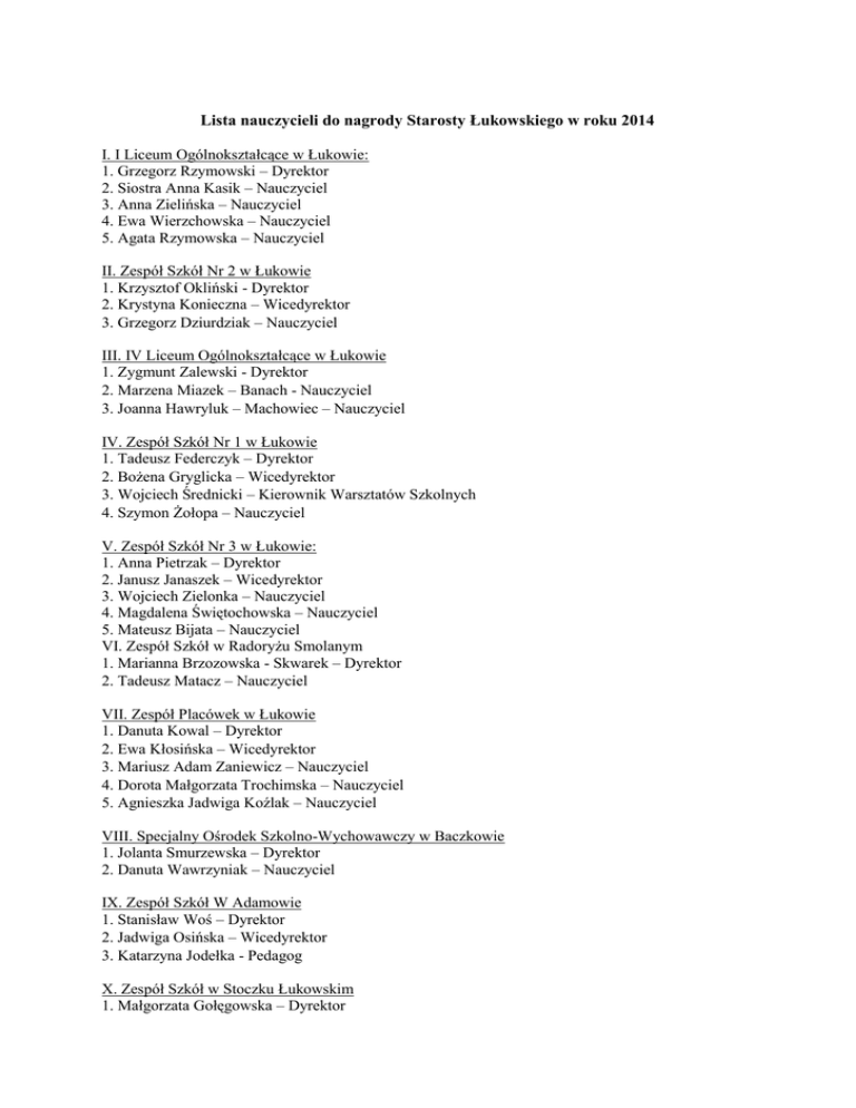 Lista nauczycieli do nagrody Starosty Łukowskiego w roku 2014 I. I Liceum Ogólnokształcące w Łukowie: 1. Grzegorz Rzymowski – Dyrektor 2. Siostra Anna Kasik – Nauczyciel 3. Anna Zielińska – Nauczyciel 4. Ewa Wierzchowska – Nauczyciel 5. Agata Rzymowska – Nauczyciel II. Zespół Szkół Nr 2 w Łukowie 1. Krzysztof Okliński - Dyrektor 2. Krystyna Konieczna – Wicedyrektor 3. Grzegorz Dziurdziak – Nauczyciel III. IV Liceum Ogólnokształcące w Łukowie 1. Zygmunt Zalewski - Dyrektor 2. Marzena Miazek – Banach - Nauczyciel 3. Joanna Hawryluk – Machowiec – Nauczyciel IV. Zespół Szkół Nr 1 w Łukowie 1. Tadeusz Federczyk – Dyrektor 2. Bożena Gryglicka – Wicedyrektor 3. Wojciech Średnicki – Kierownik Warsztatów Szkolnych 4. Szymon Żołopa – Nauczyciel V. Zespół Szkół Nr 3 w Łukowie: 1. Anna Pietrzak – Dyrektor 2. Janusz Janaszek – Wicedyrektor 3. Wojciech Zielonka – Nauczyciel 4. Magdalena Świętochowska – Nauczyciel 5. Mateusz Bijata – Nauczyciel VI. Zespół Szkół w Radoryżu Smolanym 1. Marianna Brzozowska - Skwarek – Dyrektor 2. Tadeusz Matacz – Nauczyciel VII. Zespół Placówek w Łukowie 1. Danuta Kowal – Dyrektor 2. Ewa Kłosińska – Wicedyrektor 3. Mariusz Adam Zaniewicz – Nauczyciel 4. Dorota Małgorzata Trochimska – Nauczyciel 5. Agnieszka Jadwiga Koźlak – Nauczyciel VIII. Specjalny Ośrodek Szkolno-Wychowawczy w Baczkowie 1. Jolanta Smurzewska – Dyrektor 2. Danuta Wawrzyniak – Nauczyciel IX. Zespół Szkół W Adamowie 1. Stanisław Woś – Dyrektor 2. Jadwiga Osińska – Wicedyrektor 3. Katarzyna Jodełka - Pedagog X. Zespół Szkół w Stoczku Łukowskim 1. Małgorzata Gołęgowska – Dyrektor 2. Alicja Rojek – Nauczyciel XI. Poradnia Psychologiczno – Pedagogiczna w Łukowie 1. Zofia Skrzymowska – Dyrektor 2. Agnieszka Kubiak -Psycholog