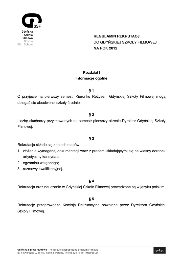 ! ! ! ! REGULAMIN REKRUTACJI ! ! ! ! DO GDYŃSKIEJ SZKOŁY FILMOWEJ ! ! ! ! NA ROK 2012 Rozdział I Informacje ogólne §1 O przyjęcie na pierwszy semestr Kierunku Reżyserii Gdyńskiej Szkoły Filmowej mogą ubiegać się absolwenci szkoły średniej. §2 Liczbę słuchaczy przyjmowanych na semestr pierwszy określa Dyrektor Gdyńskiej Szkoły Filmowej. §3 Rekrutacja składa się z trzech etapów: 1. złożenia wymaganej dokumentacji wraz z pracami składającymi się na własny dorobek artystyczny kandydata; 2. egzaminu wstępnego; 3. rozmowy kwalifikacyjnej. §4 Rekrutacja oraz nauczanie w Gdyńskiej Szkole Filmowej prowadzone są w języku polskim. §5 Rekrutację przeprowadza Komisja Rekrutacyjna powołana przez Dyrektora Gdyńskiej Szkoły Filmowej. Rozdział II Dokumentacja i dorobek artystyczny kandydata §6 Kandydaci ubiegający się o przyjęcie na semestr pierwszy powinni złożyć następujące dokumenty: 1. wypełniony Wniosek Rekrutacyjny, dostępny na stronie internetowej www.gsf.pl; 2. świadectwo maturalne lub świadectwo ukończenia szkoły średniej; 3. dwa zdjęcia legitymacyjne; 4. kserokopię dowodu osobistego; 5. życiorys wraz z uzasadnieniem dlaczego kandydat chciałby zostać słuchaczem Gdyńskiej Szkoły Filmowej; 6. zaświadczenie lekarskie o braku przeciwwskazań zdrowotnych do kształcenia w zawodzie reżysera; 7. pisemne potwierdzenie wniesienia opłaty rekrutacyjnej w formie przelewu na konto bankowe Pomorskiej Fundacji Filmowej w Gdyni lub gotówką w sekretariacie Gdyńskiej Szkoły Filmowej. §7 Do określonej w § 5 niniejszego Regulaminu dokumentacji kandydat powinien dołączyć prace składające się na jego dorobek artystyczny. Do obowiązkowych prac należą: 1. krótki film fabularny lub dokumentalny lub animowany (od 15 sekund od 10 minut), zrealizowany w dowolnej technice i umieszczony na płycie DVD-Video lub w postaci plików w jednym z czterech popularnych formatów: MOV, MPEG, MP4 lub AVI. 2. prace literackie w postaci: a) pomysłu na scenariusz krótkiego filmu fabularnego o wyraźnie zarysowanej historii fabularnej (maksymalnie 5400 znaków ze spacjami, 3 strony A4,); b) pomysłu na scenariusz krótkiego filmu dokumentalnego, którego bohater związany jest z Gdynią, Sopotem, Gdańskiem lub Kaszubami (maksymalnie 1800 znaków ze spacjami, 1 strona A4); Prace literackie należy podpisać imieniem i nazwiskiem. 3. prace fotograficzne na zadany temat - do wyboru: „Moja Europa!” lub „Jak żyć?”. Prace fotograficzne należy podpisać imieniem i nazwiskiem oraz zatytułować wybranym tematem zadania. §8 Kandydat może dołączyć także inne prace o charakterze filmowym, literackim, fotograficznym lub plastycznym, stanowiące jego dorobek artystyczny. §9 Wniosek Rekrutacyjny oraz wszystkie wymagane dokumenty wraz z pracami składającymi się na własny dorobek artystyczny kandydata należy umieścić w podpisanej teczce i przesłać lub dostarczyć osobiście do sekretariatu Gdyńskiej Szkoły Filmowej, na adres 81-547 Gdynia, ul. Folwarczna 2 z dopiskiem REKRUTACJA GSF 2012. § 10 Określona w niniejszym rozdziale dokumentacja oraz dorobek artystyczny będzie oceniany przez Komisję Rekrutacyjną. W przypadku pozytywnej oceny, kandydat będzie mógł przystąpić do kolejnego etapu rekrutacji - egzaminu wstępnego. Rozdział III Egzamin wstępny § 11 Egzamin wstępny składa się z czterech zadań: 1. zadania scenariuszowego; 2. zadania narracyjnego; 3. pracy z aktorem; 4. dodatkowego ćwiczenia egzaminacyjnego. § 12 Zadanie scenariuszowe będzie polegało na napisaniu krótkiej opowieści filmowej na zadany temat. § 13 Zadanie narracyjne będzie polegało na ułożeniu historii na podstawie fotosów z filmu fabularnego. § 14 Zadanie „praca z aktorem” będzie polegało na wyreżyserowaniu scenki na zadany temat. § 15 Dodatkowe ćwiczenie egzaminacyjne możne zostać zadane kandydatowi przez każdego z członków Komisji Rekrutacyjnej w przypadku wątpliwości w ocenie kandydata. Rozdział IV Rozmowa kwalifikacyjna § 16 Prowadzona przez Komisję Rekrutacyjną rozmowa z kandydatem będzie dotyczyła złożonych przez niego prac, składających się na jego dorobek artystyczny oraz wykonanych przez kandydata ćwiczeń podczas egzaminów wstępnych. Rozdział V Terminy rekrutacji § 17 Rekrutację przeprowadza się w następujących terminach: 1. Od 15 lutego 2012 r. do 15 maja 2012 r. - dostarczenie wszystkich wymaganych dokumentów wraz z pracami składającymi się na własny dorobek artystyczny kandydata. 2. 15 czerwca 2012 r. - ogłoszenie listy kandydatów dopuszczonych przez Komisję Rekrutacyjną do kolejnego etapu rekrutacji - egzaminu wstępnego. 3. Od 30 czerwca 2012 r. do 3 lipca 2012 r. - egzamin wstępny. 4. 3 lipca 2012 r.- ogłoszenie listy kandydatów dopuszczonych przez Komisję Rekrutacyjną do ostatniego etapu rekrutacji - rozmowy kwalifikacyjnej. 5. 4 lipca 2012 r.- rozmowa kwalifikacyjna. 6. 5 lipca 2012 r.- ogłoszenie wyników rekrutacji. Rozdział VI Opłata rekrutacyjna § 18 1. Rekrutacja do Gdyńskiej Szkoły Filmowej jest płatna. 2. Wniesienie opłaty rekrutacyjnej w wysokości 150,00 PLN jest warunkiem dopuszczenia kandydata do rekrutacji. 3. Opłatę rekrutacyjną wnosi się w terminie do 15 maja 2012 r, przelewem na konto bankowe Pomorskiej Fundacji Filmowej w Gdyni NORDEA BANK POLSKA S.A. O/ GDYNIA 86 1440 1026 0000 0000 1045 61 42 lub gotówką w sekretariacie Gdyńskiej Szkoły Filmowej w Gdyni, przy ul. Folwarcznej 2. 4. W przypadku dokonania opłaty rekrutacyjnej na konto bankowe Pomorskiej Fundacji FIlmowej w Gdyni kandydat powinien złożyć wraz z dokumentami pisemne potwierdzenie dokonania przelewu. 5. Opłata rekrutacyjna nie podlega zwrotowi. 6. W przypadku nie uiszczenia opłaty w wymaganym terminie, dokumentacja złożona przez kandydata nie będzie rozpatrywana. Rozdział VII Postanowienia końcowe § 18 Wszyscy kandydaci umieszczeni na liście osób przyjętych na pierwszy 