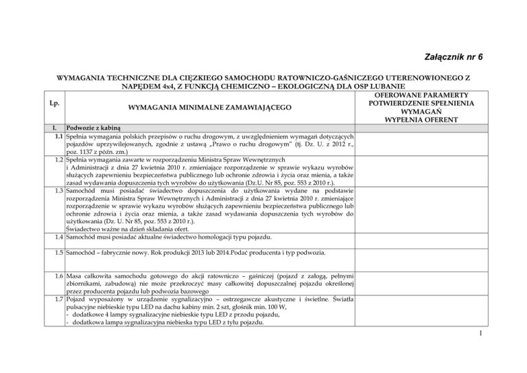 Załącznik nr 6 WYMAGANIA TECHNICZNE DLA CIĘZKIEGO SAMOCHODU RATOWNICZO-GAŚNICZEGO UTERENOWIONEGO Z NAPĘDEM 4x4, Z FUNKCJĄ CHEMICZNO – EKOLOGICZNĄ DLA OSP LUBANIE Lp. WYMAGANIA MINIMALNE ZAMAWIAJĄCEGO OFEROWANE PARAMERTY POTWIERDZENIE SPEŁNIENIA WYMAGAŃ WYPEŁNIA OFERENT I. Podwozie z kabiną 1.1 Spełnia wymagania polskich przepisów o ruchu drogowym, z uwzględnieniem wymagań dotyczących pojazdów uprzywilejowanych, zgodnie z ustawą „Prawo o ruchu drogowym” (tj. Dz. U. z 2012 r., poz. 1137 z późn. zm.) 1.2 Spełnia wymagania zawarte w rozporządzeniu Ministra Spraw Wewnętrznych i Administracji z dnia 27 kwietnia 2010 r. zmieniające rozporządzenie w sprawie wykazu wyrobów służących zapewnieniu bezpieczeństwa publicznego lub ochronie zdrowia i życia oraz mienia, a także zasad wydawania dopuszczenia tych wyrobów do użytkowania (Dz.U. Nr 85, poz. 553 z 2010 r.). 1.3 Samochód musi posiadać świadectwo dopuszczenia do użytkowania wydane na podstawie rozporządzenia Ministra Spraw Wewnętrznych i Administracji z dnia 27 kwietnia 2010 r. zmieniające rozporządzenie w sprawie wykazu wyrobów służących zapewnieniu bezpieczeństwa publicznego lub ochronie zdrowia i życia oraz mienia, a także zasad wydawania dopuszczenia tych wyrobów do użytkowania (Dz. U. Nr 85, poz. 553 z 2010 r.). Świadectwo ważne na dzień składania ofert. 1.4 Samochód musi posiadać aktualne świadectwo homologacji typu pojazdu. 1.5 Samochód – fabrycznie nowy. Rok produkcji 2013 lub 2014.Podać producenta i typ podwozia. 1.6 Masa całkowita samochodu gotowego do akcji ratowniczo – gaśniczej (pojazd z załogą, pełnymi zbiornikami, zabudową) nie może przekroczyć masy całkowitej dopuszczalnej pojazdu określonej przez producenta pojazdu lub podwozia bazowego 1.7 Pojazd wyposażony w urządzenie sygnalizacyjno – ostrzegawcze akustyczne i świetlne. Światła pulsacyjne niebieskie typu LED na dachu kabiny min. 2 szt, głośnik min. 100 W, - dodatkowe 4 lampy sygnalizacyjne niebieskie typu LED z przodu pojazdu, - dodatkowa lampa sygnalizacyjna niebieska typu LED z tyłu pojazdu. 1 Lp. WYMAGANIA MINIMALNE ZAMAWIAJĄCEGO OFEROWANE PARAMERTY POTWIERDZENIE SPEŁNIENIA WYMAGAŃ WYPEŁNIA OFERENT 1.8 W przedziale autopompy musi być zainstalowany dodatkowy głośnik + mikrofon współpracujący z radiotelefonem przewoźnym. 1.9 Podwozie pojazdu z silnikiem o zapłonie samoczynnym, spełniającym wymogi odnośnie czystości spalin zgodnie z obowiązującymi w tym zakresie przepisami. Silnik o mocy minimum 340KM. 1.10 Maksymalna wysokość całkowita max. 3300 mm Maksymalna wysokość górnej krawędzi najwyższej półki w położeniu roboczym lub szuflady nie może przekroczyć 1800 mm od poziomu gruntu, lub odchylanych podestów roboczych. Sprzęt rozmieszczony grupowo w zależności od przeznaczenia z zachowaniem ergonomii. 1.11 Napęd 4x4, skrzynia redukcyjna do jazdy w terenie, blokady mechanizmów różnicowych min.: - międzyosiowego - osi tylnej - osi przedniej 1.12 Kabina czterodrzwiowa, jednomodułowa, zapewniająca dostęp do silnika, w układzie miejsc 1+1+4 (siedzenia przodem do kierunku jazdy). 1.13 Kabina wyposażona w: - indywidualne oświetlenie nad siedzeniem dowódcy, - niezależny układ ogrzewania i wentylacji umożliwiający ogrzewanie kabiny przy wyłączonym silniku - wywietrznik dachowy, - klimatyzację, - zewnętrzną osłonę przeciwsłoneczną, - elektrycznie regulowane lusterka po stronie kierowcy i dowódcy, - lusterko rampowe - krawężnikowe z prawej strony, - lusterko rampowe - dojazdowe przednie, - elektrycznie sterowane szyby po stronie kierowcy i dowódcy, - uchwyt do trzymania w tylnej części kabiny, - schowek pod siedziskami w tylnej części kabiny, - podest do ładowania radiostacji przenośnych i latarek, 2 Lp. 1.14 1.15 1.16 1.17 1.18 1.19 1.20 1.21 1.22 1.23 WYMAGANIA MINIMALNE ZAMAWIAJĄCEGO OFEROWANE PARAMERTY POTWIERDZENIE SPEŁNIENIA WYMAGAŃ WYPEŁNIA OFERENT - radio samochodowe z odtwarzaczem mp3, - reflektor ręczny (szperacz) do oświetlenia numerów budynków, - radiotelefon samochodowy o parametrach: częstotliwość VHF 136-174 MHz, moc 1÷25 W, odstęp międzykanałowy 12,5 kHz dostosowany do użytkowania w sieci MSWiA min. 128 kanałów, wyświetlacz alfanumeryczny min 14 znaków. Radiotelefon podłączony do instalacji antenowej zakończonej antena radiową przystosowaną do pracy w sieci MSWiA. Obrotowy potencjometr siły głosu. Kabina wyposażona dodatkowo: - w uchwyty na cztery aparaty oddechowe umieszczone w oparciach siedzeń, - odblokowanie każdego aparatu indywidualnie, - dźwignia odblokowująca o konstrukcji uniemożliwiającej przypadkowe odblokowanie. Fotele wyposażone w pasy bezpieczeństwa, siedzenia pokryte materiałem łatwo zmywalnym, odpornym na rozdarcie i ścieranie, fotele wyposażone w zagłówki, fotel dla kierowcy z regulacją wysokości, odległości i pochylenia oparcia. Instalacja elektryczna jednoprzewodowa, z biegunem ujemnym na masie lub dwuprzewodowa w przypadku zabudowy z tworzywa sztucznego. Moc alternatora i pojemność akumulatorów musi zabezpieczać pełne zapotrzebowanie na energie elektryczną przy maksymalnym obciążeniu. Instalacja elektryczna musi być wyposażona w główny wyłącznik prądu. Wyprowadzone złącze zewnętrzne instalacji pneumatycznej. Instalacja pneumatyczna pojazdu zapewniająca możliwość wyjazdu w ciągu 60 s, od chwili uruchomienia silnika samochodu, po 12 godzinnym postoju bez uzupełniania zbiorników powietrza. Równocześnie musi być zapewnione prawidłowe funkcjonowanie hamulców. Pojazd wyposażony w integralny układ do ładowania akumulatorów z zewnętrznego źródła ~230V, gniazdem przyłączeniowym z wyrzutnikiem, z wtyczką i przewodem umieszczonym po lewej stronie. Ładowarka-prostownik zamontowany w samochodzie. Złącze musi być samo rozłączalne w momencie rozruchu silnika. W kabinie kierowcy sygnalizacja podłączenia instalacji do