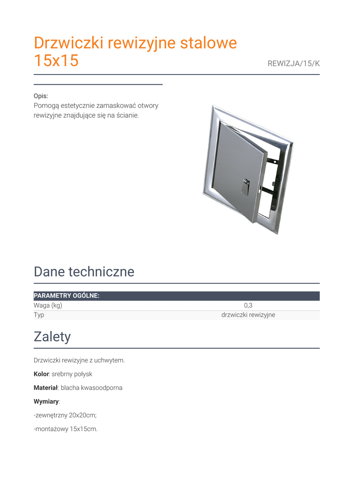 Drzwiczki rewizyjne stalowe 15x15 REWIZJA/15/K Opis: Pomogą estetycznie zamaskować otwory rewizyjne znajdujące się na ścianie. Dane techniczne PARAMETRY OGÓLNE: Waga (kg) Typ Zalety Drzwiczki rewizyjne z uchwytem. Kolor: srebrny połysk Materiał: blacha kwasoodporna Wymiary: -zewnętrzny 20x20cm; -montażowy 15x15cm. 0,3 drzwiczki rewizyjne Zwrot Klient będący Konsumentem, który zawarł Umowę sprzedaży, może w terminie 14 dni odstąpić od niej bez podawania przyczyny. Bieg terminu na odstąpienie od Umowy sprzedaży rozpoczyna się od chwili objęcia Towaru w posiadanie przez Klienta lub wskazaną przez niego osobę trzecią inną niż przewoźnik. Oświadczenie można złożyć na formularzu, którego wzór został zamieszczony przez Sprzedawcę na Stronie Internetowej Sklepu pod adresem: formularz odstąpienia. Kratki.pl Marek Bal ul. W. Gombrowicza 4 26-660 Wsola/Jedlińsk www.kratki.com tel. 48 340 10 00 Data publikacji: 25.11.2016