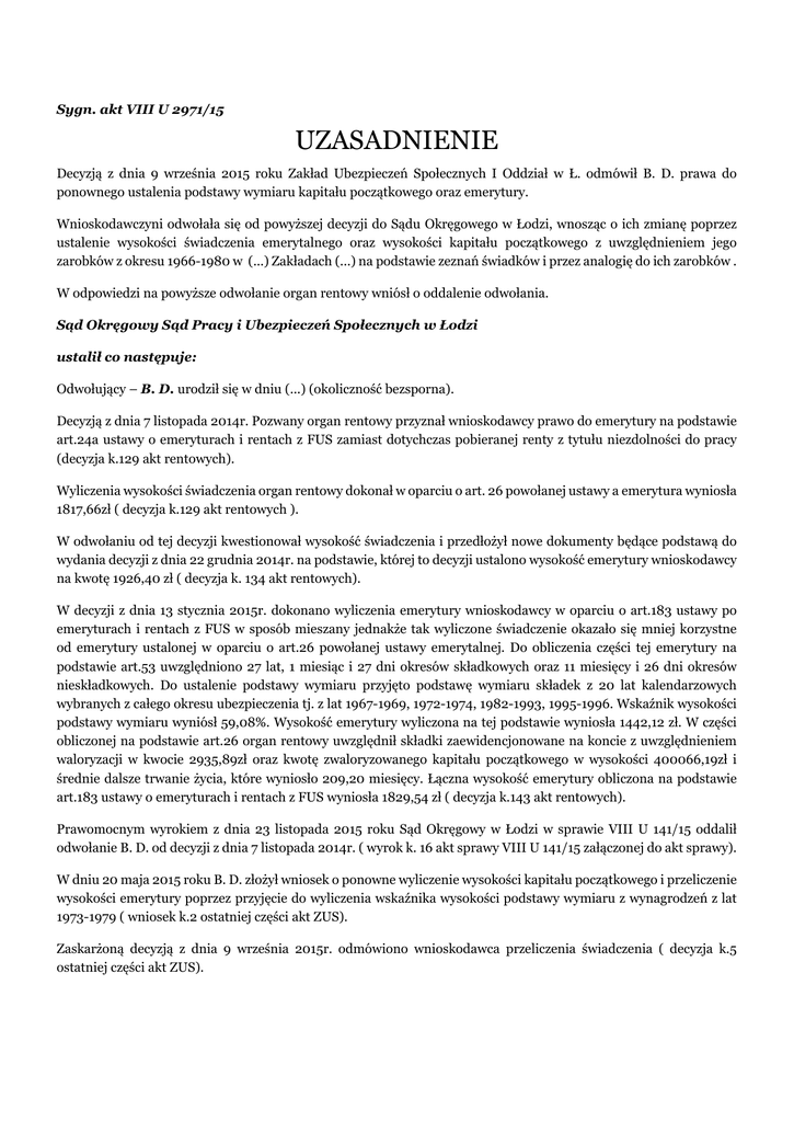 Sygn. akt VIII U 2971/15 UZASADNIENIE Decyzją z dnia 9 września 2015 roku Zakład Ubezpieczeń Społecznych I Oddział w Ł. odmówił B. D. prawa do ponownego ustalenia podstawy wymiaru kapitału początkowego oraz emerytury. Wnioskodawczyni odwołała się od powyższej decyzji do Sądu Okręgowego w Łodzi, wnosząc o ich zmianę poprzez ustalenie wysokości świadczenia emerytalnego oraz wysokości kapitału początkowego z uwzględnieniem jego zarobków z okresu 1966-1980 w (...) Zakładach (...) na podstawie zeznań świadków i przez analogię do ich zarobków . W odpowiedzi na powyższe odwołanie organ rentowy wniósł o oddalenie odwołania. Sąd Okręgowy Sąd Pracy i Ubezpieczeń Społecznych w Łodzi ustalił co następuje: Odwołujący – B. D. urodził się w dniu (...) (okoliczność bezsporna). Decyzją z dnia 7 listopada 2014r. Pozwany organ rentowy przyznał wnioskodawcy prawo do emerytury na podstawie art.24a ustawy o emeryturach i rentach z FUS zamiast dotychczas pobieranej renty z tytułu niezdolności do pracy (decyzja k.129 akt rentowych). Wyliczenia wysokości świadczenia organ rentowy dokonał w oparciu o art. 26 powołanej ustawy a emerytura wyniosła 1817,66zł ( decyzja k.129 akt rentowych ). W odwołaniu od tej decyzji kwestionował wysokość świadczenia i przedłożył nowe dokumenty będące podstawą do wydania decyzji z dnia 22 grudnia 2014r. na podstawie, której to decyzji ustalono wysokość emerytury wnioskodawcy na kwotę 1926,40 zł ( decyzja k. 134 akt rentowych). W decyzji z dnia 13 stycznia 2015r. dokonano wyliczenia emerytury wnioskodawcy w oparciu o art.183 ustawy po emeryturach i rentach z FUS w sposób mieszany jednakże tak wyliczone świadczenie okazało się mniej korzystne od emerytury ustalonej w oparciu o art.26 powołanej ustawy emerytalnej. Do obliczenia części tej emerytury na podstawie art.53 uwzględniono 27 lat, 1 miesiąc i 27 dni okresów składkowych oraz 11 miesięcy i 26 dni okresów nieskładkowych. Do ustalenie podstawy wymiaru przyjęto podstawę wymiaru składek z 20 lat kalendarzowych wybranych z całego okresu ubezpieczenia tj. z lat 1967-1969, 1972-1974, 1982-1993, 1995-1996. Wskaźnik wysokości podstawy wymiaru wyniósł 59,08%. Wysokość emerytury wyliczona na tej podstawie wyniosła 1442,12 zł. W części obliczonej na podstawie art.26 organ rentowy uwzględnił składki zaewidencjonowane na koncie z uwzględnieniem waloryzacji w kwocie 2935,89zł oraz kwotę zwaloryzowanego kapitału początkowego w wysokości 400066,19zł i średnie dalsze trwanie życia, które wyniosło 209,20 miesięcy. Łączna wysokość emerytury obliczona na podstawie art.183 ustawy o emeryturach i rentach z FUS wyniosła 1829,54 zł ( decyzja k.143 akt rentowych). Prawomocnym wyrokiem z dnia 23 listopada 2015 roku Sąd Okręgowy w Łodzi w sprawie VIII U 141/15 oddalił odwołanie B. D. od decyzji z dnia 7 listopada 2014r. ( wyrok k. 16 akt sprawy VIII U 141/15 załączonej do akt sprawy). W dniu 20 maja 2015 roku B. D. złożył wniosek o ponowne wyliczenie wysokości kapitału początkowego i przeliczenie wysokości emerytury poprzez przyjęcie do wyliczenia wskaźnika wysokości podstawy wymiaru z wynagrodzeń z lat 1973-1979 ( wniosek k.2 ostatniej części akt ZUS). Zaskarżoną decyzją z dnia 9 września 2015r. odmówiono wnioskodawca przeliczenia świadczenia ( decyzja k.5 ostatniej części akt ZUS). W okresie zatrudnienia w (...) Zakładach (...) wnioskodawca pracował w pełnym wymiarze czasu pracy obowiązującym w tym okresie i otrzymywał wynagrodzenia na podstawie stawki godzinowej na podstawie złożonych angaży ( zeznania świadków S. A. k.17 odwrót, 3 min.49 sek. , W. K. k.17 odwrót 11min. 57 sek. oraz świadka R. S. k 17 odwrót, 16 min. 48 sek., kopie angaży k.9-16). Przy uwzględnieniu wynagrodzenia na podstawie stawki godzinowej przy pełnym wymiarze czasu i załączonych angaży wskaźnik wysokości wymiaru kapitału początkowego wyniósł 76,49% a więc nadal korzystniejszy jest wskaźnik dotychczas przyjęty z dziesięciu lat 82,11%. Natomiast wskaźnik wysokości podstawy wymiaru emerytury ustalony z 20 lat kalendarzowych wynosi 67,23% i jest wyższy od dotychczas przyjętego 59,08%. Przy uwzględnieniu tego wskaźnika emerytura wyliczona w trybie art.183 wynosi 1848zł a więc nadal jest niższa od emerytury wypłacanej wnioskodawcy ustalonej w oparciu p art.26 ustawy o emeryturach i rentach z FUS wynoszącej 1926zł ( wyliczenie hipotetyczne k.24). Sąd Okręgowy Sąd Pracy i Ubezpieczeń Społecznych zważył co następuje: W świetle zebranego w sprawie materiału dowodowego oraz poczynionych na jego podstawie ustaleń faktycznych odwołanie B. D. częściowo jest zasadne tj. w zakresie w jakim domaga się ustalenia podstawy wymiaru świadczenia emerytalnego nie na podstawie minimalnego wynagrodzenia w j.g.u a na podstawie angaży natomiast niezasadne w zakresie wysokości kapitału początkowego. Zgodnie z art. 173 ustawy z dnia 17 grudnia 1998 r. o emeryturach i rentach z Funduszu Ubezpieczeń Społecznych (Dz. U. z 2009 r. nr 153 poz.1227 ze zm.), dalej: ustawa, dla ubezpieczonych urodzonych po dniu 31 grudnia 1948 r., którzy przed dniem wejścia w życie ustawy opłacali składki na ubezpieczenie społeczne lub za których składki opłacali płatnicy składek ustala się kapitał początkowy. Kapitał początkowy stanowi równowartość kwoty obliczonej według zasad określonych w art. 174 pomnożonej przez wyrażone w miesiącach średnie dalsze trwanie życia ustalone zgodnie z art. 26 ust.3 dla osób w wieku 62 lat. Wartość kapitału początkowego ustala się na dzień wejścia w życie ustawy tj. na dzień 01 stycznia 1999 r. W myśl art. 174 ust. 1 powyższej ustawy kapitał początkowy ustala się na zasadach określonych w art. 53, z uwzględnieniem ust. 2-12. Stosownie do treści art. 174 ust. 2 i 3 ustawy z dnia 17 grudnia 1998r. o emeryturach i rentach z Funduszu Ubezpiecze