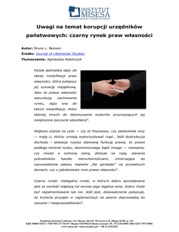 Uwagi na temat korupcji urzędników państwowych: czarny rynek praw własności Autor: Bruce L. Benson Źródło: Journal of Libertarian Studies Tłumaczenie: Agnieszka Adamczyk Każda jednostka dąży do takiej modyfikacji praw własności, która polepszy jej sytuację majątkową. Jako że prawa własności warunkują rynku, zachowania dąży ona do takich modyfikacji, które skłonią innych do dokonywania wyborów przynoszących jej zwiększone poczucie satysfakcji1. Większe szanse na zysk — czy to finansowy, czy jakikolwiek inny — mają ci, którzy umieją wykorzystywać rząd… Jeśli dystrybucja dochodu i alokacja ryzyka stanowią funkcję prawa, to prawo podlega kontroli zysku, ekonomicznego bądź innego — nieważne, czy chodzi pośredników o ochronę handlu celną, dotacje nieruchomościami, na ropę, starania zmierzające do wprowadzenia zakazu napisów „Na sprzedaż” na prywatnych domach, czy o jakiekolwiek inne prawo własności2. Czarny rynek: nielegalny rynek, w którym dobro sprzedawane jest za wartość większą niż wynosi jego legalna cena. Dobro może być reglamentowane lub nie. Jeśli jest, doświadczenie pokazuje, że kryteria przyjęte w reglamentacji na pewno doprowadzą do oszustw i niesprawiedliwości3. Fundacja Instytut Ludwiga von Misesa, 00-241 Warszawa ul. Długa 44/50, p. 214 KRS 0000174572 ▪ NIP 894 277 56 04 ▪ Regon 932949234 Bank account: PL 19 2130 0004 2001 0253 7975 0001 www.mises.pl ▪ [email protected] ▪ +48 22 6352438 Powyższe cytaty stanowią podsumowanie głównych problemów poruszonych w niniejszej pracy. Nie są to kwestie specjalnie złożone. Nawet student, który dopiero poznaje podstawy ekonomii, nie powinien mieć trudności z ich zrozumieniem, ponieważ próbuję tu jedynie dowieść, że nielegalne działania urzędników państwowych są możliwe z tych samych przyczyn, dla których możliwe są takie działania ze strony osób prywatnych. W sektorze prywatnym dochodzi do łamania prawa, ponieważ mechanizm rynkowy nie może pełnić swojej funkcji alokacyjnej. Kiedy rząd doprowadza do deficytu, blokując sprzedaż dóbr i usług po cenie wolnorynkowej, w sektorze prywatnym pojawiają się przedsiębiorcy skłonni do kupna i sprzedaży na czarnym rynku. Robią to nawet, jeśli produkcja jakiegoś dobra jest zakazana. Działania rządu mogą jednak również powodować nadwyżki. W takich wypadkach niektórzy prywatni dostawcy mają często tendencję do niezgodnego z prawem zaniżania cen lub przekupywania chętnych nabywców. Ich działalności nie określa się jeszcze mianem czarnego rynku, ale z pewnością jest to rynek nielegalny (produkcja oparta jest bowiem często na pracy nielegalnych imigrantów, którzy otrzymują niższe wynagrodzenie niż dopuszcza prawo danego kraju). Różne przejawy nielegalnych praktyk rynkowych mają rację bytu, ponieważ ustawy lub inne rządowe regulacje utrudniają konkurencyjną, wolnorynkową alokację kapitału. Nielegalne działania urzędników państwowych możliwe są z tego samego powodu4. Rządy sprawują swoje funkcje poprzez tworzenie i nadawanie praw własności, a także poprzez ich modyfikowanie. Niektóre rządowe modyfikacje zapobiegają wymianie własności lub powielaniu pewnych jej zastosowań na legalnych rynkach prywatnych. Jako że nadanie praw własności ma duży wpływ na dystrybucję dochodu i bogactwa, skutkuje ono prawie natychmiastowym rozwojem czarnego rynku. Posiadanie praw własności może być bardzo opłacalne, ze względu na zapewnioną przez nie kontrolę nad użytkowaniem określonej własności. Co więcej, korzystne może być również ich modyfikowanie, gdyż wpływa ono na zachowania rynku. Dana osoba (lub grupa osób) stara się zatem o przyznanie nowych praw własności, jak tylko jakiś produkt staje się atrakcyjny, a następnie żąda modyfikacji posiadanych praw, o ile działanie to zmotywuje nabywców do zachowywania się w korzystny dla niej sposób (pod Fundacja Instytut Ludwiga von Misesa, 00-241 Warszawa ul. Długa 44/50, p. 214 KRS 0000174572 ▪ NIP 894 277 56 04 ▪ Regon 932949234 Bank account: PL 19 2130 0004 2001 0253 7975 0001 www.mises.pl ▪ [email protected] ▪ +48 22 6352438 warunkiem, że zyski z modyfikacji wyrównają koszty poniesione z tytułu jej otrzymania). Prawa własności mogą być (i są) modyfikowane na drodze wymiany na rynkach sektora prywatnego. Wymiana ma miejsce za każdym razem, gdy własność podlega sprzedaży. Do modyfikacji może również dochodzić bez całkowitego przekazania własności. Prawa do kontroli nad różnymi jej zastosowaniami są wtedy często dzielone między poszczególne osoby lub grupy osób (można na przykład oddzielić prawo do wydobycia z ziemi surowców od praw do innych sposobów jej użytkowania). Rząd może odebrać prawa własności osobom prywatnym, a tym samym doprowadzić do deficytu na skutek delegalizacji wymiany. Oczywiście tego typu praktyki prowadzą często do rozwoju prywatnych czarnych rynków. Pojawiają się one wtedy, gdy występują trudności z namierzeniem i kontrolą nielegalnego rynku. Na przykład, kiedy prawa własności dotyczą jakiegoś nietrwałego, dającego się łatwo transportować dobra: (m.in. alkoholu w czasach prohibicji lub w trakcie wojny, kiedy okresowo kontrolowano jego ceny, heroiny oraz podlegającej kontroli cen benzyny użytkowej itp.) lub kiedy mamy do czynienia z usługą konsumowaną na bieżąco (np. prostytucja, hazard itp.). Tego typu dobra i usługi wyjątkowo dobrze sprawdzają się w sytuacjach czarnorynkowych. Oczywiście prywatny handel czarnorynkowy może powstać również dla różnego rodzaju dóbr trwałych i nieruchomych, jeśli ich rynku nie można łatwo kontrolować. W czasie drugiej wojny światowej, kiedy wprowadzono bardzo szeroko zakrojoną reglamentację cen, sama liczba czarnych rynków powodowała, że kontrola któregokolwiek z nich była bardzo mało prawdopodobna. Moglibyśmy przy
