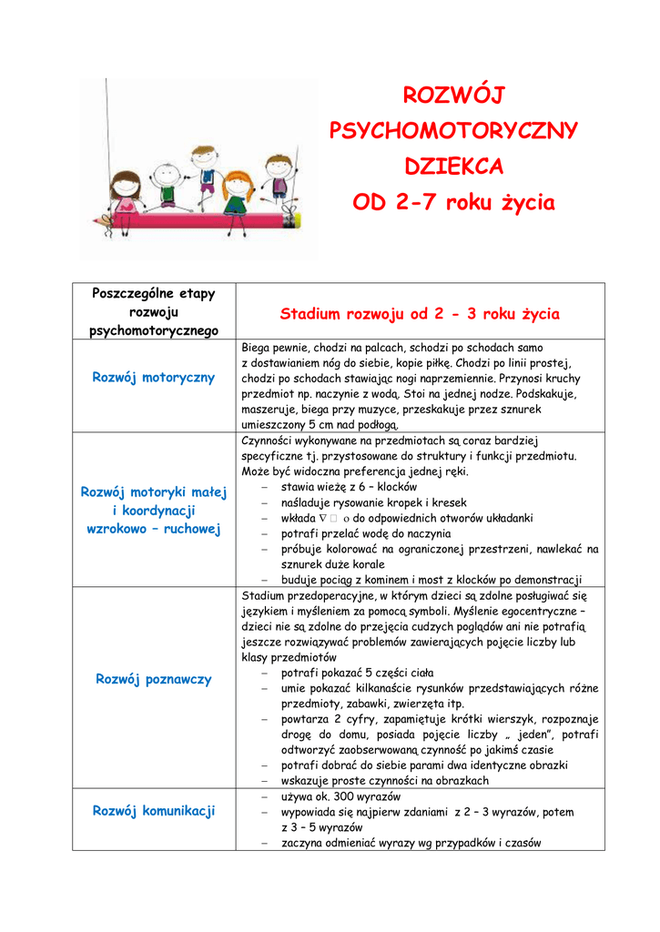 ROZWÓJ PSYCHOMOTORYCZNY DZIEKCA OD 2-7 roku życia Poszczególne etapy rozwoju psychomotorycznego Rozwój motoryczny Rozwój motoryki małej i koordynacji wzrokowo – ruchowej Rozwój poznawczy Rozwój komunikacji Stadium rozwoju od 2 - 3 roku życia Biega pewnie, chodzi na palcach, schodzi po schodach samo z dostawianiem nóg do siebie, kopie piłkę. Chodzi po linii prostej, chodzi po schodach stawiając nogi naprzemiennie. Przynosi kruchy przedmiot np. naczynie z wodą. Stoi na jednej nodze. Podskakuje, maszeruje, biega przy muzyce, przeskakuje przez sznurek umieszczony 5 cm nad podłogą. Czynności wykonywane na przedmiotach są coraz bardziej specyficzne tj. przystosowane do struktury i funkcji przedmiotu. Może być widoczna preferencja jednej ręki. stawia wieżę z 6 – klocków naśladuje rysowanie kropek i kresek wkłada do odpowiednich otworów układanki potrafi przelać wodę do naczynia próbuje kolorować na ograniczonej przestrzeni, nawlekać na sznurek duże korale buduje pociąg z kominem i most z klocków po demonstracji Stadium przedoperacyjne, w którym dzieci są zdolne posługiwać się językiem i myśleniem za pomocą symboli. Myślenie egocentryczne – dzieci nie są zdolne do przejęcia cudzych poglądów ani nie potrafią jeszcze rozwiązywać problemów zawierających pojęcie liczby lub klasy przedmiotów potrafi pokazać 5 części ciała umie pokazać kilkanaście rysunków przedstawiających różne przedmioty, zabawki, zwierzęta itp. powtarza 2 cyfry, zapamiętuje krótki wierszyk, rozpoznaje drogę do domu, posiada pojęcie liczby „ jeden”, potrafi odtworzyć zaobserwowaną czynność po jakimś czasie potrafi dobrać do siebie parami dwa identyczne obrazki wskazuje proste czynności na obrazkach używa ok. 300 wyrazów wypowiada się najpierw zdaniami z 2 – 3 wyrazów, potem z 3 – 5 wyrazów zaczyna odmieniać wyrazy wg przypadków i czasów mówi do siebie po imieniu potrafi powiedzieć krótki wierszyk, używa zaimka „ ja”, zadaje pytanie „co to jest?” zaczyna współdziałać w zabawie włącza się do zabawy z innymi dziećmi zaczyna bawić się w zabawy tematyczne mogą pojawiać się wzmożone zachowania agresywne w stosunku do innych dzieci wrażliwość na pochwały i nagany słowne zaczyna bawić się w role zaczyna bawić się z innymi dziećmi w małej grupie 2- 3 osób w kontaktach dorosłymi przejawia negatywizm i przekorę używa widelca rozwija cukierek pije przez słomkę je samodzielnie zdejmuje i nakłada proste części ubioru rozpina i zapina zamek błyskawiczny rozpina duże guziki Rozwój społeczny Rozwój samodzielności Poszczególne etapy rozwoju psychomotorycznego Stadium rozwoju od 3 – 4 roku życia Rozwój motoryczny Rozwój motoryki małej i koordynacji wzrokowo – ruchowej Rozwój poznawczy potrafi utrzymać równowagę, gdy stoi z zamkniętymi oczami z wykroku (palce jednej nogi dotykają pięty drugiej nogi) i na jednej nodze z otwartymi oczami kopie piłkę do celu wchodzi i schodzi ze schodów, stawiając nogi na przemian, nie trzymając się poręczy zeskakuje z najniższego stopnia schodów przeskakuje z rozbiegu przeszkodę 20 - 25 cm nad ziemią jeździ na sankach, trzykołowym rowerku (pod kontrolą dorosłego) zaczyna uczyć się np. pływać, jeździć na rowerze, łyżwach buduje dwu - trzywymiarowe budowle rysuje koło lepi z plasteliny np. wałeczek, kulkę posługuje się ręką dominującą potrafi nożycami ciąć papier odkręca nakrętki początek planowania swojego działania i nazywania swoich konstrukcji przed wykonaniem współpraca pomiędzy ręką dominującą a wspomagającą powtarza 3 cyfry i zdanie z 6 sylab – 12 sylab potrafi z pamięci powtórzyć krótkie opowiadanie składa obrazek rozcięty na 2 części, opisuje obrazek wymieniając znajdujące się na nim przedmioty rozumie układy słów zawierających określenie „ na, w, do, za, pod, nad, przed, naprzeciw, na wierzchu, na dole” Rozwój komunikacji Rozwój społeczny Rozwój samodzielności Poszczególne etapy rozwoju psychomotorycznego Rozwój motoryczny je, myje się, ubiera i rozbiera się samodzielnie, ale wymaga nadzoru i dyskretnej pomocy sprząta zabawki z pomocą próbuje zapinać guziki zdejmuje i wkłada rajstopy myje zęby pod nadzorem smaruje chleb np. masłem nalewa z dzbanka Stadium rozwoju od 4 – 5 roku życia Rozwój motoryki małej i koordynacji wzrokowo – ruchowej zlicza 4 przedmioty gromadzi przedmioty mając wybraną wspólną cechę spostrzega cechy nieistotne, mające wartość subiektywną uwaga mimowolna, nietrwała, mało podzielna, skupienie się na ok. 15 min. zajęcie grupowe komentuje wykonane czynności słownik od 1000 do 2000 słów zdanie złożone z wielu wyrazów, artykulacja może być jeszcze niewyraźna głównie reaguje na polecenia kierowane indywidualnie, słabo podporządkowuje się poleceniom adresowanym do całej grupy coraz lepiej współdziała w zabawie chwiejność uczuciowa często przeżywa różne lęki np. w sytuacji rozstania się z matką w obcym środowisku potrafi zrezygnować z własnej przyjemności na rzecz drugiego dziecka częsta postawa egoistyczna i egocentryczna lubi pomagać rodzicom w drobnych pracach domowych (np. przynoszeniu rzeczy, rozkładaniu nakryć na stole, ścieraniu kurzu) chodzi po równoważni wykonuje ok. pięciu podskoków jeden za drugim wspina się na drabinkę doskonali rzucanie i chwytanie piłki stoi na palcach kilka chwil zachowując równowagę posuwa się wzdłuż linii prostej ok. 5 m podskakując na jednej nodze (pięciolatek) idzie na palcach ok. 3 m (pięciolatek) biegnie po schodach do góry, bez trzymania się poręczy wykonuje elementarne ćwiczenia gimnastyczne i sportowe (łyżwy, narty, pływanie) potrafi stać na jednej nodze ok. 15 s. ( czterolatek) trafia piłką do celu z odległości 1 m, rzuca piłkę do kosza z odległości 2-3-5m, chwyta piłkę w locie buduje trójwymiarowe budowle z klocków (