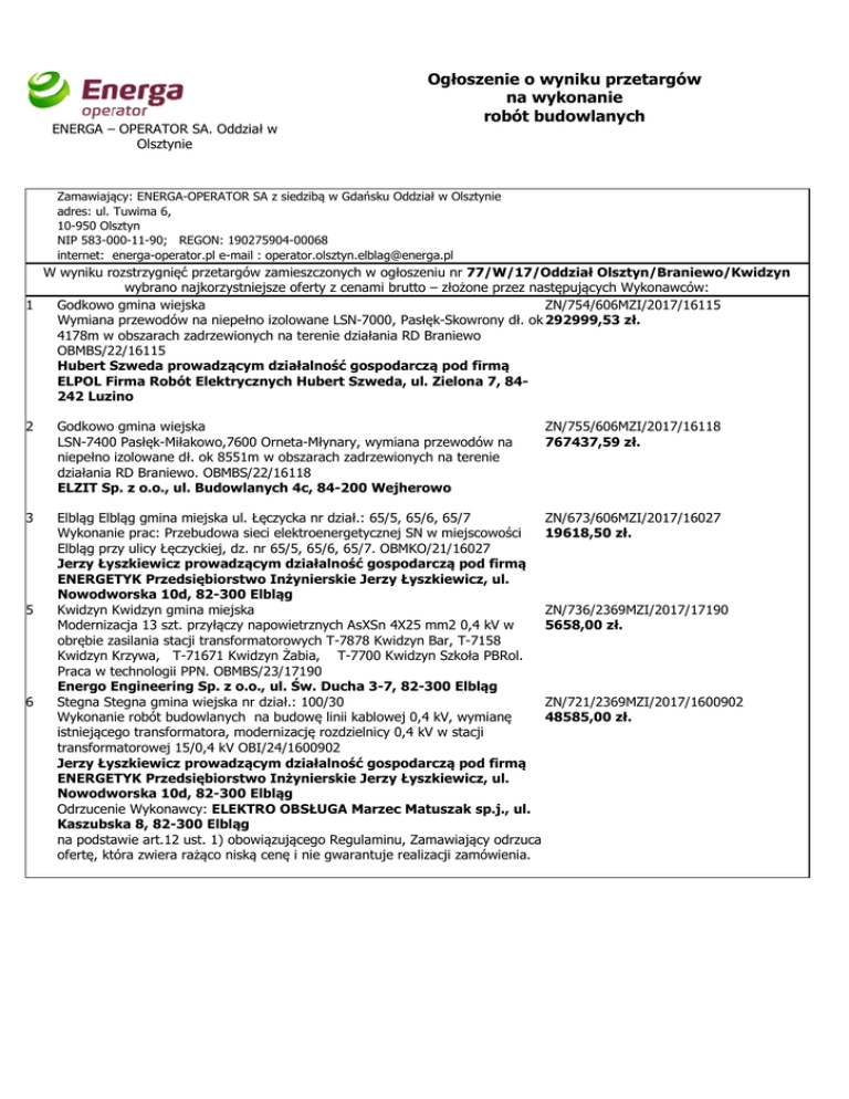 ENERGA – OPERATOR SA. Oddział w Olsztynie Ogłoszenie o wyniku przetargów na wykonanie robót budowlanych Zamawiający: ENERGA-OPERATOR SA z siedzibą w Gdańsku Oddział w Olsztynie adres: ul. Tuwima 6, 10-950 Olsztyn NIP 583-000-11-90; REGON: 190275904-00068 internet: energa-operator.pl e-mail : [email protected] W wyniku rozstrzygnięć przetargów zamieszczonych w ogłoszeniu nr 77/W/17/Oddział Olsztyn/Braniewo/Kwidzyn wybrano najkorzystniejsze oferty z cenami brutto – złożone przez następujących Wykonawców: 1 Godkowo gmina wiejska ZN/754/606MZI/2017/16115 Wymiana przewodów na niepełno izolowane LSN-7000, Pasłęk-Skowrony dł. ok 292999,53 zł. 4178m w obszarach zadrzewionych na terenie działania RD Braniewo OBMBS/22/16115 Hubert Szweda prowadzącym działalność gospodarczą pod firmą ELPOL Firma Robót Elektrycznych Hubert Szweda, ul. Zielona 7, 84242 Luzino 2 Godkowo gmina wiejska LSN-7400 Pasłęk-Miłakowo,7600 Orneta-Młynary, wymiana przewodów na niepełno izolowane dł. ok 8551m w obszarach zadrzewionych na terenie działania RD Braniewo. OBMBS/22/16118 ELZIT Sp. z o.o., ul. Budowlanych 4c, 84-200 Wejherowo 3 Elbląg Elbląg gmina miejska ul. Łęczycka nr dział.: 65/5, 65/6, 65/7 ZN/673/606MZI/2017/16027 Wykonanie prac: Przebudowa sieci elektroenergetycznej SN w miejscowości 19618,50 zł. Elbląg przy ulicy Łęczyckiej, dz. nr 65/5, 65/6, 65/7. OBMKO/21/16027 Jerzy Łyszkiewicz prowadzącym działalność gospodarczą pod firmą ENERGETYK Przedsiębiorstwo Inżynierskie Jerzy Łyszkiewicz, ul. Nowodworska 10d, 82-300 Elbląg Kwidzyn Kwidzyn gmina miejska ZN/736/2369MZI/2017/17190 Modernizacja 13 szt. przyłączy napowietrznych AsXSn 4X25 mm2 0,4 kV w 5658,00 zł. obrębie zasilania stacji transformatorowych T-7878 Kwidzyn Bar, T-7158 Kwidzyn Krzywa, T-71671 Kwidzyn Żabia, T-7700 Kwidzyn Szkoła PBRol. Praca w technologii PPN. OBMBS/23/17190 Energo Engineering Sp. z o.o., ul. Św. Ducha 3-7, 82-300 Elbląg Stegna Stegna gmina wiejska nr dział.: 100/30 ZN/721/2369MZI/2017/1600902 Wykonanie robót budowlanych na budowę linii kablowej 0,4 kV, wymianę 48585,00 zł. istniejącego transformatora, modernizację rozdzielnicy 0,4 kV w stacji transformatorowej 15/0,4 kV OBI/24/1600902 Jerzy Łyszkiewicz prowadzącym działalność gospodarczą pod firmą ENERGETYK Przedsiębiorstwo Inżynierskie Jerzy Łyszkiewicz, ul. Nowodworska 10d, 82-300 Elbląg Odrzucenie Wykonawcy: ELEKTRO OBSŁUGA Marzec Matuszak sp.j., ul. Kaszubska 8, 82-300 Elbląg na podstawie art.12 ust. 1) obowiązującego Regulaminu, Zamawiający odrzuca ofertę, która zwiera rażąco niską cenę i nie gwarantuje realizacji zamówienia. 5 6 ZN/755/606MZI/2017/16118 767437,59 zł. ENERGA – OPERATOR SA. Oddział w Olsztynie Ogłoszenie o wyniku przetargów na wykonanie robót budowlanych 7 Kapustowo Malbork gmina wiejska ZN/722/2369MZI/2017/17184 Modernizacja 12 szt. przyłączy w obrębie zasilania stacji transformatorowych T- 4708,44 zł. 5808 Kapustowo PGR, T-5802 Stogi Szkoła. Praca w technologii PPN OBMBS/24/17184 Marcin Berski, prowadzącym działalność gospodarczą pod firmą Marcin Berski, Rakowiska 38, 82-100 Nowy Dwór Gdański 8 Marzęcino Nowy Dwór Gdański obszar wiejski ZN/723/2369MZI/2017/17177 Modernizacja 19 szt. przewodów przyłączy napowietrznych w obrębie zasilania 7431,66 zł. stacji transformatorowych T-5535, T-5533 w m. Marzęcino. Praca w technologii PPN OBMBS/24/17177 Marcin Berski, prowadzącym działalność gospodarczą pod firmą Marcin Berski, Rakowiska 38, 82-100 Nowy Dwór Gdański Mikoszewo Stegna gmina wiejska nr dział.: 236/16 ZN/724/2369MZI/2017/1601116 Wykonanie robót budowlanych na budowę linii kablowej 0,4 kV. Praca w 6728,10 zł. technologii PPN OBI/24/1601116 Łukasz Ziniewicz, prowadzącym działalność gospodarczą pod firmą ELCAD Instalatorstwo Elektryczne Łukasz Ziniewicz, ul. Piękna 9, 82200 Malbork Kończewice Miłoradz gmina wiejska nr dział.: 139/9 ZN/725/2369MZI/2017/1601152 Wykonanie robót budowlanych na budowę przyłącza kablowego 0,4 kV, oraz 5879,40 zł. linii napowietrznej 0,4 kV OBI/24/1601152 Marcin Berski, prowadzącym działalność gospodarczą pod firmą Marcin Berski, Rakowiska 38, 82-100 Nowy Dwór Gdański Starocin Nowy Dwór Gdański obszar wiejski nr dział.: 133/1 ZN/726/2369MZI/2017/1601019 Wykonanie robót budowlanych na budowę przyłącza kablowego 0,4 kV. Praca 1955,70 zł. w technologii PPN OBI/24/1601019 Tomasz Gajewski, prowadzącym działalność gospodarczą pod firmą Przedsiębiorstwo Projektowo-Inwestycyjne "TG ELEKTRYK" Tomasz Gajewski, ul. 1 Maja 58/29, 82-300 Elbląg Szpitalna Wieś Sztum obszar wiejski 5 nr dział.: 176/7 ZN/727/2369MZI/2017/1601014 Wykonanie robót budowlanych na budowę przyłącza napowietrznego 0,4 kV. 516,60 zł. Praca w technologii PPN OBI/24/1601014 Dariusz Maślany, prowadzącym działalność gospodarcza pod firmą Dariusz Maślany, ul. Stanisława Patyry 17, 82-550 Prabuty Sadlinki Sadlinki gmina wiejska nr dział.: 165/4 ZN/728/2369MZI/2017/1601342 Budowa przyłącza kablowego 0,4 kV oraz zestawu złączowo-pomiarowego. 4637,10 zł. Praca w technologii PPN OBI/23/1601342 Andrzej Guzow, Tomasz Hołub będących wspólnikami spółki cywilnej ELEKTRO-KOMPLEKS SC Andrzej Guzow, Tomasz Hołub, ul. Sienkiewicza 57/c/2, 82-200 Malbork 9 10 11 12 13 Sporządził(a): Angelika Danielewska Olsztyn, dnia 23-02-2017 ......................................................................... / podpis /