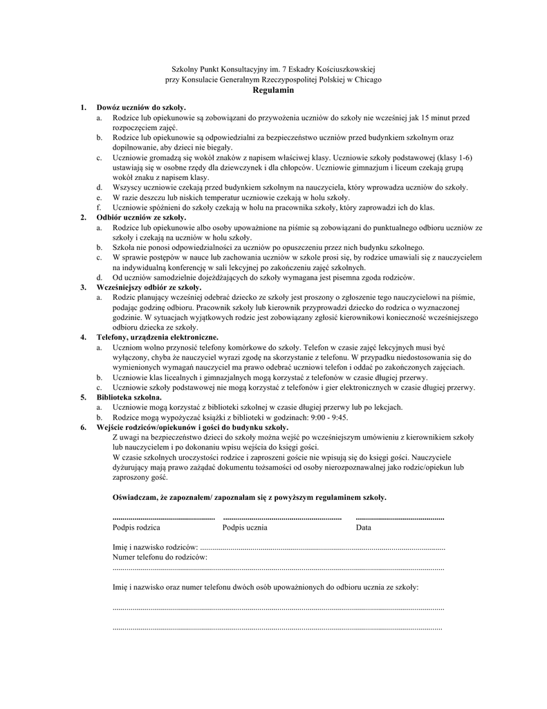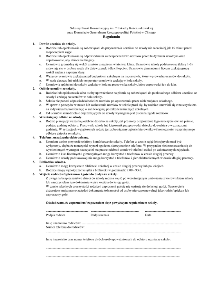 Szkolny Punkt Konsultacyjny im. 7 Eskadry Kościuszkowskiej przy Konsulacie Generalnym Rzeczypospolitej Polskiej w Chicago Regulamin 1. 2. 3. 4. 5. 6. Dowóz uczniów do szkoły. a. Rodzice lub opiekunowie są zobowiązani do przywożenia uczniów do szkoły nie wcześniej jak 15 minut przed rozpoczęciem zajęć. b. Rodzice lub opiekunowie są odpowiedzialni za bezpieczeństwo uczniów przed budynkiem szkolnym oraz dopilnowanie, aby dzieci nie biegały. c. Uczniowie gromadzą się wokół znaków z napisem właściwej klasy. Uczniowie szkoły podstawowej (klasy 1-6) ustawiają się w osobne rzędy dla dziewczynek i dla chłopców. Uczniowie gimnazjum i liceum czekają grupą wokół znaku z napisem klasy. d. Wszyscy uczniowie czekają przed budynkiem szkolnym na nauczyciela, który wprowadza uczniów do szkoły. e. W razie deszczu lub niskich temperatur uczniowie czekają w holu szkoły. f. Uczniowie spóźnieni do szkoły czekają w holu na pracownika szkoły, który zaprowadzi ich do klas. Odbiór uczniów ze szkoły. a. Rodzice lub opiekunowie albo osoby upoważnione na piśmie są zobowiązani do punktualnego odbioru uczniów ze szkoły i czekają na uczniów w holu szkoły. b. Szkoła nie ponosi odpowiedzialności za uczniów po opuszczeniu przez nich budynku szkolnego. c. W sprawie postępów w nauce lub zachowania uczniów w szkole prosi się, by rodzice umawiali się z nauczycielem na indywidualną konferencję w sali lekcyjnej po zakończeniu zajęć szkolnych. d. Od uczniów samodzielnie dojeżdżających do szkoły wymagana jest pisemna zgoda rodziców. Wcześniejszy odbiór ze szkoły. a. Rodzic planujący wcześniej odebrać dziecko ze szkoły jest proszony o zgłoszenie tego nauczycielowi na piśmie, podając godzinę odbioru. Pracownik szkoły lub kierownik przyprowadzi dziecko do rodzica o wyznaczonej godzinie. W sytuacjach wyjątkowych rodzic jest zobowiązany zgłosić kierownikowi konieczność wcześniejszego odbioru dziecka ze szkoły. Telefony, urządzenia elektroniczne. a. Uczniom wolno przynosić telefony komórkowe do szkoły. Telefon w czasie zajęć lekcyjnych musi być wyłączony, chyba że nauczyciel wyrazi zgodę na skorzystanie z telefonu. W przypadku niedostosowania się do wymienionych wymagań nauczyciel ma prawo odebrać uczniowi telefon i oddać po zakończonych zajęciach. b. Uczniowie klas licealnych i gimnazjalnych mogą korzystać z telefonów w czasie długiej przerwy. c. Uczniowie szkoły podstawowej nie mogą korzystać z telefonów i gier elektronicznych w czasie długiej przerwy. Biblioteka szkolna. a. Uczniowie mogą korzystać z biblioteki szkolnej w czasie długiej przerwy lub po lekcjach. b. Rodzice mogą wypożyczać książki z biblioteki w godzinach: 9:00 - 9:45. Wejście rodziców/opiekunów i gości do budynku szkoły. Z uwagi na bezpieczeństwo dzieci do szkoły można wejść po wcześniejszym umówieniu z kierownikiem szkoły lub nauczycielem i po dokonaniu wpisu wejścia do księgi gości. W czasie szkolnych uroczystości rodzice i zaproszeni goście nie wpisują się do księgi gości. Nauczyciele dyżurujący mają prawo zażądać dokumentu tożsamości od osoby nierozpoznawalnej jako rodzic/opiekun lub zaproszony gość. Oświadczam, że zapoznałem/ zapoznałam się z powyższym regulaminem szkoły. ................................................... ........................................................... Podpis rodzica Podpis ucznia ............................................ Data Imię i nazwisko rodziców: .......................................................................................................................... Numer telefonu do rodziców: ..................................................................................................................................................................... Imię i nazwisko oraz numer telefonu dwóch osób upoważnionych do odbioru ucznia ze szkoły: ..................................................................................................................................................................... ....................................................................................................................................................................