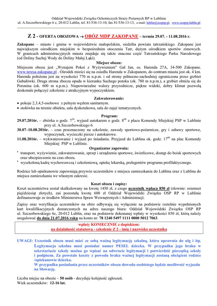 Oddział Wojewódzki Związku Ochotniczych Straży Pożarnych RP w Lublinie ul. A.Szczerbowskiego 6 c, 20-012 Lublin, tel. 81/536-13-10, fax 81/536-13-13, e-mail: [email protected], www.zosprp.lublin.pl Z 2 - OFERTA OBOZOWA OBÓZ MDP ZAKOPANE – termin 29.07. - 11.08.2016 r. Zakopane – miasto i gmina w województwie małopolskim, siedziba powiatu tatrzańskiego. Zakopane jest największym ośrodkiem miejskim w bezpośrednim otoczeniu Tatr, dużym ośrodkiem sportów zimowych. W granicach administracyjnych miasta znajduje się także znaczna część Tatrzańskiego Parku Narodowego (od Doliny Suchej Wody do Doliny Małej Łąki). Miejsce obozu: Miejscem obozu jest „Wynajem Pokoi z Wyżywieniem” Gał Jan, os. Harenda 27A, 34-500 Zakopane. www.teresa-zakopane.pl . Ośrodek mieści się na osiedlu Harenda w Zakopanem, do centrum miasta jest ok. 4 km. Harenda położona jest na wysokości 770 m n.p.m. i od strony północno-zachodniej ograniczona przez grzbiet Gubałówki. Druga strona zbocza opada w kierunku Suchego potoku (ok. 780 m n.p.m.), a grzbiet obniża się do Poronina (ok. 600 m n.p.m.). Niepowtarzalne walory przyrodnicze, piękne widoki, dobry klimat pozwolą doskonale połączyć szkolenie z atrakcyjnym wypoczynkiem. Zakwaterowanie: pokoje 2,3,4,5-osobowe z pełnym węzłem sanitarnym. stołówka na terenie obiektu, sala dyskotekowa, sala do zajęć tematycznych. Program: 29.07.2016r. – zbiórka o godz. 730, wyjazd autokarem o godz. 800 z placu Komendy Miejskiej PSP w Lublinie przy ul. A.Szczerbowskiego 6. 30.07–10.08.2016r. – czas przeznaczony na szkolenie, zawody sportowo-pożarnicze, gry i zabawy sportowe, wypoczynek, wycieczki piesze i autokarowe. 11.08.2016r. – wykwaterowanie i wyjazd po śniadaniu. Przyjazd do Lublina ok. godz. 1700 na plac Komendy Miejskiej PSP w Lublinie. Organizator zapewnia: transport, wyżywienie, zakwaterowanie, sprzęt i urządzenia sportowe, świetlicowe, dostęp do boisk sportowych oraz ubezpieczenie na czas obozu. wyszkoloną kadrę wychowawczą i szkoleniową, opiekę lekarską, prelegentów programu profilaktycznego. Rodzice lub opiekunowie zapewniają przywóz uczestników z miejsca zamieszkania do Lublina oraz z Lublina do miejsca zamieszkania we własnym zakresie. Koszt obozu i zapisy: Koszt uczestnictwa został skalkulowany na kwotę 1450 zł, z czego uczestnik wpłaca 850 zł (słownie: osiemset pięćdziesiąt złotych), zaś pozostałą kwotę 600 zł Oddział Wojewódzki Związku OSP RP w Lublinie dofinansowuje ze środków Ministerstwa Spraw Wewnętrznych i Administracji. Zapisy oraz weryfikacja uczestników na obóz odbywają się wyłącznie na podstawie rzetelnie wypełnionych kart kwalifikacyjnych dostarczonych na adres naszego biura: Oddział Wojewódzki Związku OSP RP ul. Szczerbowskiego 6c, 20-012 Lublin, oraz na podstawie dokonanej wpłaty w wysokości 850 zł, którą należy uregulować do dnia 21.07.2016 roku na konto nr: 78 1240 5497 1111 0000 5012 7063. wpłaty KONIECZNIE z dopiskiem: na działalność statutową - szkolenie Z 2 - imię i nazwisko uczestnika UWAGI: Uczestnik obozu musi mieć ze sobą ważną legitymację szkolną, która uprawnia do ulg i itp. Legitymacja szkolna musi posiadać numer PESEL dziecka. W przypadku jego braku w sekretariacie szkoły można go wpisać na odwrocie legitymacji i potwierdzić pieczątką szkoły i podpisem. Za powstałe koszty z powodu braku ważnej legitymacji zostaną obciążeni rodzice /opiekunowie dziecka. W przypadku posiadania przez uczestników obozu dowodu osobistego będzie możliwość wyjazdu na Słowację. Liczba miejsc na obozie – 50 osób - decyduje kolejność zgłoszeń. Wiek uczestników: 12-16 lat.