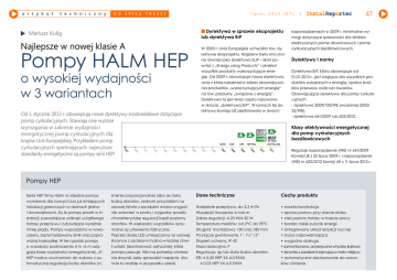 a r t y k u ł t e c h n i c z n y d o s p i s u lipiec 2013 (07) t r e ś c i Mariusz Kulig Najlepsze w nowej klasie A Pompy HALM HEP o wysokiej wydajności w 3 wariantach Od 1 stycznia 2013 r. obowiązują nowe dyrektywy środowiskowe dotyczące pomp cyrkulacyjnych. Stawiają one wyższe wymagania w zakresie wydajności energetycznej pomp cyrkulacyjnych dla krajów Unii Europejskiej. Przykładem pomp cyrkulacyjnych spełniających najwyższe standardy energetyczne są pompy serii HEP. Dyrektywa w sprawie ekoprojektu lub dyrektywa ErP W 2005 r. Unia Europejska uchwaliła tzw. dyrektywę ekoprojektu. Najpierw była ona znana również jako dyrektywa EuP – skrót powstał z „Energy using Products“ i określał wszystkie produkty wykorzystujące energię. Od 2009 r. obowiązuje nowa dyrektywa, wraz z którą rozszerzono zakres obowiązywania produktów „wykorzystujących energię“ na tzw. produkty „związane z energią”. Dyrektywa ta jest teraz często nazywana w skrócie „dyrektywą ErP”. W ramach tej dyrektywy komisja UE zdefiniowała w dwóch rozporządzeniach w 2009 r. minimalne wymogi dotyczące sprawności dla silników elektrycznych pomp dławicowych i pomp cyrkulacyjnych bezdławicowych. Dyrektywy i normy Dyrektywa ErP, która obowiązuje od 01.01.2013 r., jest wiążąca dla wszystkich produktów związanych z energią, oprócz środków przewozu osób lub towarów. Obowiązujące dyrektywy dla pomp cyrkulacyjnych: - dyrektywa 2009/125/WE (wcześniej 2005/ 32/WE), - dyrektywa 641/2009 lub 622/2012. Klasy efektywności energetycznej dla pomp cyrkulacyjnych bezdławicowych Reguluje rozporządzenie (WE) nr 641/2009 Komisji UE z 22 lipca 2009 r. i rozporządzenie (WE) nr 622/2012 Komisji UE z 11 lipca 2012 r. Pompy HEP Seria HEP firmy Halm to idealne pompy wymienne dla nowych lub już istniejących instalacji grzewczych w domach jednoi dwurodzinnych. Są to pompy proste w instalacji, pozwalające uniknąć uciążliwego hałasu przepływu i zużywające wyraźnie mniej prądu. Pompy wyposażono w nowoczesny, zoptymalizowany silnik oraz poprawioną hydraulikę. W ten sposób pompy o wysokości podnoszenia 4 m i 6 m osiągają klasę wydajności energetycznej „A“. HEP można uruchamiać do wyboru z automatyczną regulacją liczby obrotów (ci- śnienie proporcjonalne) albo ze stałą liczbą obrotów. Jednym przyciskiem na osiowej listwie z zaciskami można wygodnie ustawiać w prosty i wygodny sposób charakterystykę regulacji bądź poziomy obrotów. W większości wypadków optymalne są ustawienia fabryczne. Poprzez diodę LED umieszczoną na osiowej skrzynce z zaciskami można w każdej chwili ustalić (skontrolować optycznie), która pompa pracuje. Nie ma potrzeby otwierania skrzynki, żeby sprawdzić napięcie. Ułatwia to analizę w przypadku usterki. 47 Dane techniczne Cechy produktu Natężenie przepływu: do 3,2 m³/h Wysokość tłoczenia: 4 m/6 m Zakres regulacji: 4-23 W/4-50 W Temperatura mediów: od 2°C do 95°C Długość montażowa: 130 oraz 180 mm Przyłącze gwintowane: 1”, 1½” i 2” Stopień ochrony: IP 42 Klasa izolacyjna: F Regulacja: ∆p lub stała liczba obrotów EEI: ≤ 0,20 HEP XX-4.0 EXXX ≤ 0,23 HEP XX-6.0 EXXX • zwarta konstrukcja • ręczna pomoc przy starcie silnika • niski poziom hałasu w trakcie pracy • bardzo niskie zużycie energii • zintegrowany układ redukcji nocnej • śruba odpowietrzająca • wygodna obsługa • zamontowana, przykręcana wtyczka kątowa • skrzynka z zaciskami zajmująca mało miejsca • automatyczne dostosowanie do warunków ciśnienia t e c h n i c z n y d o s p i s u t r e ś c i obowiązywały od 2020 r. również dla wymiaOd stycznia 2013 r. została ustalona dla ny zintegrowanych pomp w istniejących gepomp cyrkulacyjnych bezdławicowych, któneratorach ciepła. re montowane są poza generatorem ciepła Wytyczne dotyczą wszystkich pomp cyrku(pompy zewnętrzne), wartość graniczna lacyjnych bezdławicowych w instalacjach współczynnika efektywności energetycznej generujących ciepło lub urządzeniach kli(EEI) na poziomie 0,27. Dotychczas podane klasy efektywności ener- matyzacyjnych. Wyjątek stanowią pompy cyrkulacyjne wody pitnej. getycznej już nie obowiązują, pompy są zazwyczaj lepsze niż minimalne wymogi ówczesnej Indeks efektywności Wartością referencyjną klasy A. energetycznej (EEI) Dlatego klasy efektywnodla najbardziej wydajnych ści energetycznej są usuEfektywność energetyczpomp cyrkulacyjnych jest wane i zastępuje je nana pomp ciepła klasyfiEEI ≤ 0,20. druk EEI na pompie. kowana jest metodą pomiarową. Pobór mocy Od sierpnia 2015 r. warpomp ciepła mierzony jest w czterech różtość graniczna EEI zostanie raz jeszcze nych punktach pracy zgodnie z profilem obobniżona do 0,23 i będzie obowiązywaciążenia. Ponieważ dla wielu urządzeń chała również dla pomp cyrkulacyjnych bezrakterystyka regulacyjna ze zmienną Δp jest dławicowych, które np. są montowane korzystna, krzywa nastawności służy jako w nowo zainstalowanych generatorach ciewartość referencyjna. pła lub stacjach solarnych (pompy zinteOdchylenia od krzywej nastawności prowagrowane). dzą do wyższych parametrów energetyczW ostatnim etapie realizacji wytyczne będą 48 lipiec 2013 (07) nych. Ustalone pobory mocy w czterech punktach pracy są uśredniane z udziałem czasu z profilu obciążenia. Tak wyliczony średni pobór mocy pompy ustawiany jest odpowiednio do typowego poboru mocy porównywalnych pomp cyrkulacyjnych ciepła z taką samą mocą hydrauliczną. Powstaje tzw. moc referencyjna, która ustalana jest na podstawie pomiarów wielu standardowych pomp. Wynikiem pomiarów jest wskaźnik efektywności energetycznej (EEI). Czym mniejszy EEI, tym mniej energii elektrycznej zużywa pompa i tym lepsza klasyfikacja energetyczna. Gdzie obowiązuje ErP? W poniższych krajach i na poniższych terytoriach obowiązuje dyrektywa w sprawie ekoprojektu ErP: Belgia, Niemc
