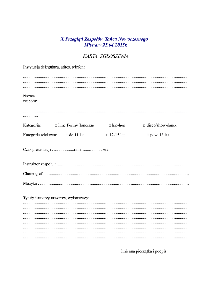 X Przegląd Zespołów Tańca Nowoczesnego Młynary 25.04.2015r. KARTA ZGŁOSZENIA Instytucja delegująca, adres, telefon: ............................................................................................................................................................. ............................................................................................................................................................. ............................................................................................................................................................. ............................................................................................................................................................. Nazwa zespołu: ............................................................................................................................................... ............................................................................................................................................................. ............................................................................................................................................................. .............. Kategoria: □ Inne Formy Taneczne Kategoria wiekowa: □ do 11 lat □ hip-hop □ 12-15 lat □ disco/show-dance □ pow. 15 lat Czas prezentacji : ...................min. ...................sek. Instruktor zespołu : ............................................................................................................................. Choreograf: ......................................................................................................................................... Muzyka : ............................................................................................................................................. Tytuły i autorzy utworów, wykonawcy: ............................................................................................. ............................................................................................................................................................. ............................................................................................................................................................. ............................................................................................................................................................. ............................................................................................................................................................. ............................................................................................................................................................. ............................................................................................................................................................. ............................................................................................................................................................. ............................................................................................................................................................. Imienna pieczątka i podpis: