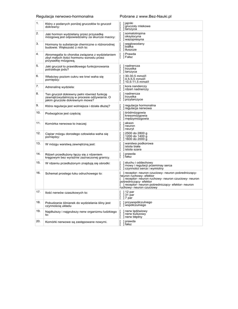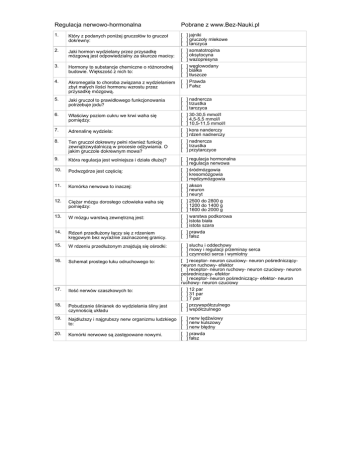 Regulacja nerwowo-hormonalna Pobrane z www.Bez-Nauki.pl 1. Który z podanych poniżej gruczołów to gruczoł dokrewny: 2. Jaki hormon wydzielany przez przysadkę mózgową jest odpowiedzialny za skurcze macicy: 3. Hormony to substancje chemiczne o różnorodnej budowie. Większość z nich to: 4. Akromegalia to choroba związana z wydzielaniem zbyt małych ilości hormonu wzrostu przez przysadkę mózgową. [ [ [ [ [ [ [ [ [ [ [ ] jajniki ] gruczoły mlekowe ] tarczyca ] somatotropina ] oksytocyna ] wazopresyna ] węglowodany ] białka ] tłuszcze ] Prawda ] Fałsz 5. Jaki gruczoł to prawidłowego funkcjonowania potrzebuje jodu? 6. Właściwy poziom cukru we krwi waha się pomiędzy: 7. Adrenalinę wydziela: 8. Ten gruczoł dokrewny pełni również funkcję zewnątrzwydalniczą w procesie odżywiania. O jakim gruczole dokrewnym mowa? [ [ [ [ [ [ [ [ [ [ [ ] nadnercza ] trzustka ] tarczyca ] 30-30,5 mmol/l ] 4,5-5,5 mmol/l ] 10,5-11,5 mmol/l ] kora nanderczy ] rdzeń nadnerczy ] nadnercza ] trzustka ] przytarczyce 9. Która regulacja jest wolniejsza i działa dłużej? 10. Podwzgórze jest częścią: 11. Komórka nerwowa to inaczej: 12. Ciężar mózgu dorosłego człowieka waha się pomiędzy: 13. W mózgu warstwą zewnętrzną jest: 14. Rdzeń przedłużony łączy się z rdzeniem kręgowym bez wyraźnie zaznaczonej granicy. [ [ [ [ [ [ [ [ [ [ [ [ [ [ [ [ ] regulacja hormonalna ] regulacja nerwowa ] śródmózgowia ] kresomózgowia ] mędzymózgowia ] akson ] neuron ] neuryt ] 2500 do 2800 g ] 1200 do 1400 g ] 1600 do 2000 g ] warstwa podkorowa ] istota biała ] istota szara ] prawda ] fałsz 15. W rdzeniu przedłużonym znajdują się ośrodki: 16. Schemat prostego łuku odruchowego to: 17. Ilość nerwów czaszkowych to: 18. Pobudzanie ślinianek do wydzielania śliny jest czynnością układu 19. Najdłuższy i najgrubszy nerw organizmu ludzkiego [ ] nerw lędźwiowy [ ] nerw kulszowy to: [ ] nerw błędny [ ] prawda Komórki nerwowe są zastępowane nowymi. [ ] fałsz 20. [ ] słuchu i oddechowy [ ] mowy i regulacji przeminay serca [ ] czynności serca i wymiotny [ ] receptor- neuron czuciowy- neuron pośredniczącyneuron ruchowy- efektor [ ] receptor- neuron ruchowy- neuron czuciowy- neuron pośredniczący- efektor [ ] receptor- neuron pośredniczący- efektor- neuron ruchowy- neuron czuciowy [ ] 12 par [ ] 31 par [ ] 7 par [ ] przywspółczulnego [ ] współczulnego Poprawne odpowiedzi 1. 3. 5. 7. 9. 11. 13. 15. tarczyca białka tarczyca rdzeń nadnerczy regulacja hormonalna neuron istota szara czynności serca i wymiotny 2. 4. 6. 8. 10. 12. 14. 16. 17. 19. 12 par nerw kulszowy 18. 20. oksytocyna Fałsz 4,5-5,5 mmol/l trzustka mędzymózgowia 1200 do 1400 g prawda receptor- neuron czuciowy- neuron pośredniczącyneuron ruchowy- efektor współczulnego fałsz
